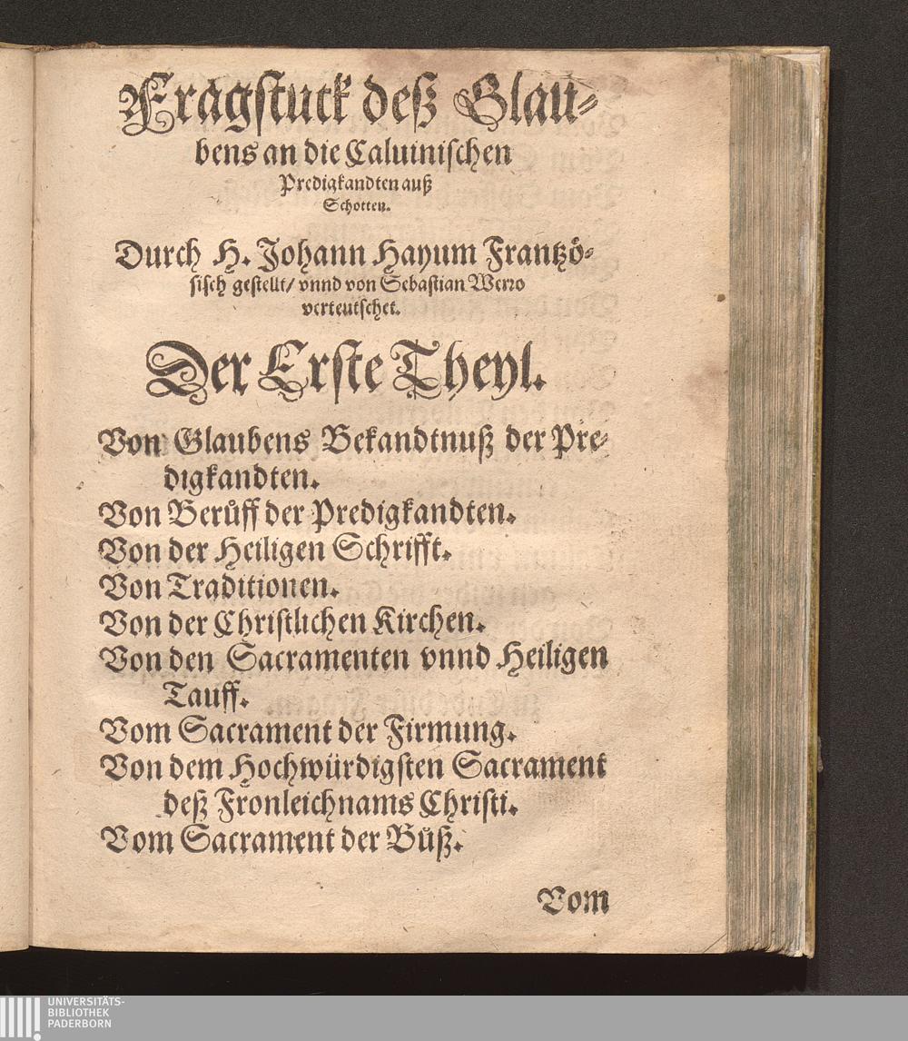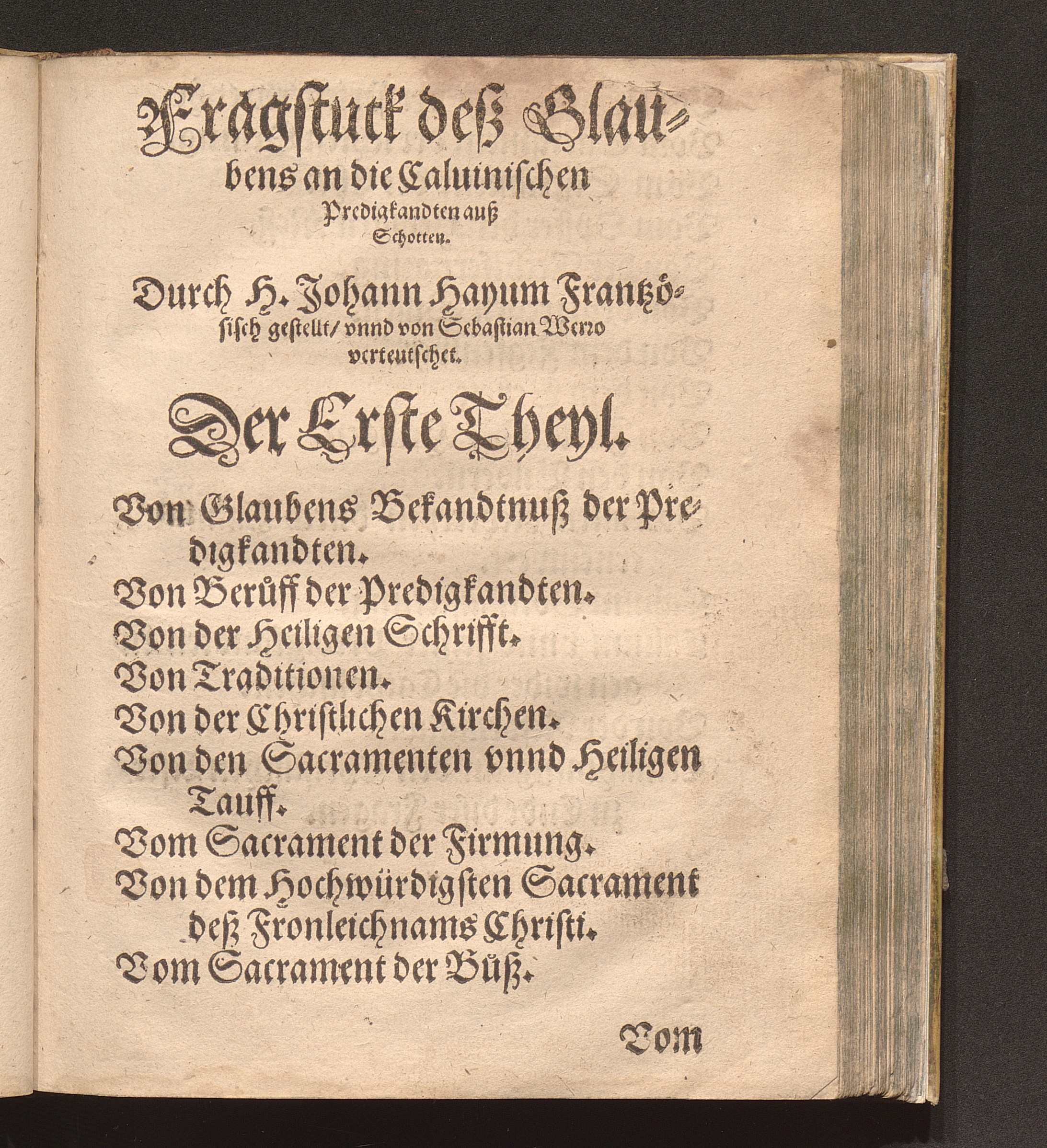 Fragstück Des Christlichen Glaubens/ an die neuwe Sectische Predigkandten / Erstlich Durch den Hochgelehrten H. Johann Hayum auß Schotten/ der Societet Jesu Theologum Frantzösisch beschriben/ demnach Durch Sebastian Werro Pfarrherrn zu Freyburg in Vchtland/ in das Teutsch gebracht/ vnd mit angehencktem Andern Theyl gemehret
