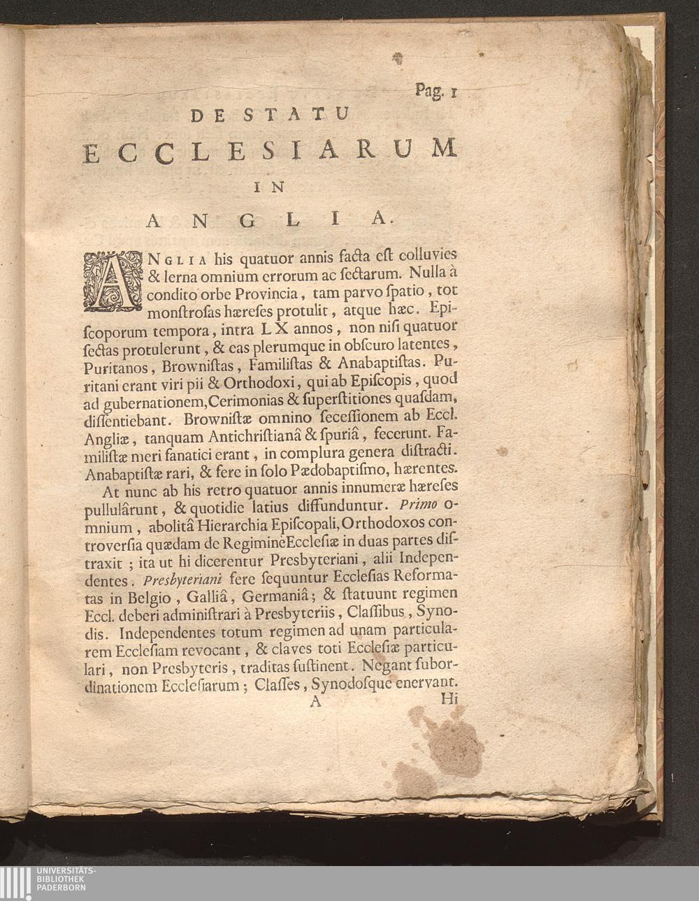 De Statu Ecclesiarum In Anglia.