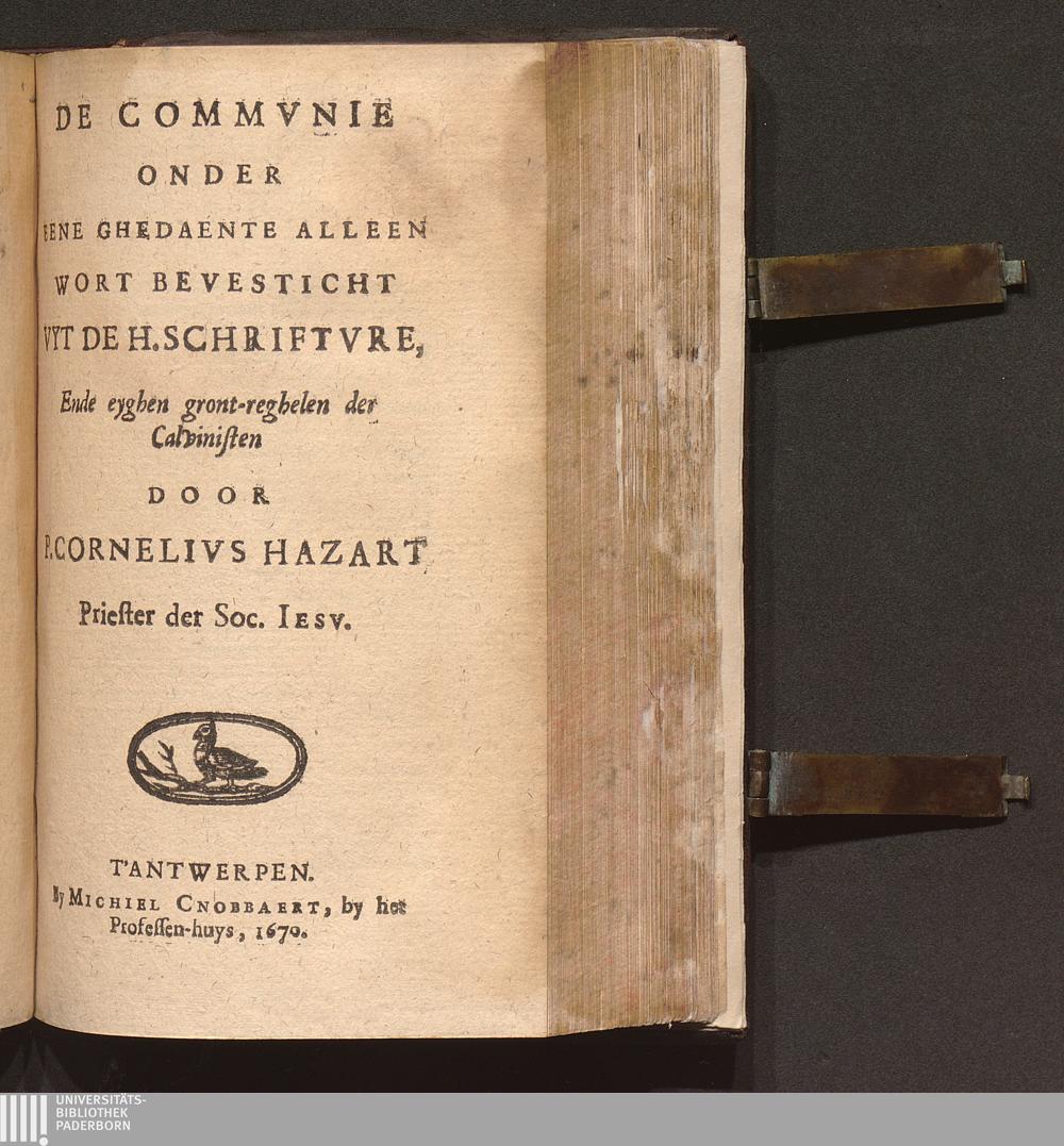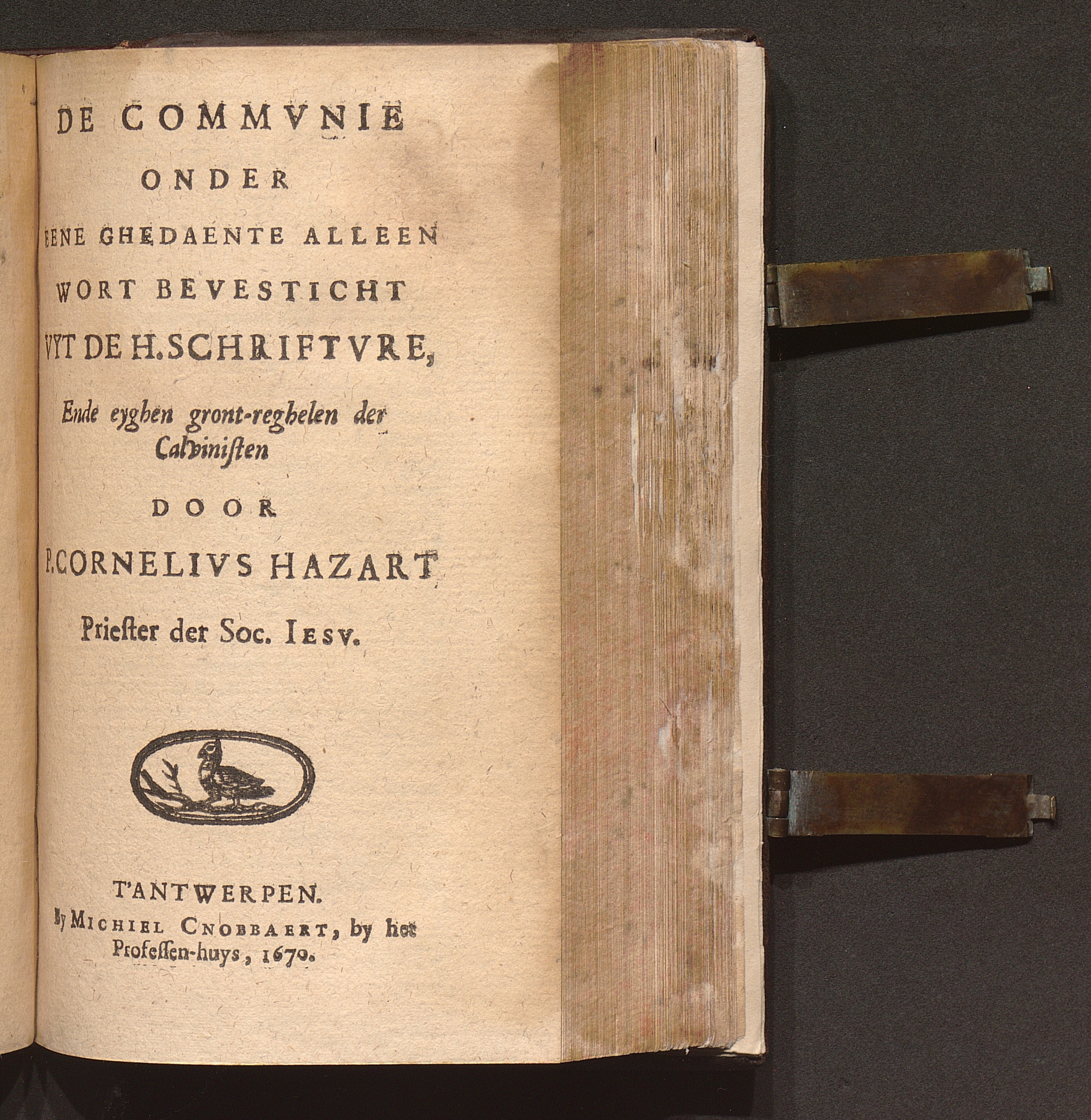 De Commvnie Onder Eene Ghedaente Alleen Wort Bevesticht Vyt De H. Schriftvre, Ende eyghen gront-reghelen der Calvinisten / Door P. Cornelivs Hazart Priester der Soc. Iesv