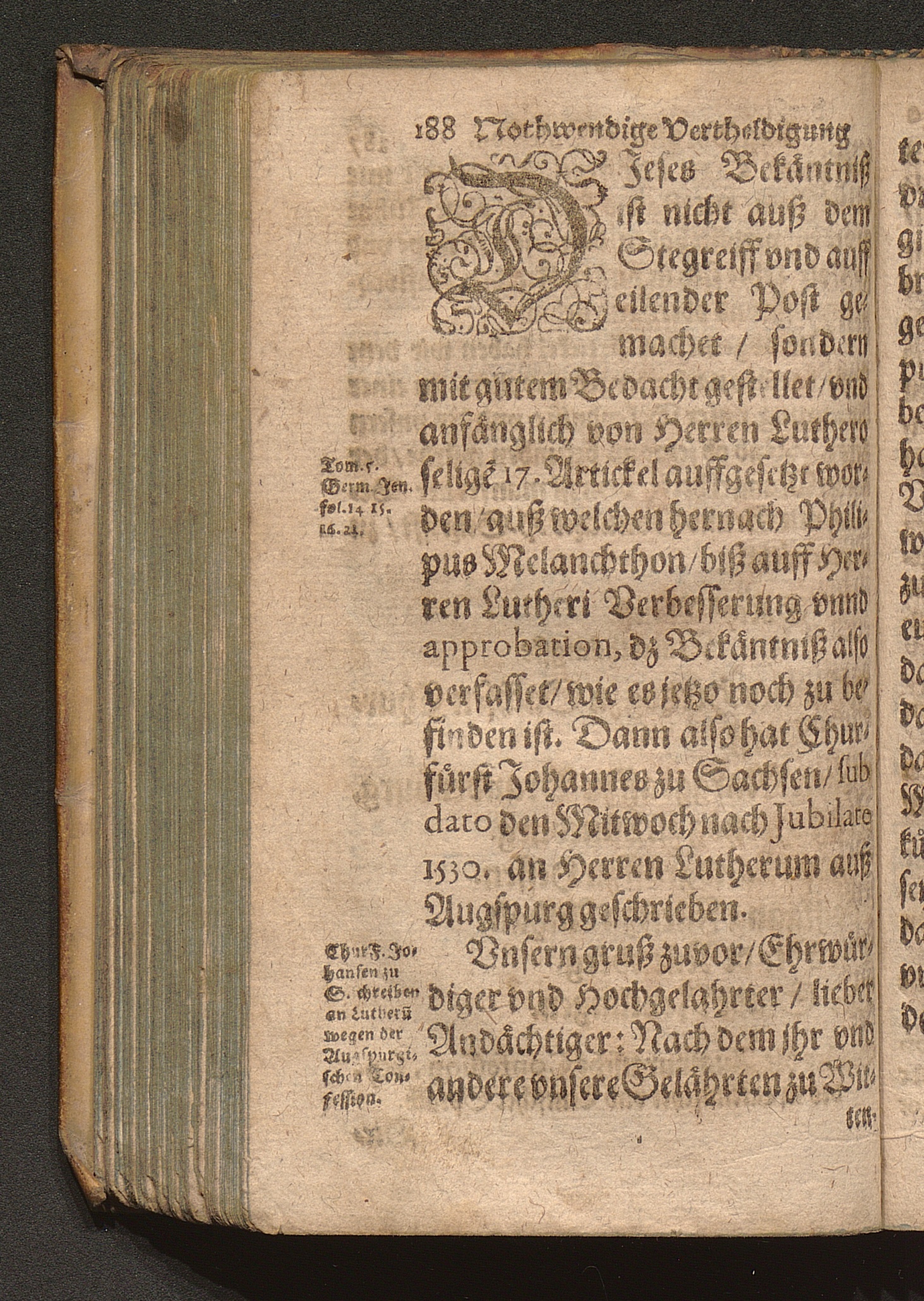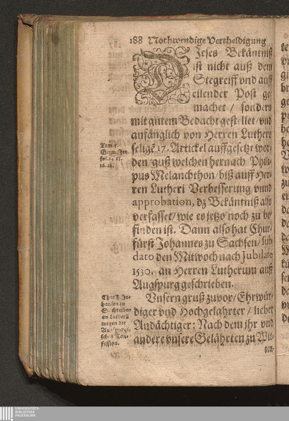 Notwendige Vertheidigung/ Des heiligen Römischen Reichs Evangelischer ChurFürsten vnd Ständte AugApffels : Nemblich der Wahren/ reinen/ vngeänderten/ Käyser Carln dem Fünfften Hochlöblichster Gedechtniß/ Anno 1530 vbergebenen Augspurgischen Confession, vnd des auff dieselbe gerichteten hochverpoenten ReligionFrieds ... ; Erstlich gedruckt zu Leypzig. M.DC.XXIX. / Auff sonderbahren ... Befelch ... Herrn Johann Georgens/ Hertzogen zu Sachsen ... Verfasset ... Durch Höchstgedachter Jh. Churfürstl. Durchl. hierzu verordnete Theologen [i. e. Matthias Hoë von Hoënegg]