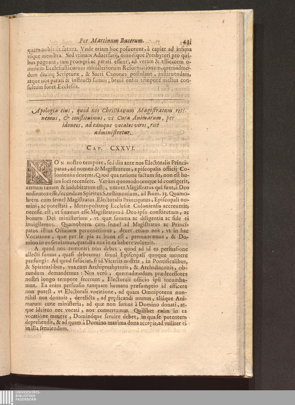 Constans Defensio, Ex S. Scriptvra, Et Vera Catholica Doctrina, Atqve Observatione Vniuersalis Christianæ Ecclesiæ Deliberationis de Christiana Reformatione : Quam Reuerendißimus in Deo Pater, Princeps & Dominus D. Hermannvs Archiepiscopus Coloniensis, & Princeps Elector, &c. iam antè publicauit ... / Auctore D. Martino Bvcero