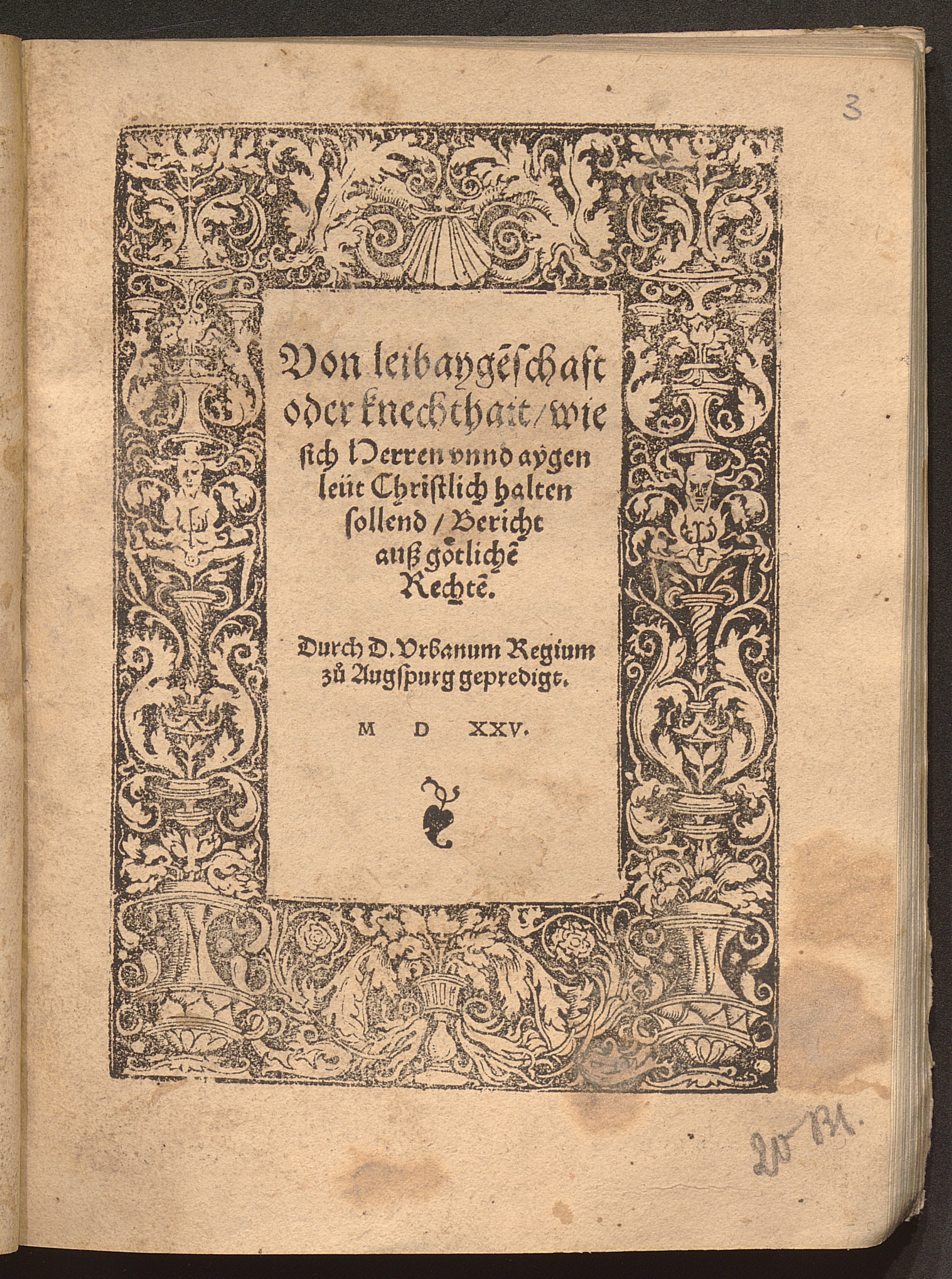 Von leibayge[n]schaft oder knechthait/ wie sich Herren vnnd aygen leüt Christlich halten sollend/ Bericht auß götliche[n] Rechte[n] / Durch D. Vrbanum Regium zů Augspurg gepredigt