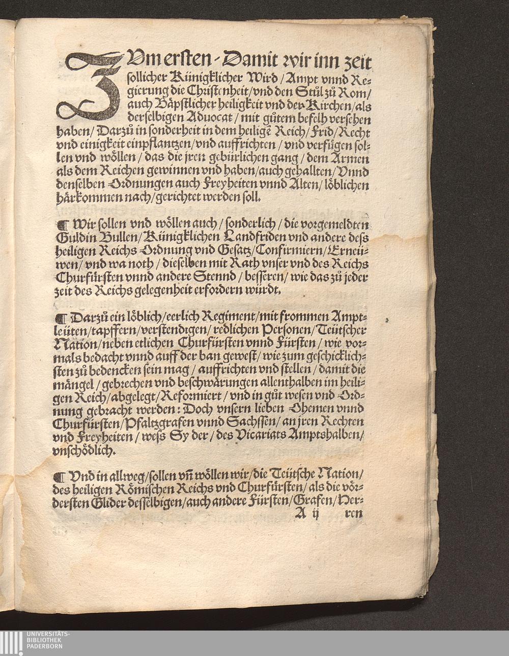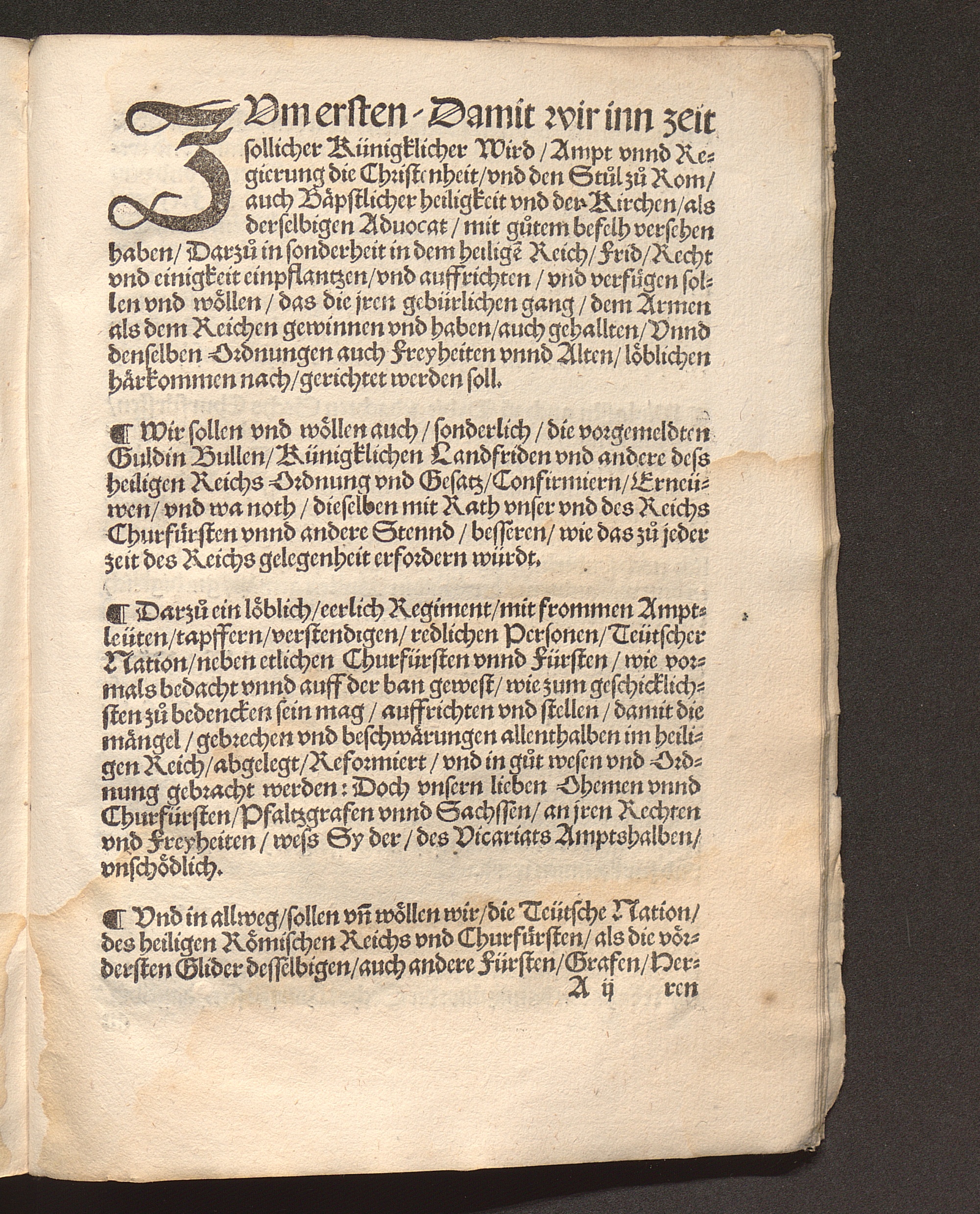 Dje Verschreibung/ vnd Verwilligung/ des aller Durchleüchtigisten/ großmechtigisten Herrn/ Herrn Carle/ Romischer vnd Hispanischer Künig/ [&]c. gegen dem Hayligen Reich : Geben/ am Dritten tag/ des Monats Iulij, ... Fünffzehenhundert/ vn[d] im Neünzehenden ...