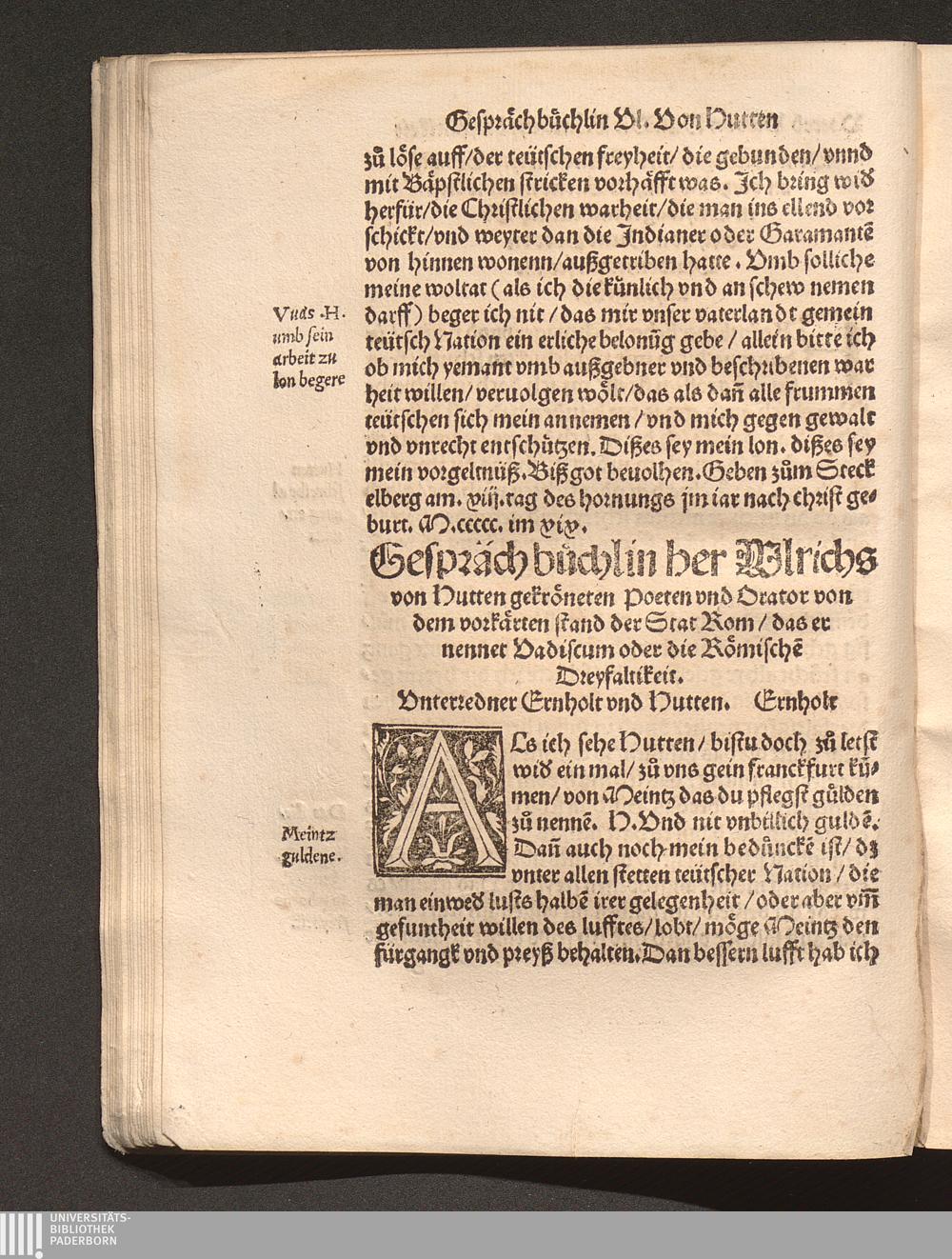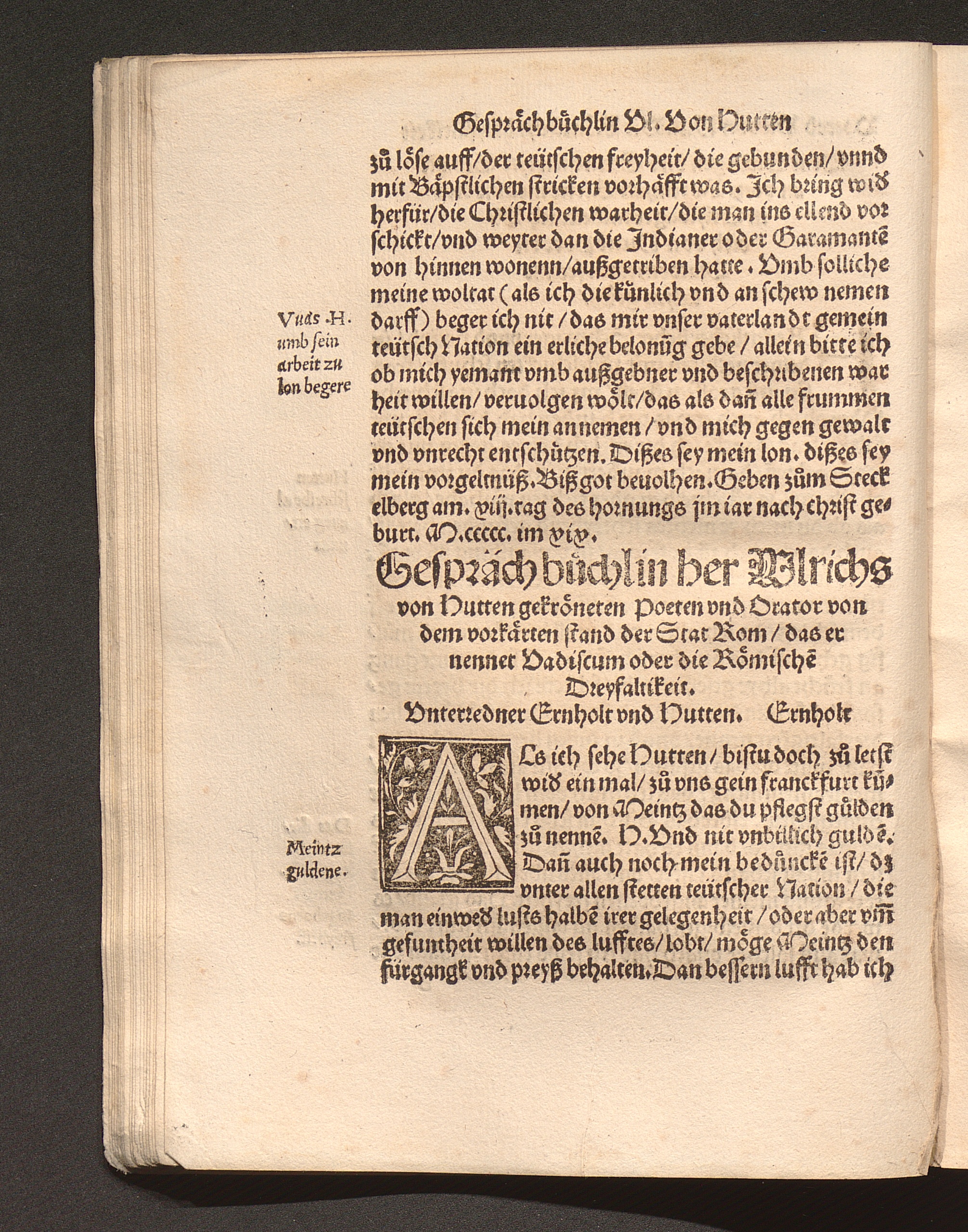 Gespräch büchlin her Ulrichs von Hutten gekröneten Poeten vnd Orator von dem vorkärten stand der Stat Rom/ das er nennet Vadiscum oder die Römische[n] Dreyfaltikeit.