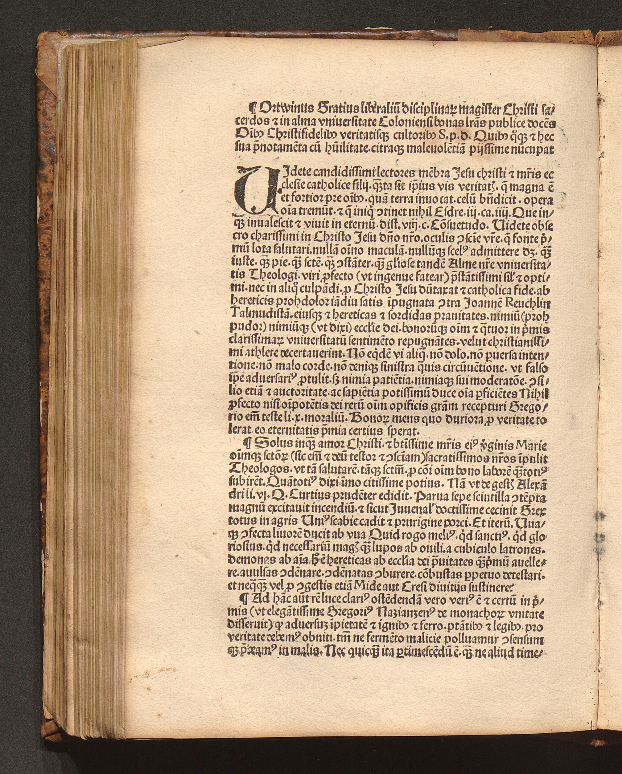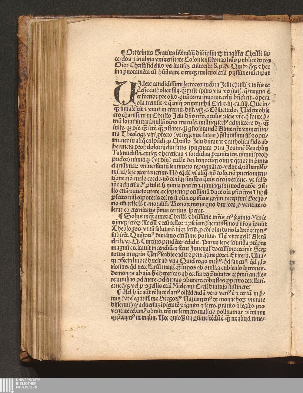 HOc in opuscu||lo. co[n]tra Speculu[m] oculare Jo=||annis Reuchlin Phorce[n]sis. hec in fidei et ecclesie || tuitionem continentur : Prenotamenta Ortwini Gratij libaralu[m] disciplina[rum] p[ro]/||fessoris citra o[mn]em maleuolentia[m] cu[n]ct[is] christifidelib[us] dedicata || Historica [et] vera enarratio Juridici [pro]cessus habiti in Ma/||gu[n]tia [con]tra libellu[m] eiusde[m]. hereticas sapiente[m] prauitates. || Decisiones quatuor vniuersitatu[m] de speculo eiusde[m] oculari || ab ecclesia dei tollendo. || Heretici ex eode[m] libello articuli vt Christiani o[mn]es male eum || scripsisse luce clarius dijudicent. || Sententia [con]de[m]natiua. q[uam] iuste. legitime [et] catholice Spe/||culum oculare sit co[m]bustum.