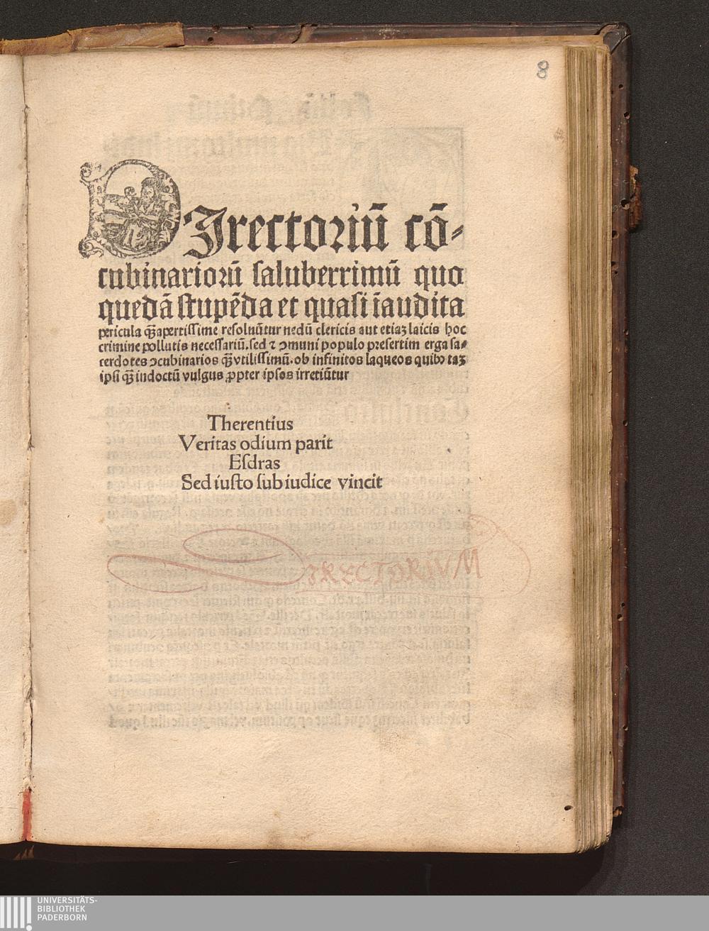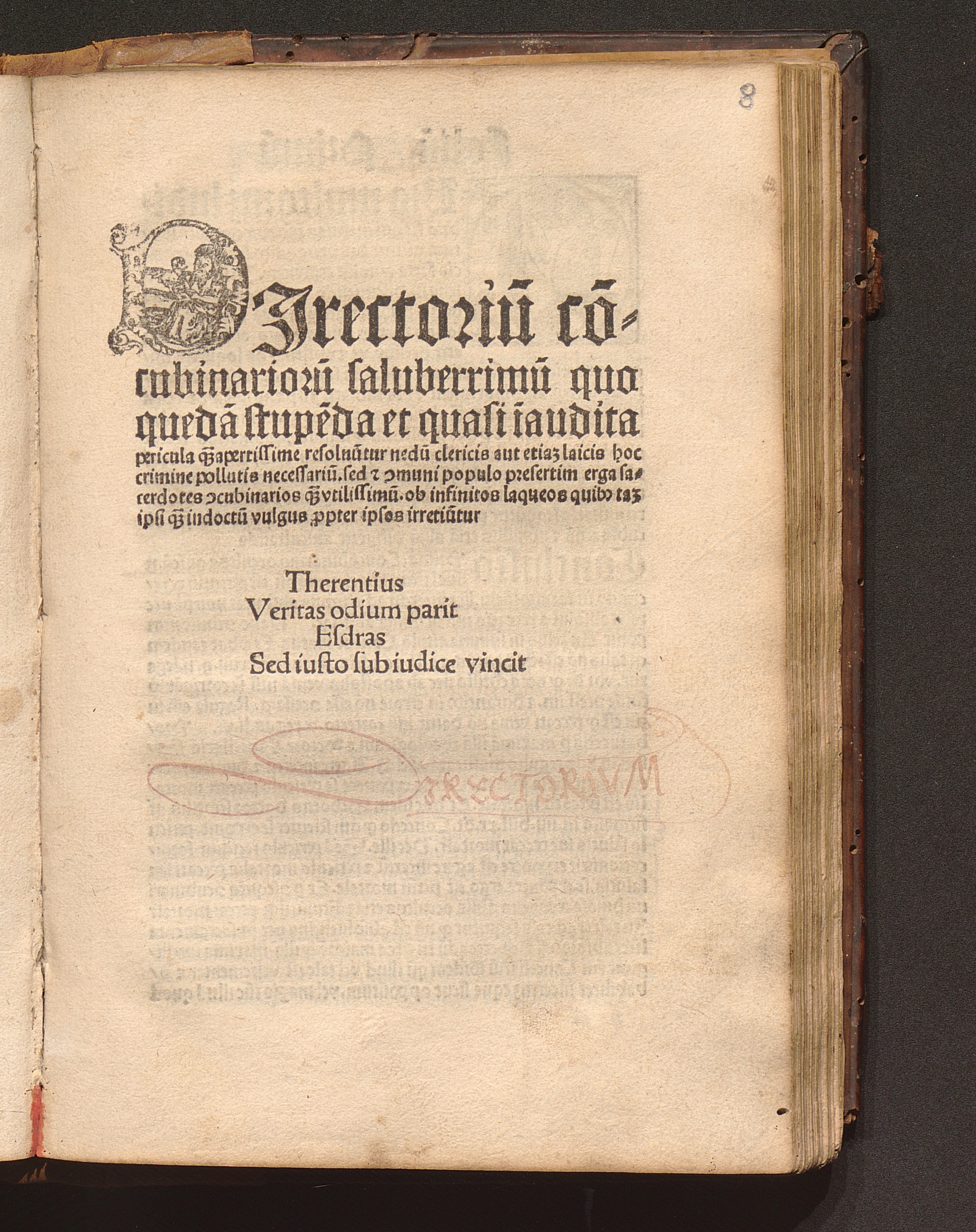 DJrectoriu[m] co[n]=||cubinarioru[m] saluberrimu[m] quo || queda[m] stupe[n]da et quasi i[n]audita || pericula q[ua...] apertissime resoluu[n]tur nedu[m] clericis aut etia[m] laicis hoc || crimine pollutis necessariu[m]. sed [et] [com]muni populo presertim erga sa=||cerdotes [con]cubinarios q[ua...] vtilissimu[m]. ob infinitos laqueos quib[us] ta[m] || ipsi q[ua...] indoctu[m] vulgus p[ro]pter ipsos irretiu[n]tur || ... ||