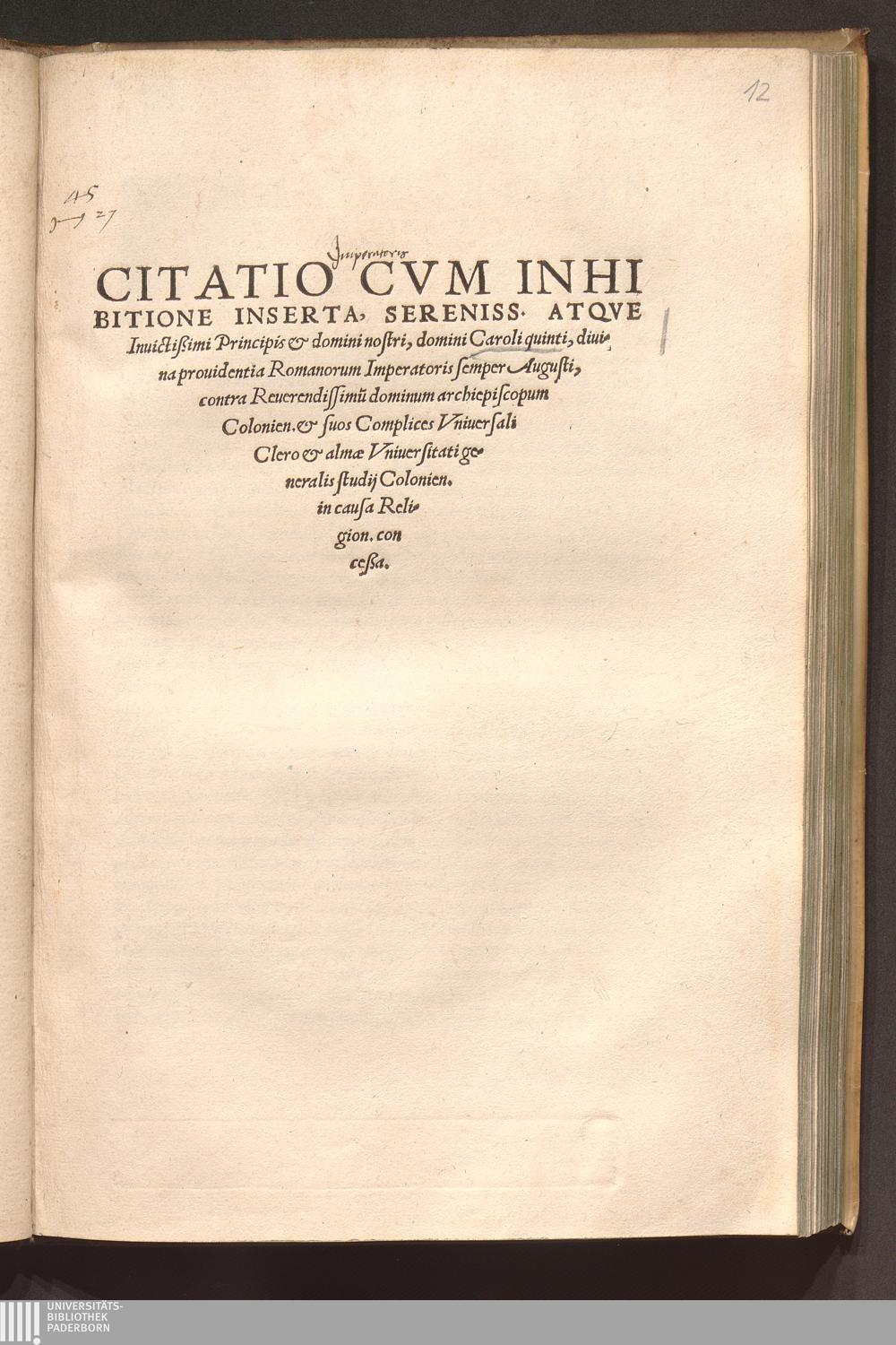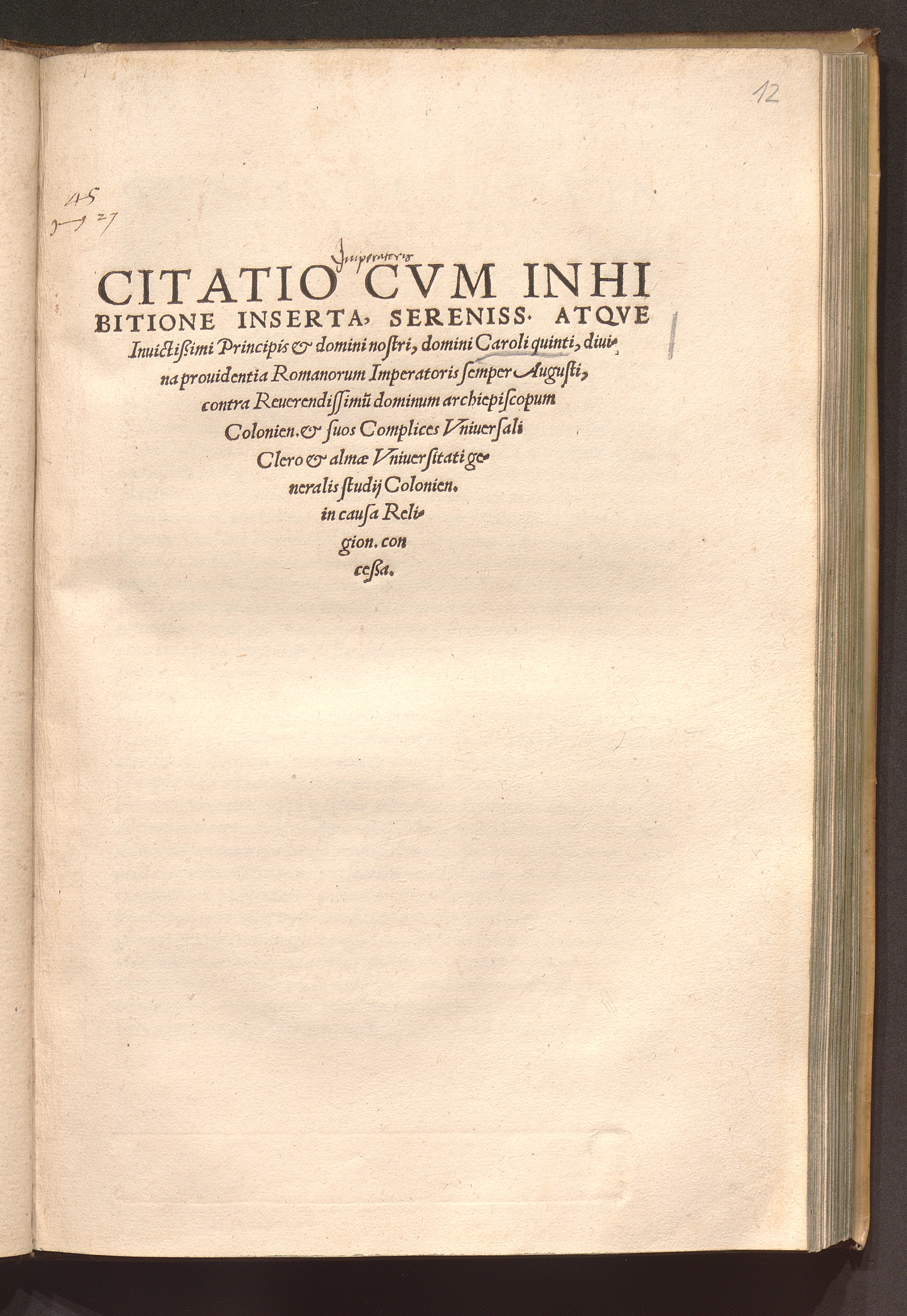 Citatio Cvm Inhibitione Inserta, Sereniss. Atqve Inuictißimi Principis & domini nostri, domini Caroli quinti, diuina prouidentia Romanorum Imperatoris semper Augusti, contra Reuerendissimu[m] dominum archiepiscopum Colonien. & suos Complices Vniuersali Clero & almæ Vniuersitati generalis studij Colonien. in causa Religion. conceßa