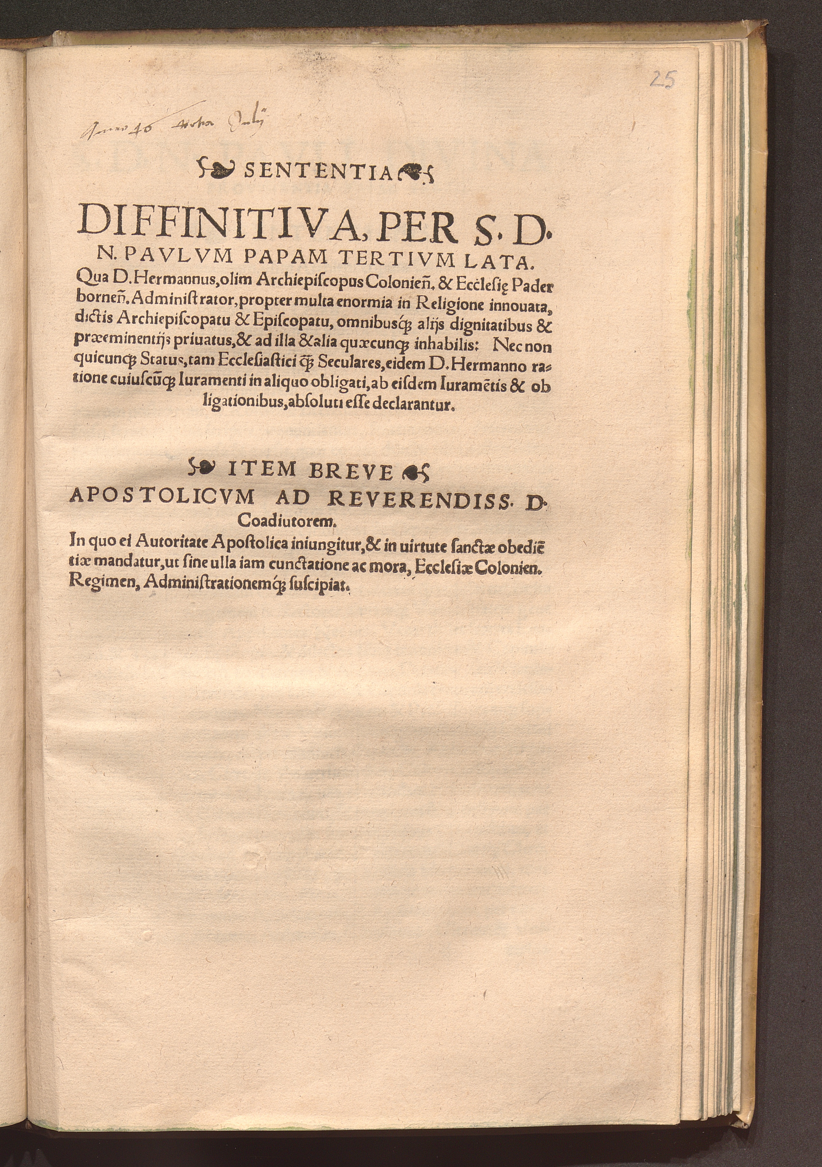 SENTENTIA || DIFFINITIVA, PER S. D.|| N. PAVLVM PAPAM TERTIVM LATA.|| Qua D. Hermannus, olim Archiepiscopus Colonien[sis]. & Ecclesi[a]e Pader||bornen[sis]. Administrator, propter multa enormia in Religione innouata,|| dictis Archiepiscopatu & Episcopatu, omnibusq[ue] alijs dignitatibus & || præeminentijs priuatus, & ad illa & alia quæcunq[ue] inhabilis: Nec non || quicunq[ue] Status, tam Ecclesiastici q[uam] Seculares ... || ab ... ob||ligationibus, absoluti esse declarantur.||