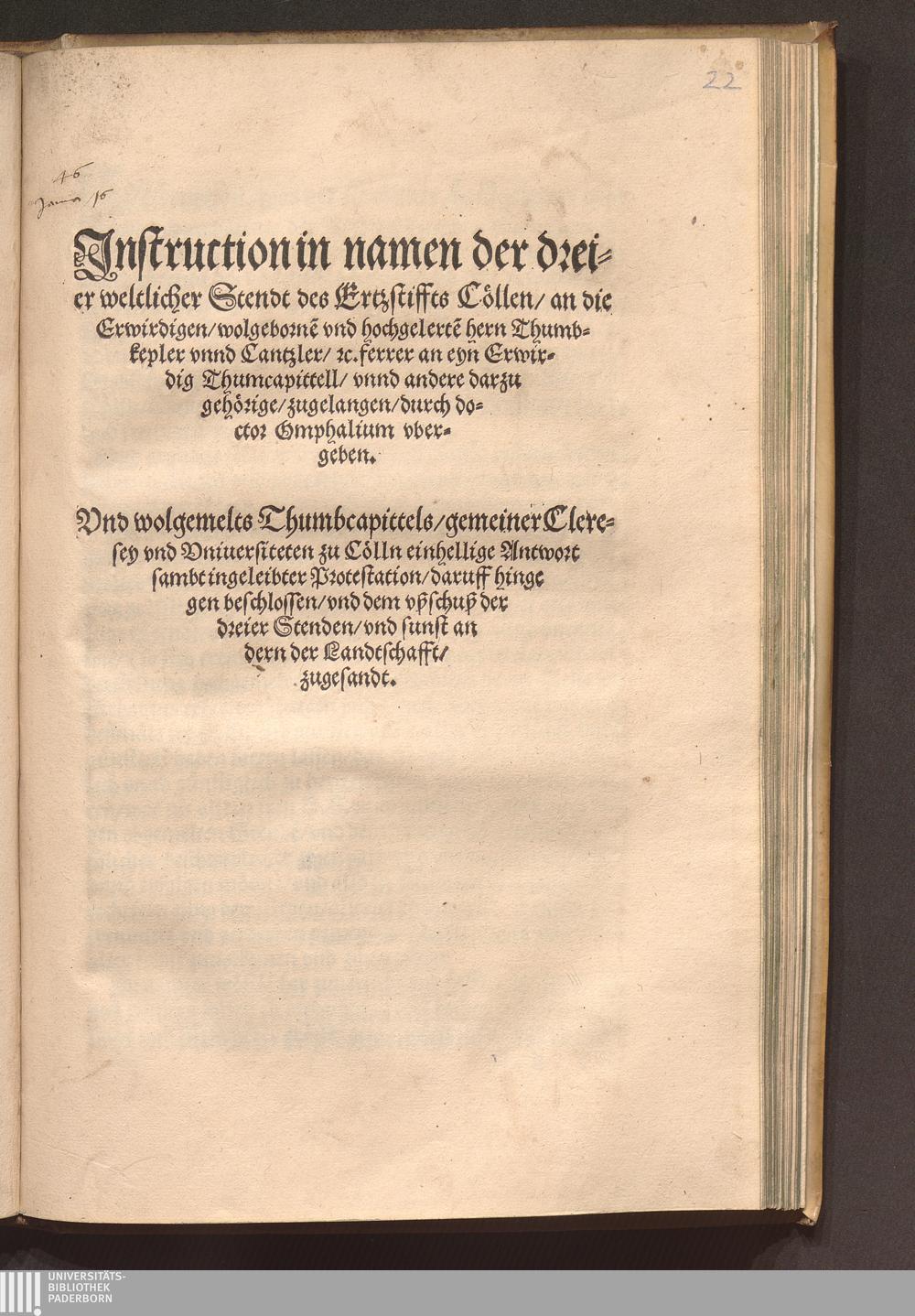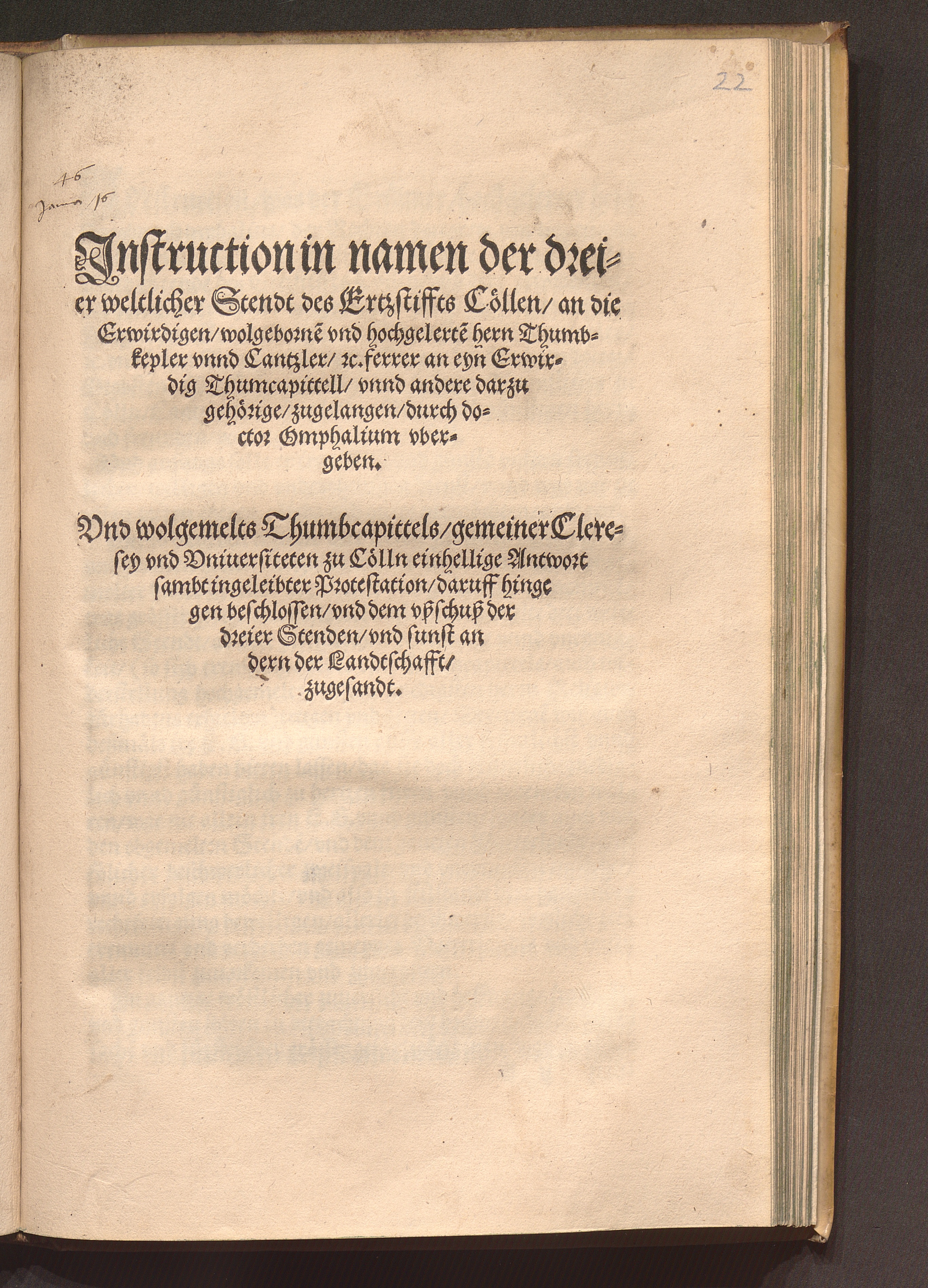 Jnstruction in namen der dreier weltlicher Stendt des Ertzstiffts Cöllen/ an die Erwirdigen/ wolgeborne[n] vnd hochgelerte[n] hern Thumbkepler vnnd Cantzler/ [et]c. ferrer an eyn[n] Erwirdig Thumcapittell/ vnnd andere darzu gehörige/ zugelangen/ durch doctor Omphalium vbergeben
