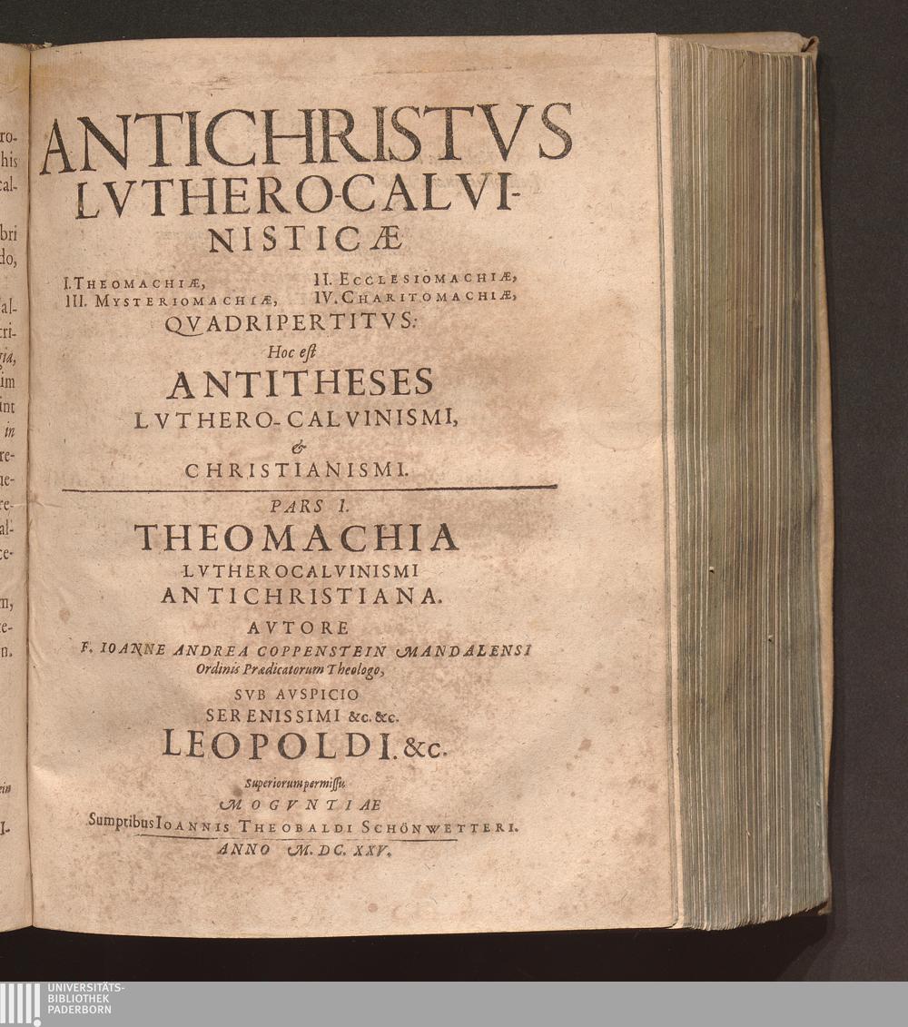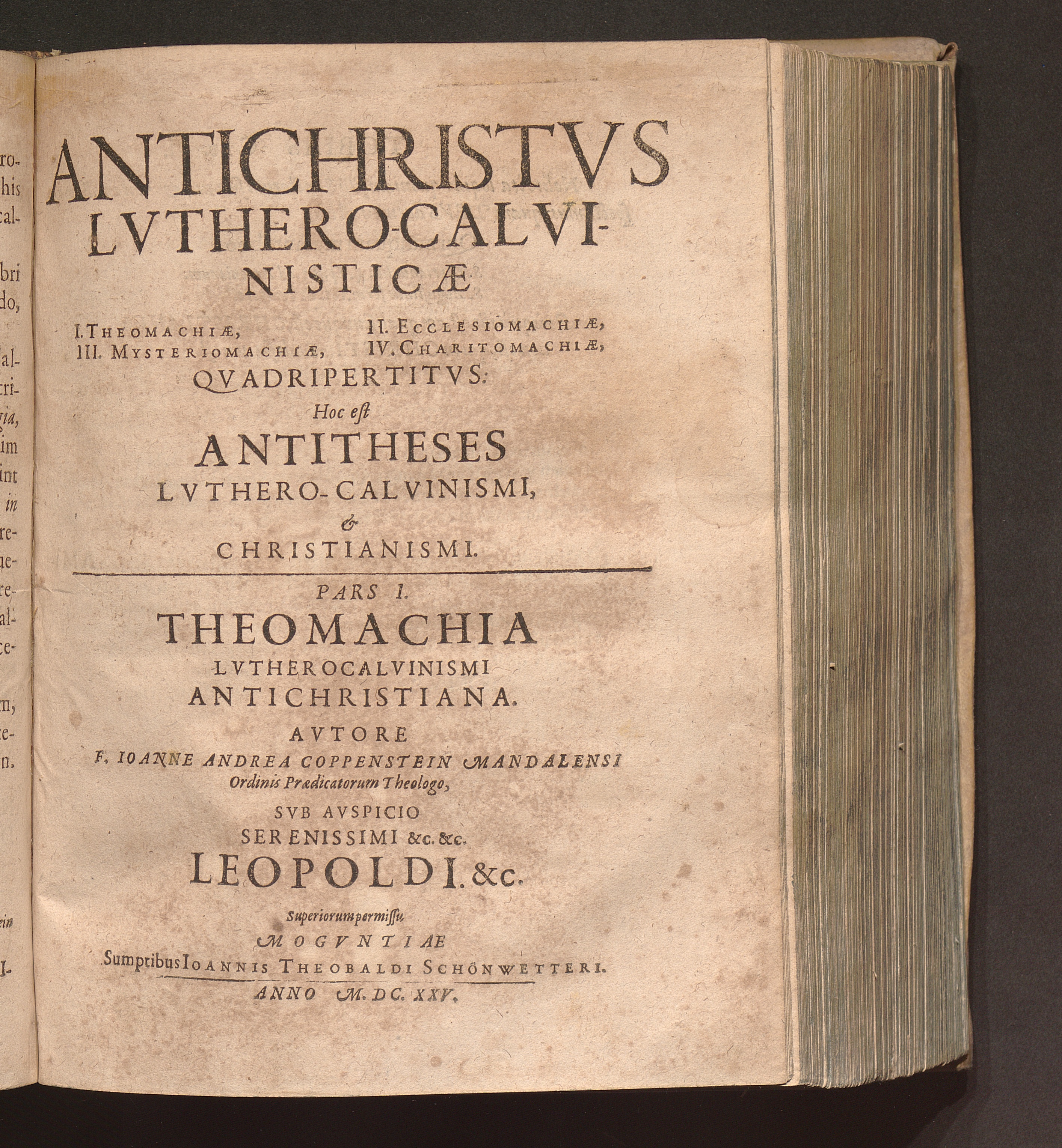 Controversiarvm Omnivm Hvivs Ævi Lvthero-Calvinisticarvm Libri Tres : Ex Illvstrissimo Cardinali Bellarmino in Epitomen redacti & sub diuersis titulis bis quatripartitis digesti / Avctore R. P. Fratre Ioanne Andrea Coppenstein Ordinis Prædicatorum Theologo