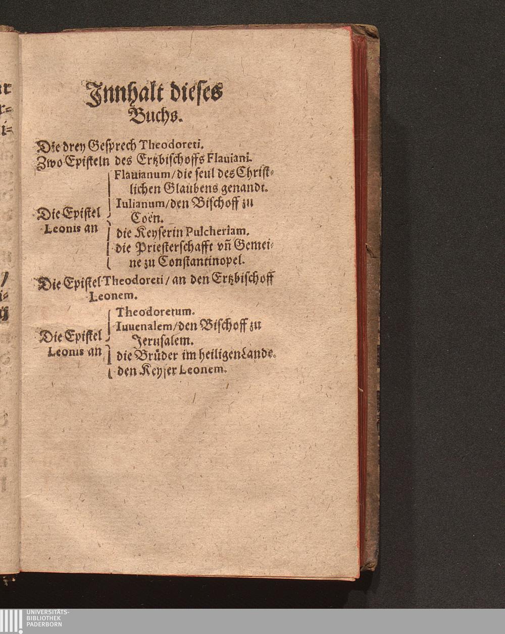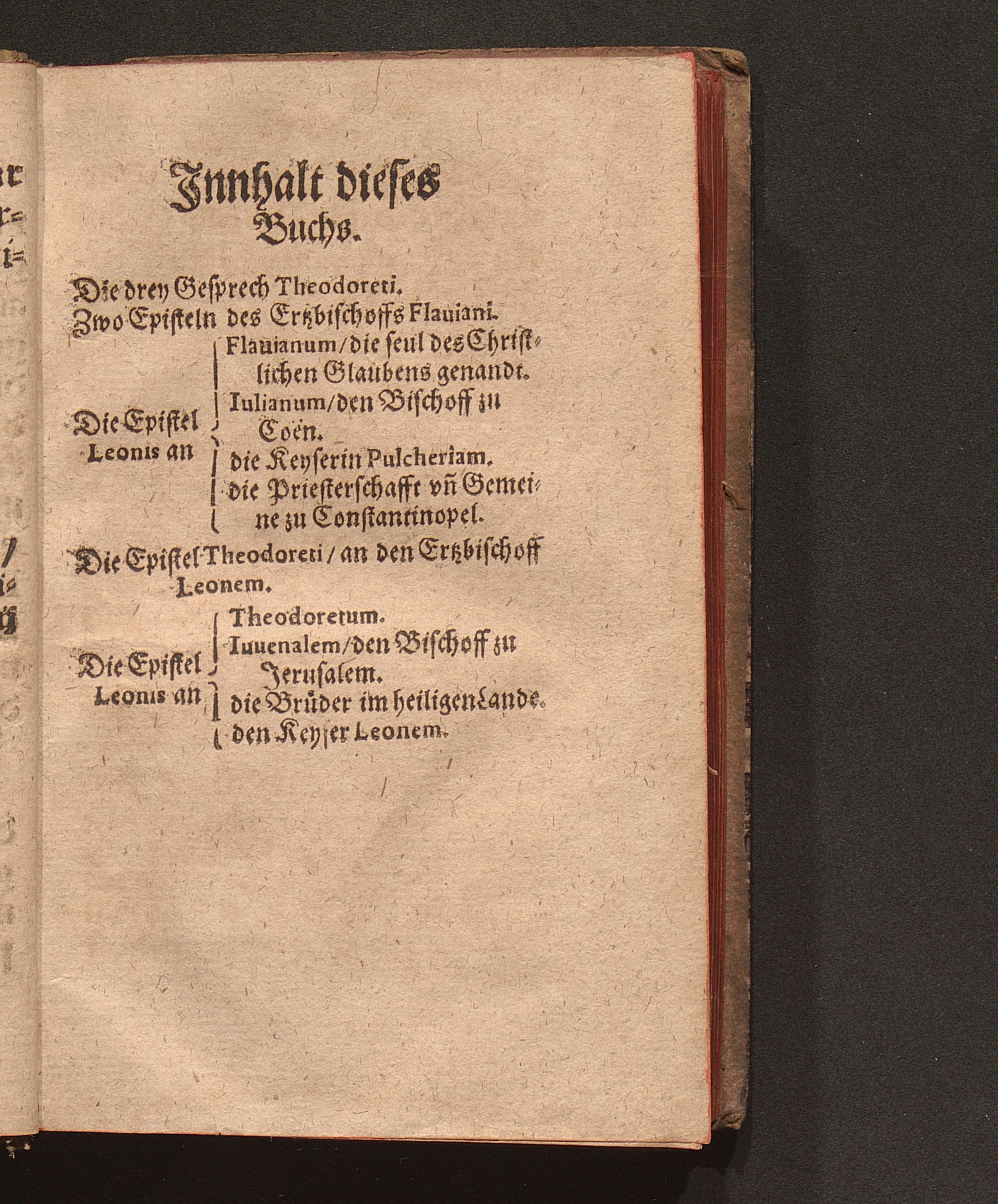 Dialogi || THEODORETI.|| Drey Sch[oe]ne || Gesprech/ Von vereinigung || vnd vnterscheid beyder Naturn in || der einigen Person Jhesu Christi/|| Des alten/ hochgelehrten || Bischoffs || THEODORETI.|| Sampt den vornemsten Epi=||steln/ des Hochber[ue]mpten || Bapsts zu Rom || LEONIS MAGNI.|| ... || Verdeutscht durch || Martinum Mollerum, Witte=||bergensem.||