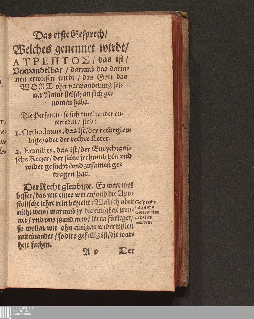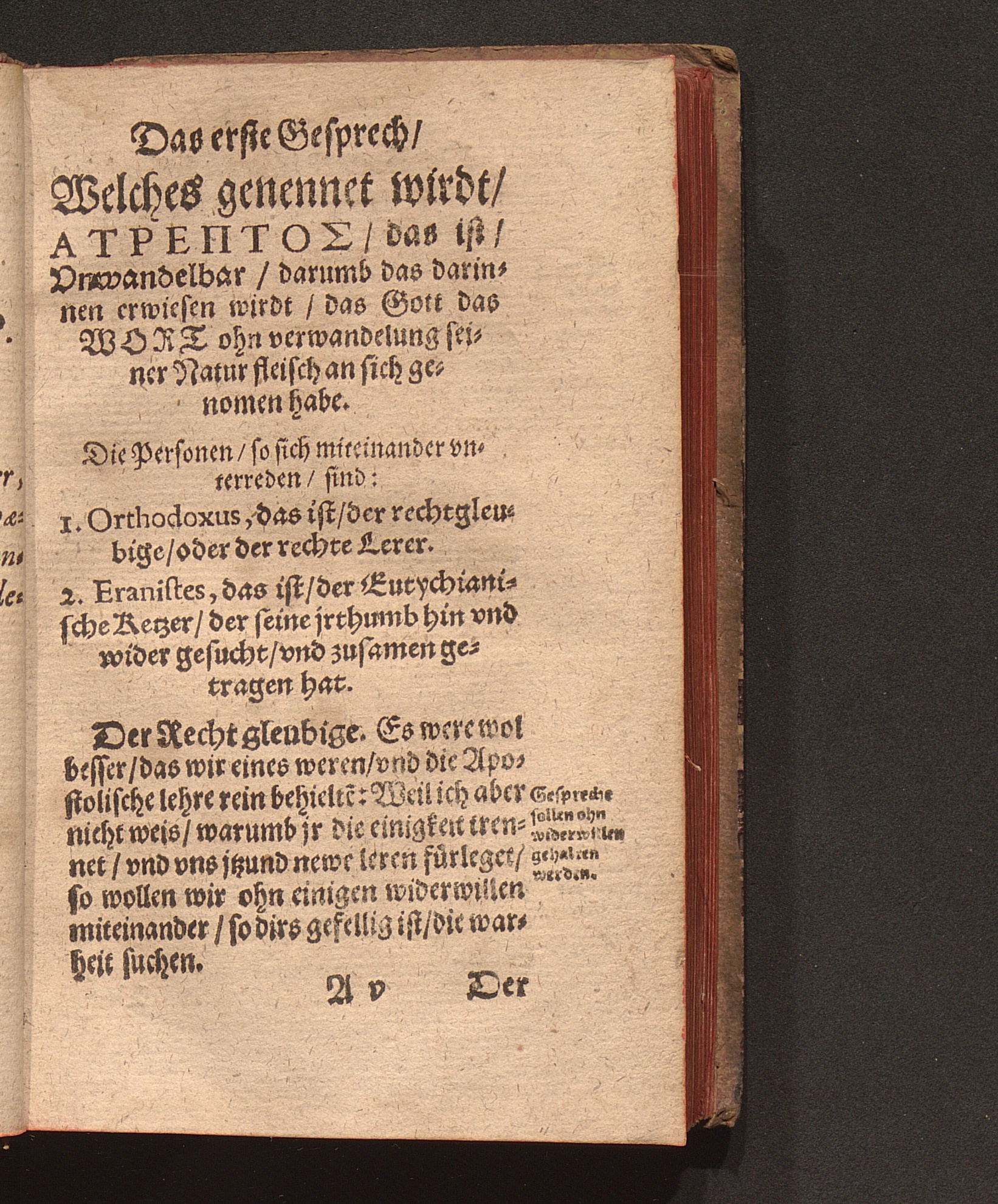Dialogi || THEODORETI.|| Drey Sch[oe]ne || Gesprech/ Von vereinigung || vnd vnterscheid beyder Naturn in || der einigen Person Jhesu Christi/|| Des alten/ hochgelehrten || Bischoffs || THEODORETI.|| Sampt den vornemsten Epi=||steln/ des Hochber[ue]mpten || Bapsts zu Rom || LEONIS MAGNI.|| ... || Verdeutscht durch || Martinum Mollerum, Witte=||bergensem.||