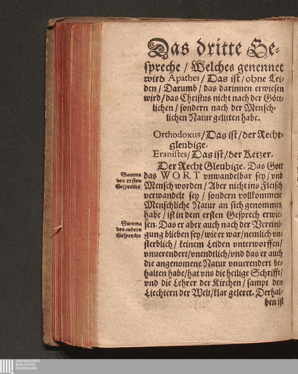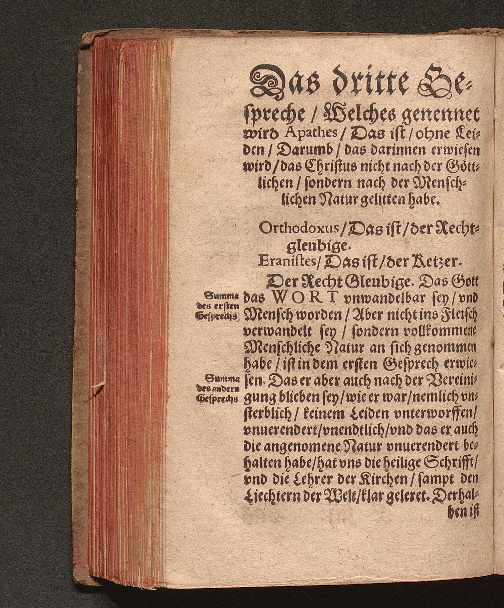 Dialogi || THEODORETI.|| Drey Sch[oe]ne || Gesprech/ Von vereinigung || vnd vnterscheid beyder Naturn in || der einigen Person Jhesu Christi/|| Des alten/ hochgelehrten || Bischoffs || THEODORETI.|| Sampt den vornemsten Epi=||steln/ des Hochber[ue]mpten || Bapsts zu Rom || LEONIS MAGNI.|| ... || Verdeutscht durch || Martinum Mollerum, Witte=||bergensem.||
