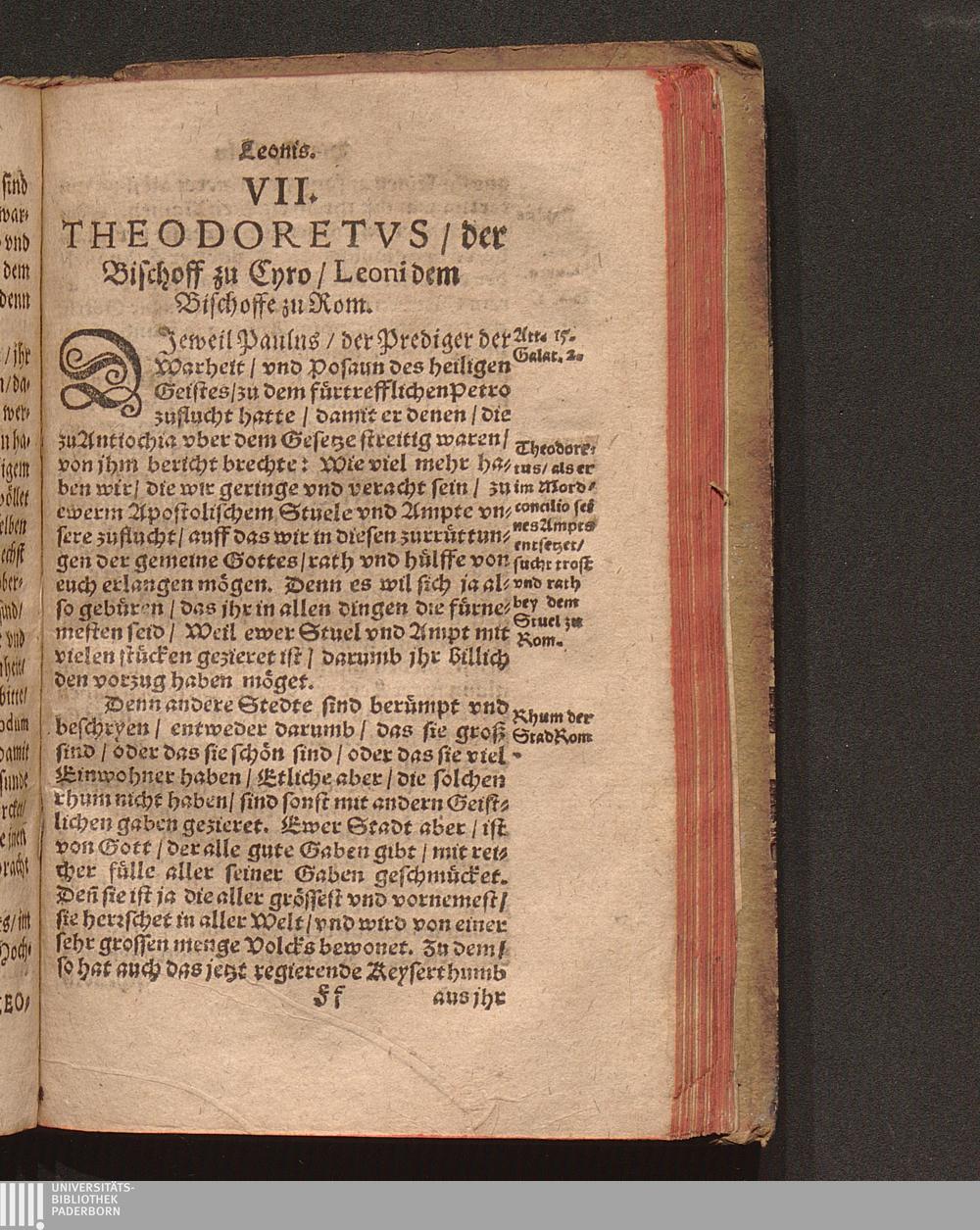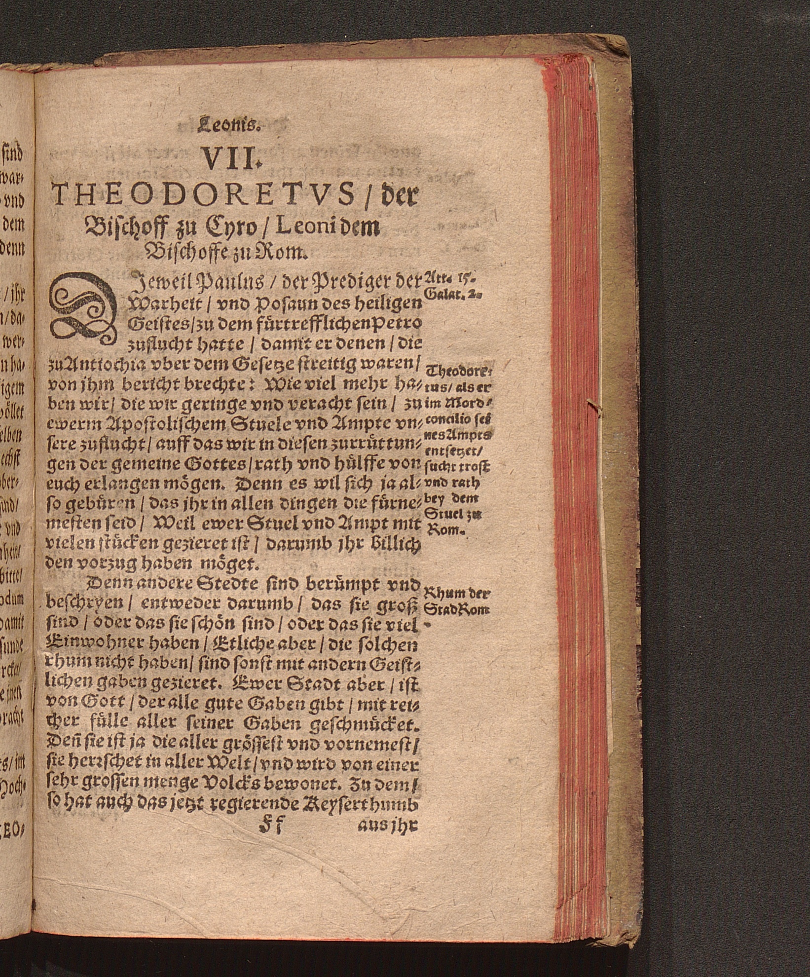 Dialogi || THEODORETI.|| Drey Sch[oe]ne || Gesprech/ Von vereinigung || vnd vnterscheid beyder Naturn in || der einigen Person Jhesu Christi/|| Des alten/ hochgelehrten || Bischoffs || THEODORETI.|| Sampt den vornemsten Epi=||steln/ des Hochber[ue]mpten || Bapsts zu Rom || LEONIS MAGNI.|| ... || Verdeutscht durch || Martinum Mollerum, Witte=||bergensem.||