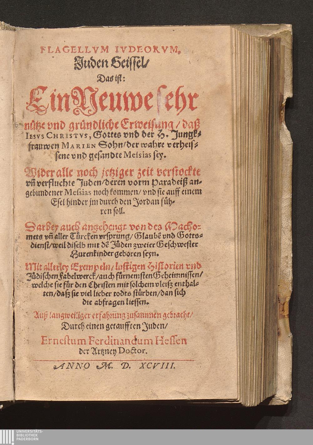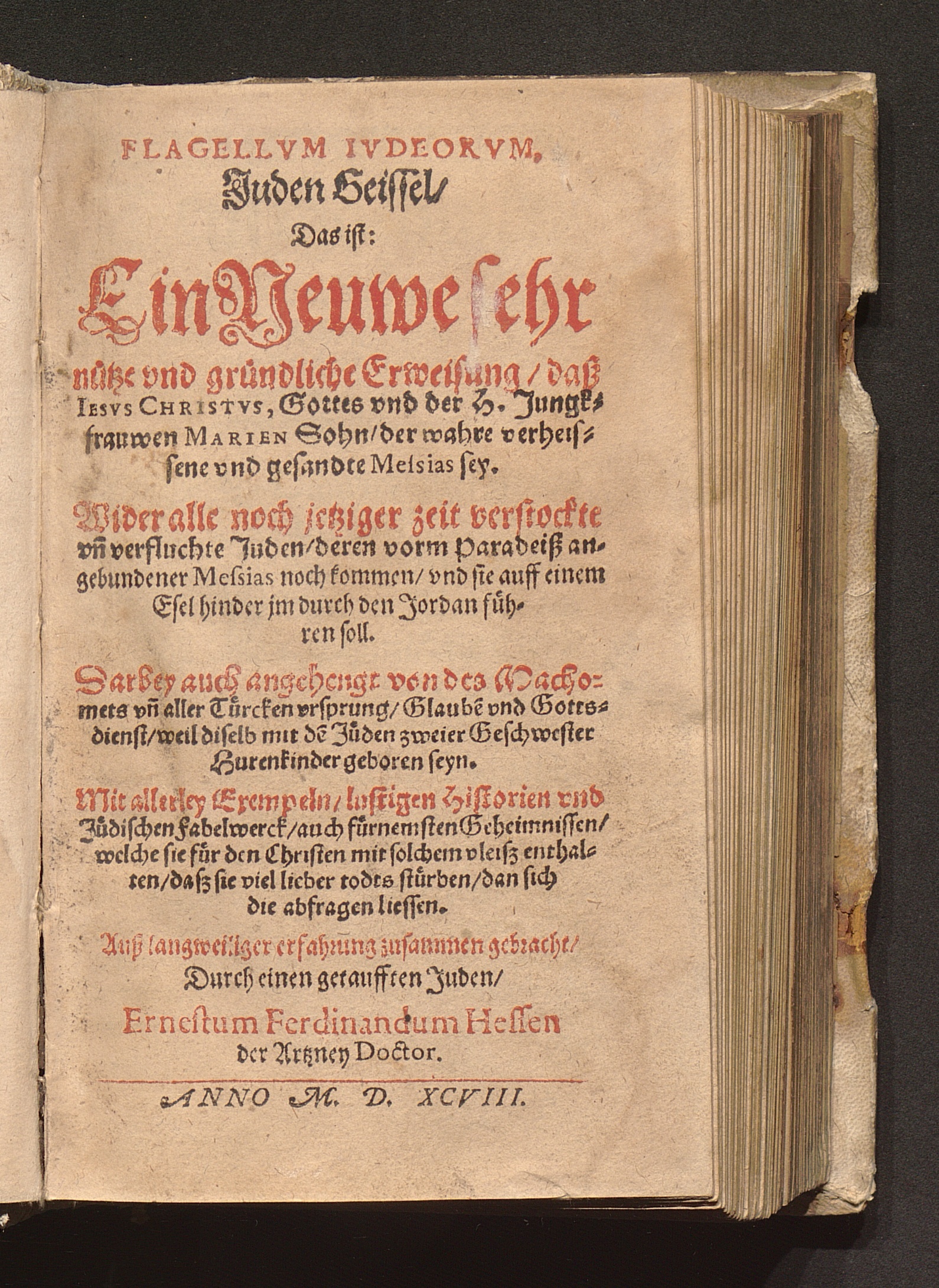 Flagellvm Ivdeorvm, Juden Geissel/ Das ist: Ein Neuwe sehr nütze vnd gründliche Erweisung/ daß Iesvs Christvs, Gottes vnd der H. Jungkfrauwen Marien Sohn/ der wahre verheissene vnd gesandte Messias sey : Wider alle ... Juden/ deren ... Messias noch kommen ... soll. Darbey auch angehengt von des Machomets vn[d] aller Türcken vrsprung/ Glaube[n] vnd Gottsdienst ... Mit allerley Exempeln/ lustigen Historien vnd Jüdischen Fabelwerck ... / Auß langweiliger erfahrung zusammen gebracht/ Durch einen getaufften Juden/ Ernestum Ferdinandum Hessen der Artzney Doctor