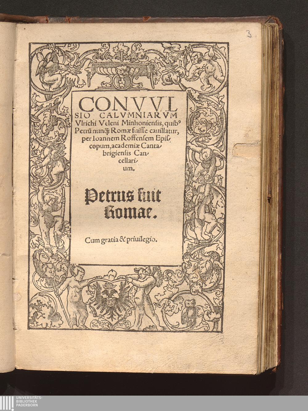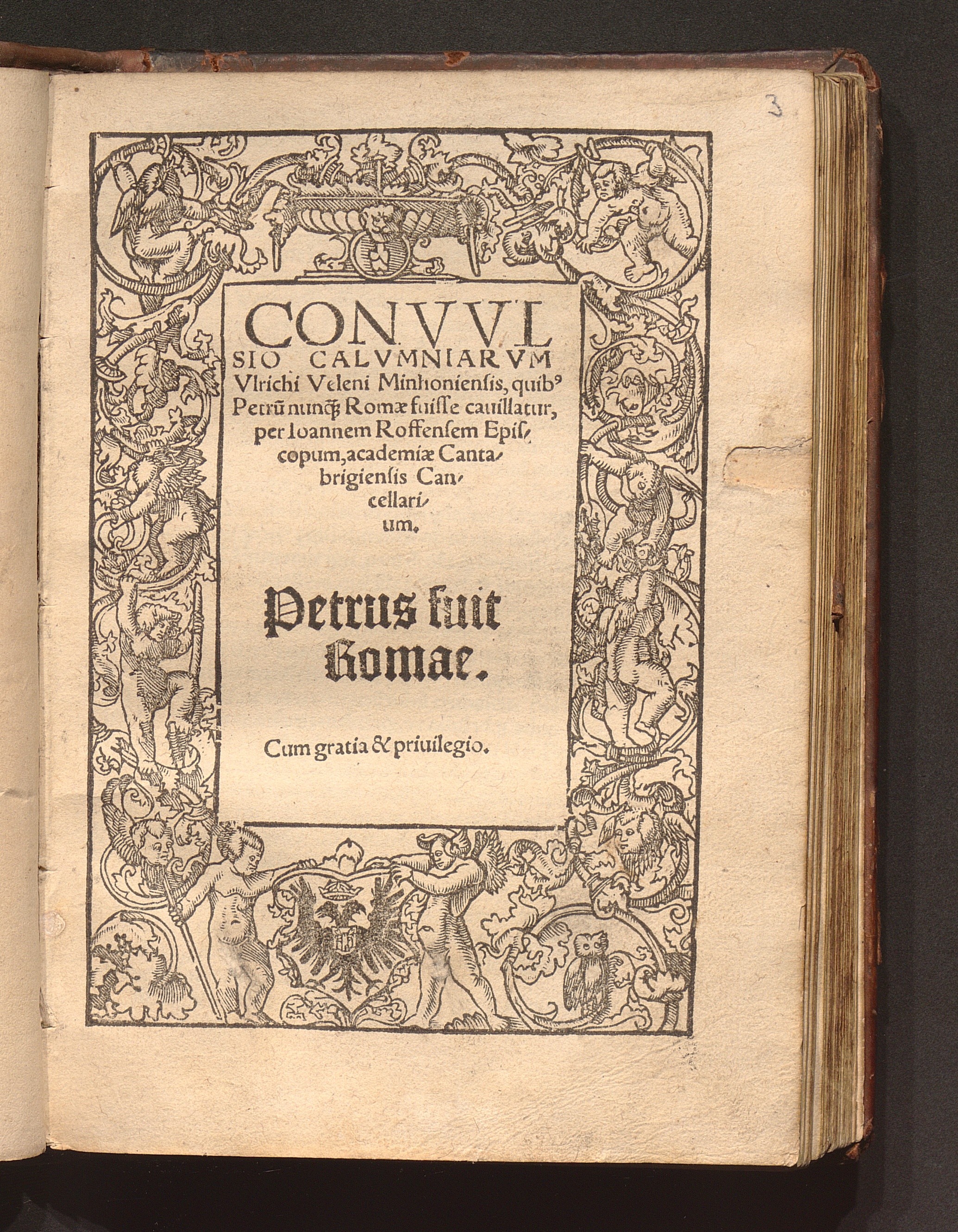 Convvlsio Calvmniarvm Vlrichi Veleni Minhoniensis, quib[us] Petru[m] nunq[uam] Romæ fuisse cauillatur / per Ioannem Roffensem Episcopum, academiæ Cantabrigiensis Cancellarium