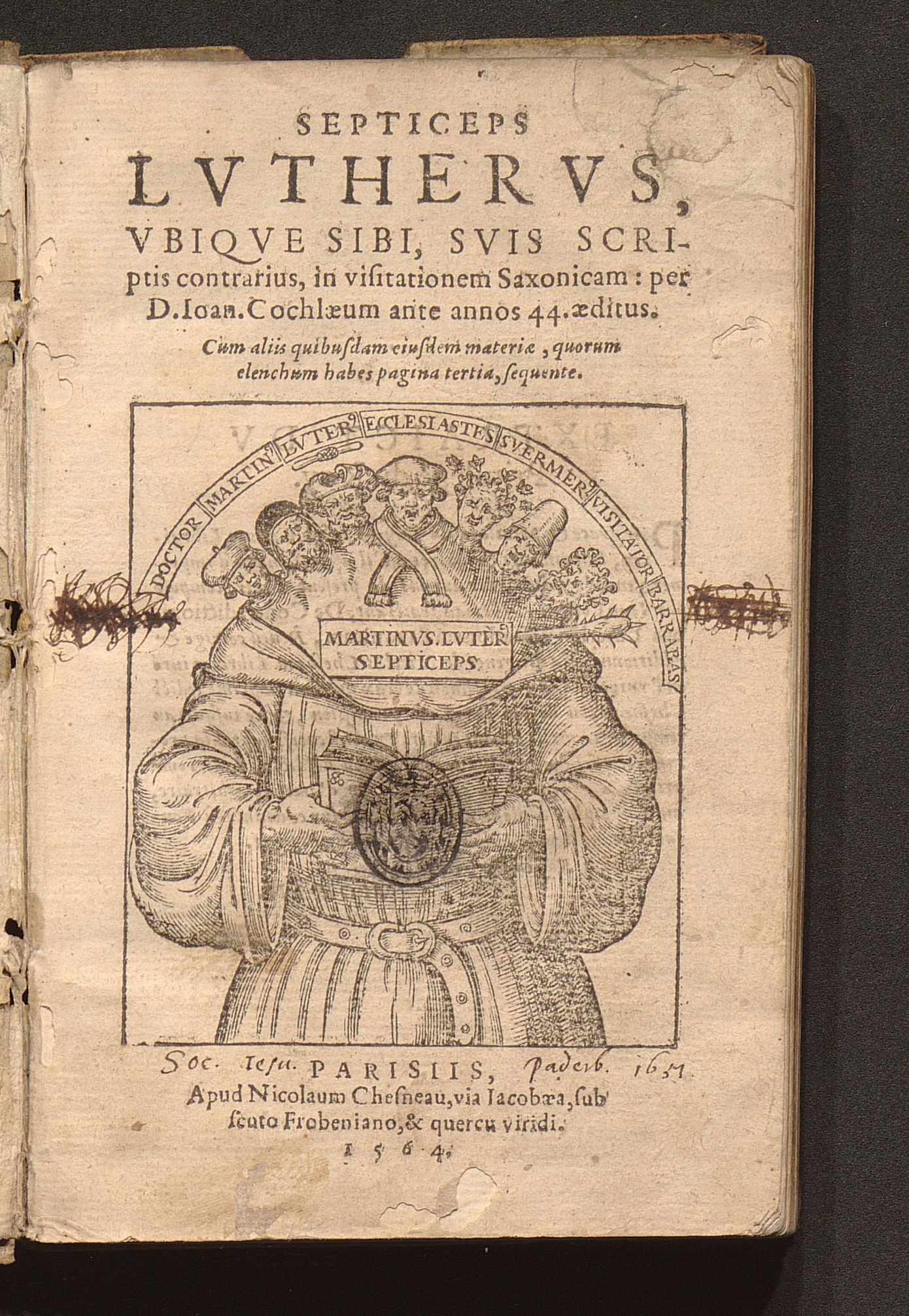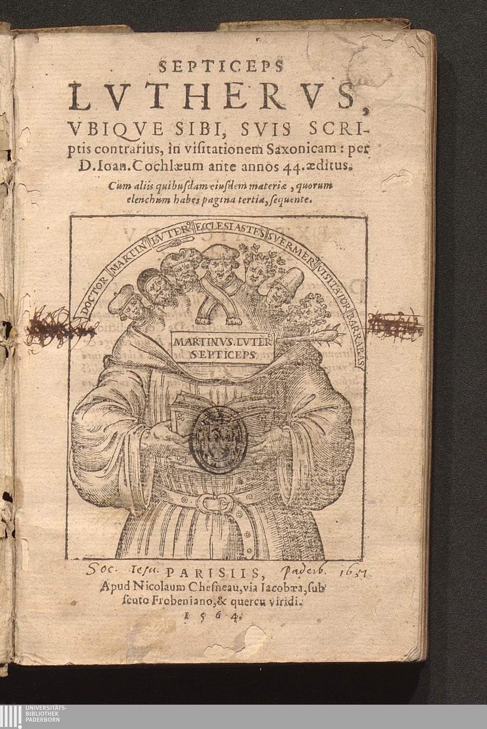 Septiceps Lvthervs, Vbiqve Sibi, Svis Scriptis contrarius, in visitationem Saxonicam : Cum aliis quibusdam eiusdem materiæ ... / per D. Ioan. Cochlæum ante annos 44. æditus