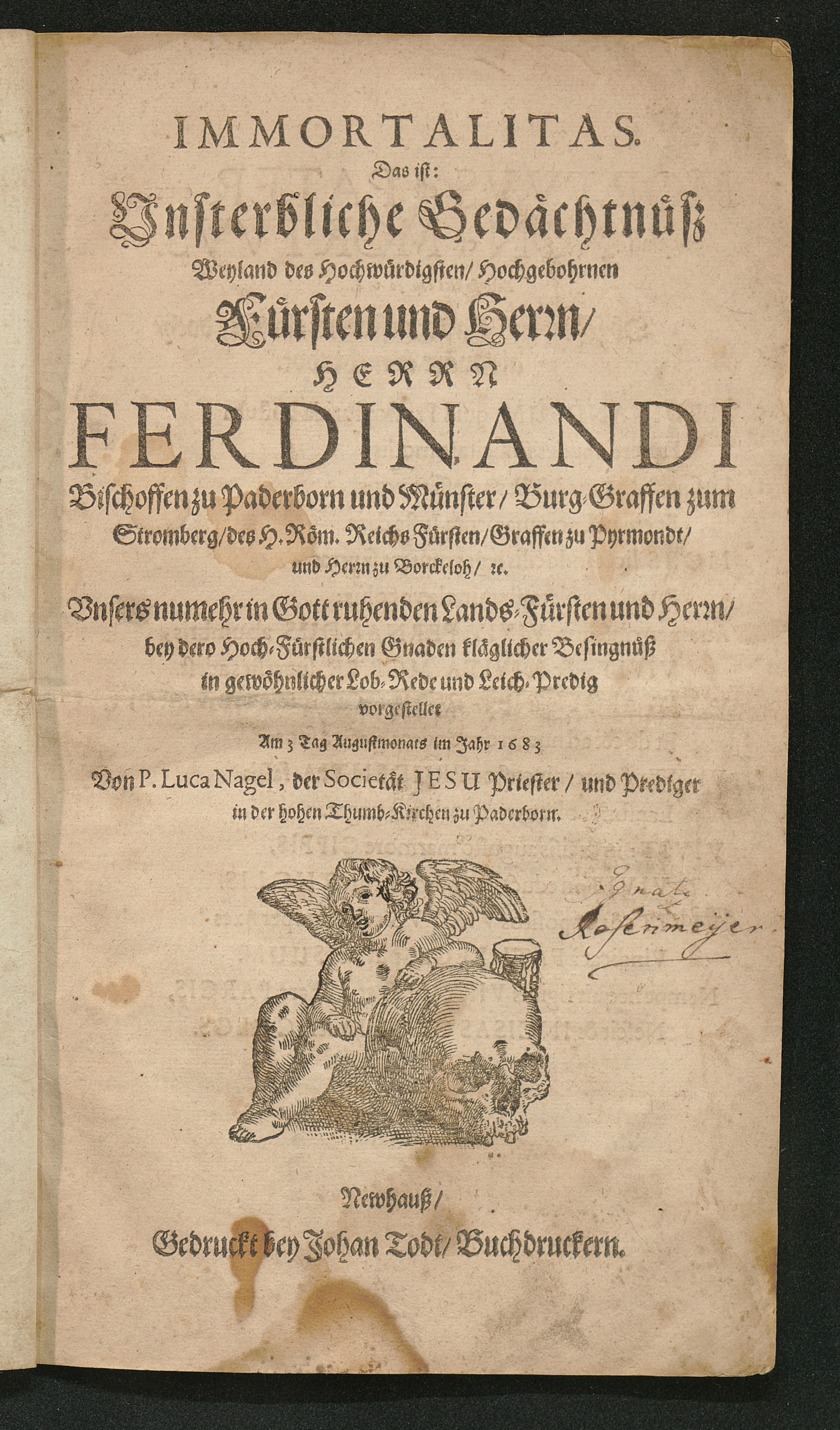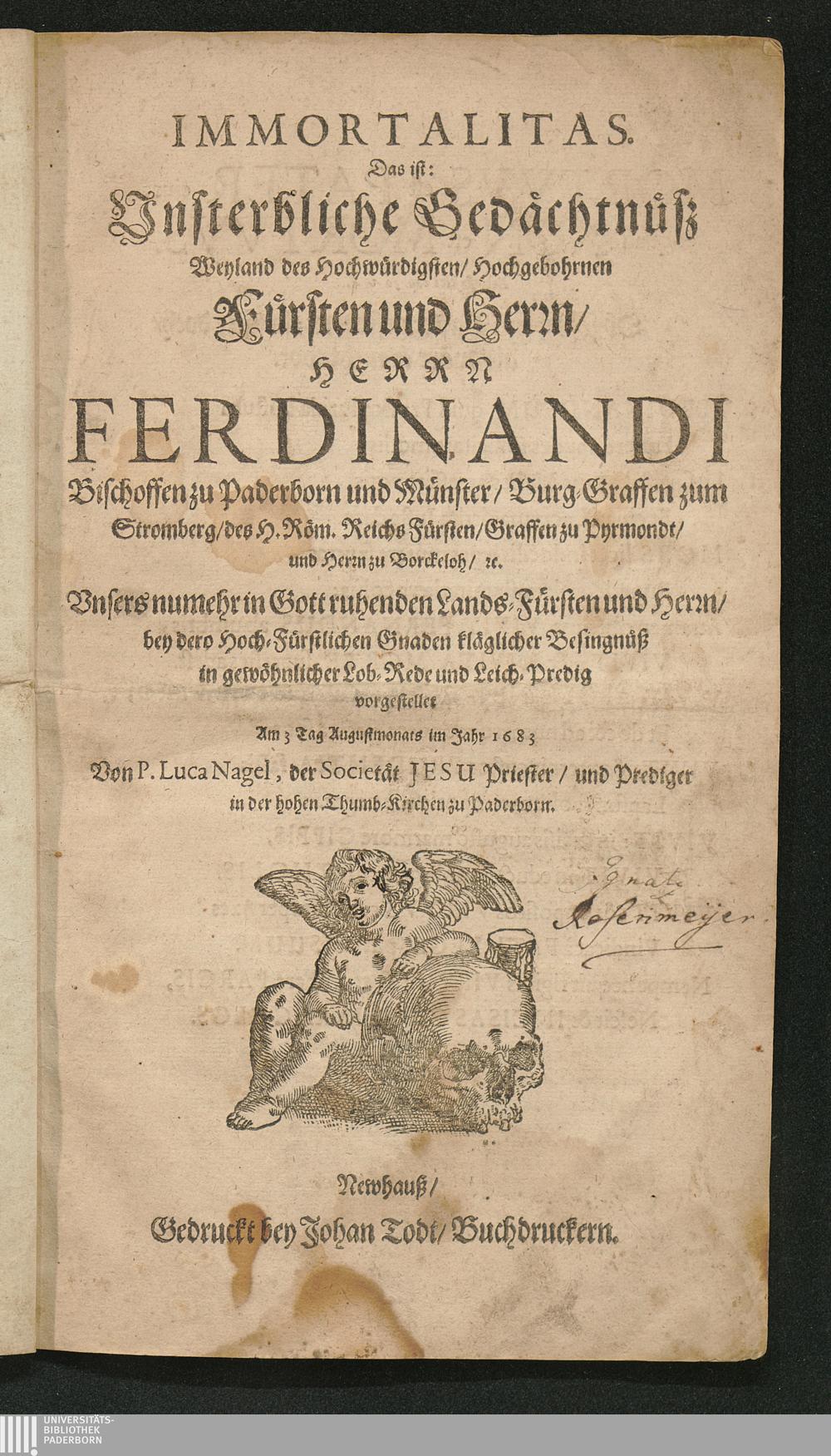 Immortalitas. Das ist: Unsterbliche Gedächtnüß Weyland des Hochwürdigsten, Hochgebohrnen Fürsten und Herrn, Herrn Ferdinandi Bischoffen zu Paderborn und Münster, ... Unsers nunmehr in Gott ruhenden Lands-Fürsten und Herrn, bey dero Hoch-Fürstlichen Gnaden kläglicher Besingnüß in gewöhnlicher Lob-Rede und Leich-Predig vorgestellet Am 3. Tag Augustmonats im Jahr 1683 / Von P. Luca Nagel, der Societät Jesu Priester, und Prediger in der hohen Thums-Kirchen zu Paderborn