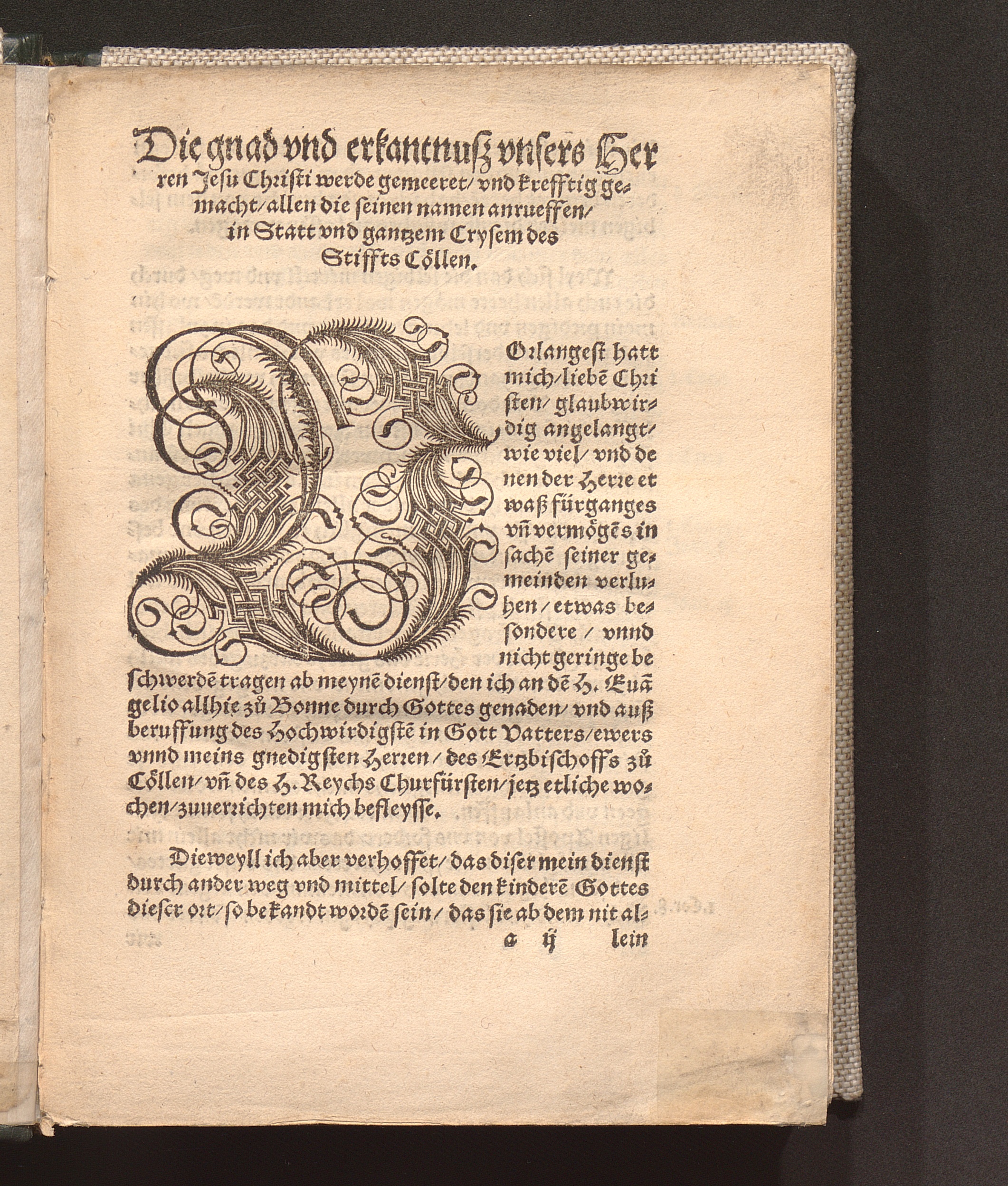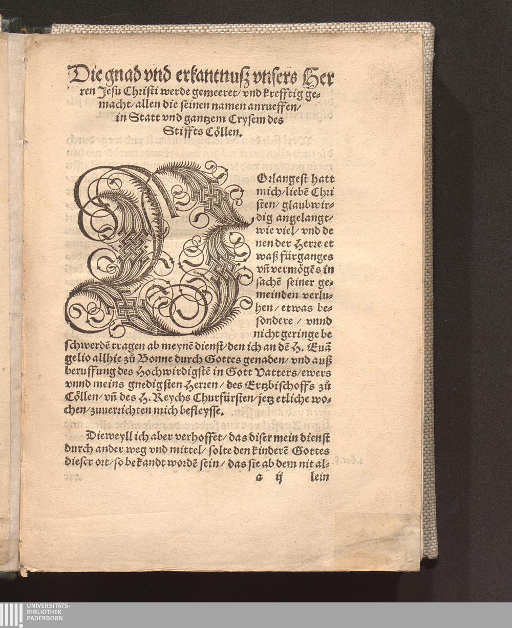 Was im namen des || Heiligen Euangeli vnsers Herrenn || Jesu Christi/ ietzund zů Bon[n] jm Stifft Cöllen/|| gelehret vnnd geprediget würdt.|| : Das der dienst der selbigen predigen || vnd lehre zů Bon[n] ordenlich fürgenommen ist/ vnd || geübt würdt/ also das die Christen des ein gůt gefallen/ vnd kein beschwerden billich haben sollen.|| Das die Christen auß solchem dienst || vberal sich kaynes argen/ oder vnraths zů befaren/ || sonder aller gnaden vnd segen Gottes/ zů || zeitlicher vnd ewiger wolfart/ ge-||wißlich zuerwarten haben.|| / Durch Martinum Bucerum jetzundt dienen-||de dem H. Evangelio Christi zů Bon[n]