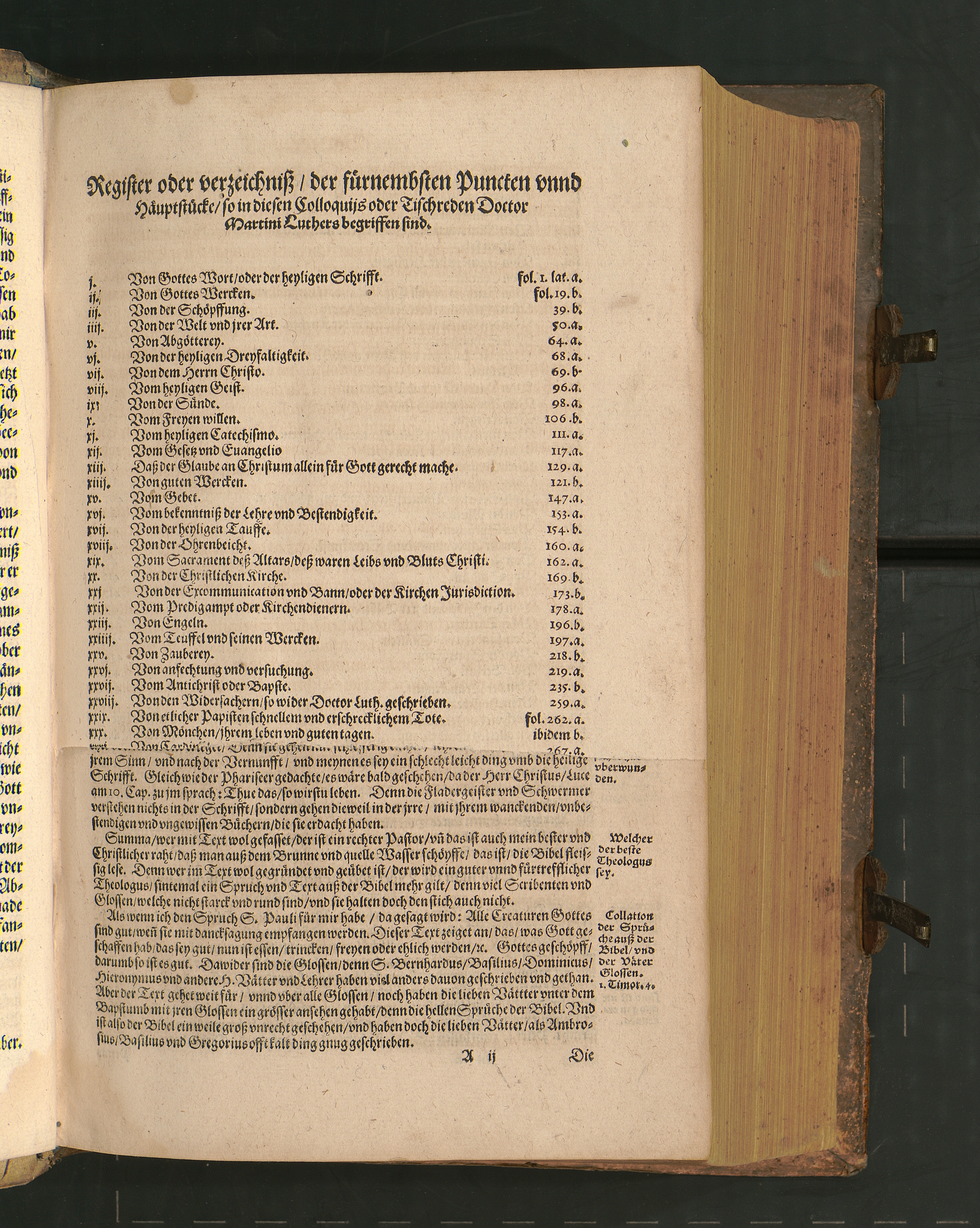 COLLOQVIA || Oder || Tischreden Do=||ctor Martini Lutheri/ : so er in vielen || Jaren/ die Zeit seines Lebens/ gegen Gelehrten Leuthen/ Auch || frembden Gesten vnd seinen Tischgesellen geführet. Darinn von allen Artickeln || vnser Religion/ Auch von hohen Stücken/ Fragen vnd Antwort: Item/|| viel mercklichen Historijs/ vnd sonst von allerley Lehre/ Trost/ Raht/|| vnnd vnterricht/ zu finden.|| / Anfenglichs von M. Anthonio Lauterbach zusammen getragen/ Hernacher in gewisse Locos || Communes verfasset/ vnd auß viel anderer Gelehrter Leute Collectaneis gemehret.|| Durch Johannem Aurifabern.||
