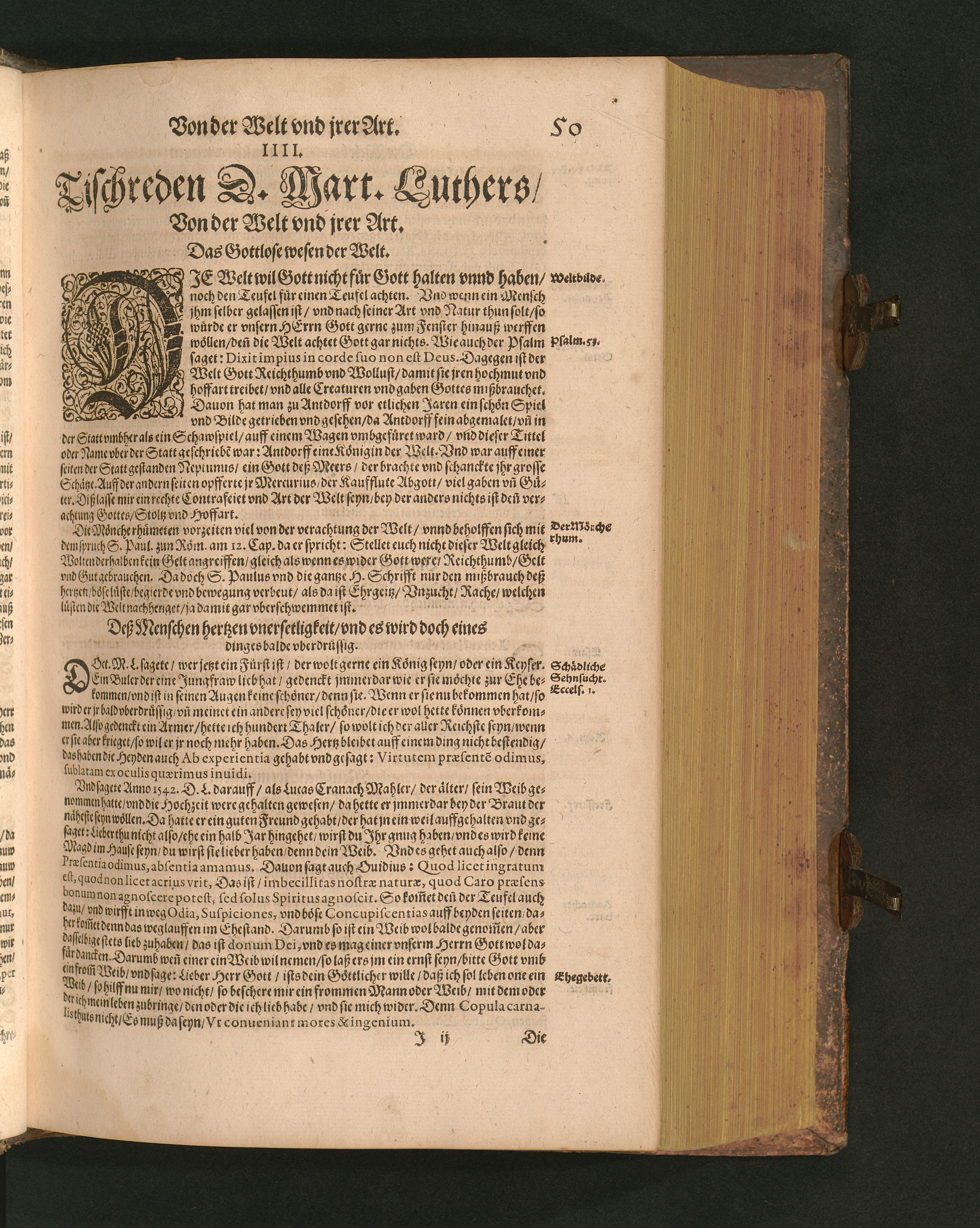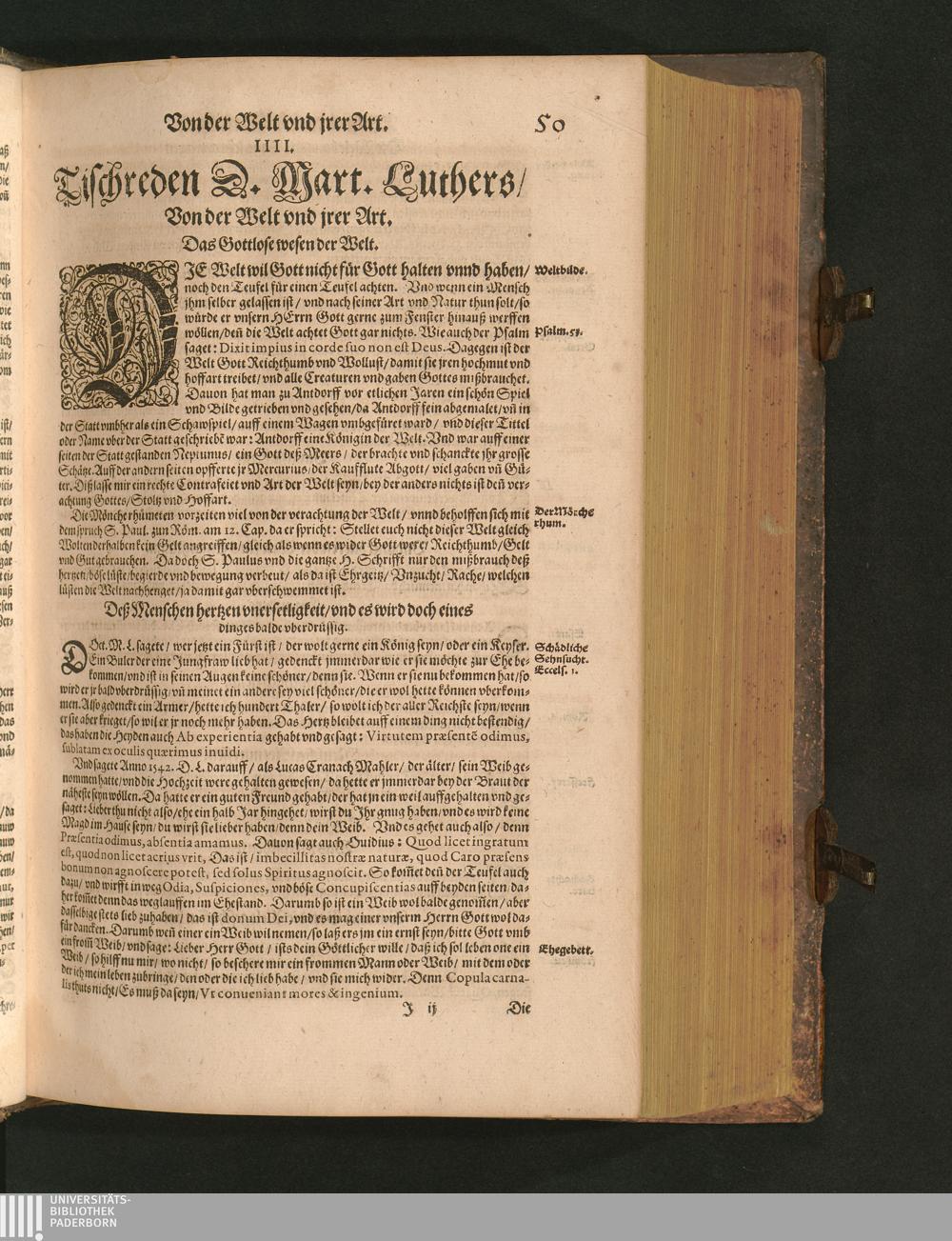 COLLOQVIA || Oder || Tischreden Do=||ctor Martini Lutheri/ : so er in vielen || Jaren/ die Zeit seines Lebens/ gegen Gelehrten Leuthen/ Auch || frembden Gesten vnd seinen Tischgesellen geführet. Darinn von allen Artickeln || vnser Religion/ Auch von hohen Stücken/ Fragen vnd Antwort: Item/|| viel mercklichen Historijs/ vnd sonst von allerley Lehre/ Trost/ Raht/|| vnnd vnterricht/ zu finden.|| / Anfenglichs von M. Anthonio Lauterbach zusammen getragen/ Hernacher in gewisse Locos || Communes verfasset/ vnd auß viel anderer Gelehrter Leute Collectaneis gemehret.|| Durch Johannem Aurifabern.||