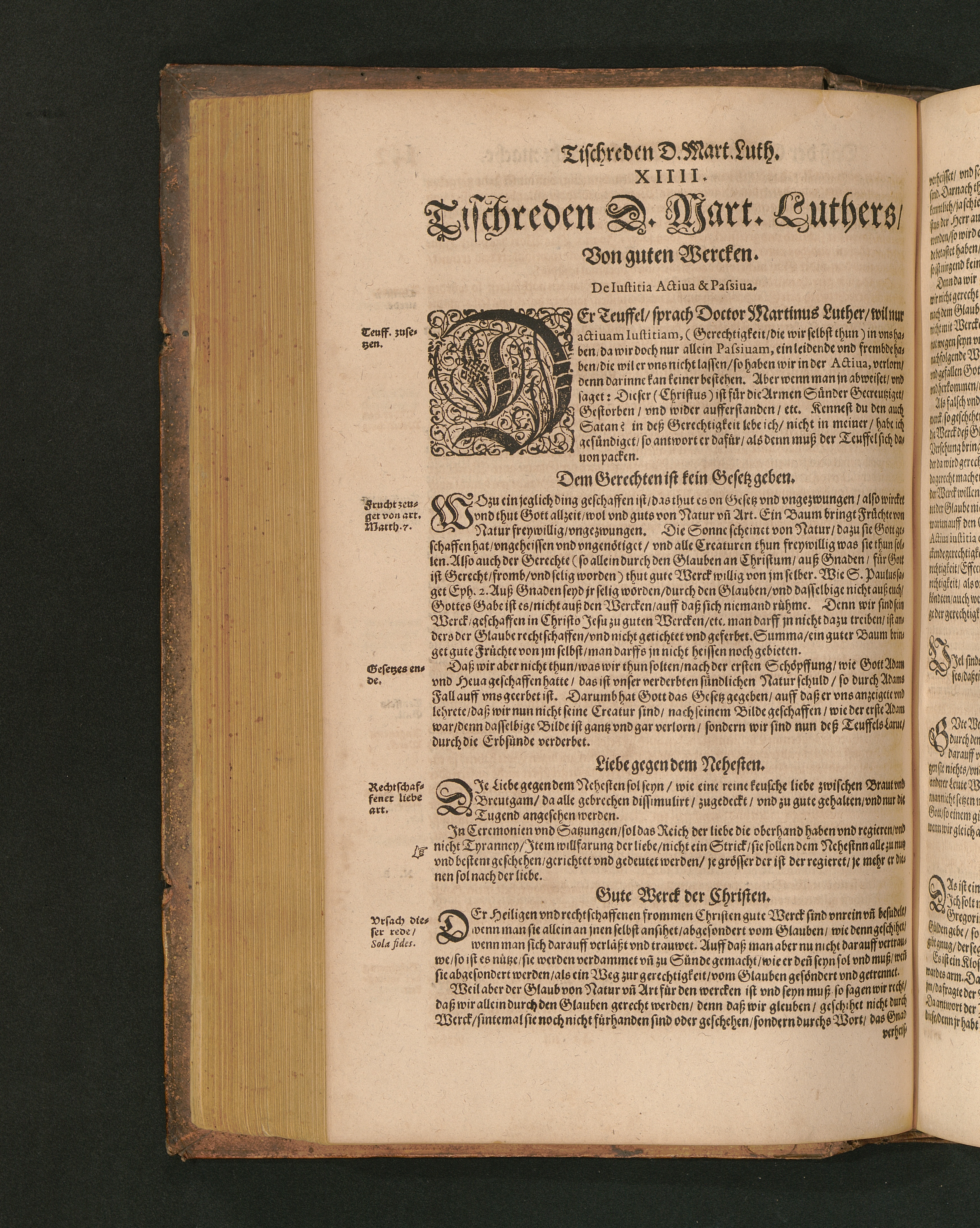 COLLOQVIA || Oder || Tischreden Do=||ctor Martini Lutheri/ : so er in vielen || Jaren/ die Zeit seines Lebens/ gegen Gelehrten Leuthen/ Auch || frembden Gesten vnd seinen Tischgesellen geführet. Darinn von allen Artickeln || vnser Religion/ Auch von hohen Stücken/ Fragen vnd Antwort: Item/|| viel mercklichen Historijs/ vnd sonst von allerley Lehre/ Trost/ Raht/|| vnnd vnterricht/ zu finden.|| / Anfenglichs von M. Anthonio Lauterbach zusammen getragen/ Hernacher in gewisse Locos || Communes verfasset/ vnd auß viel anderer Gelehrter Leute Collectaneis gemehret.|| Durch Johannem Aurifabern.||