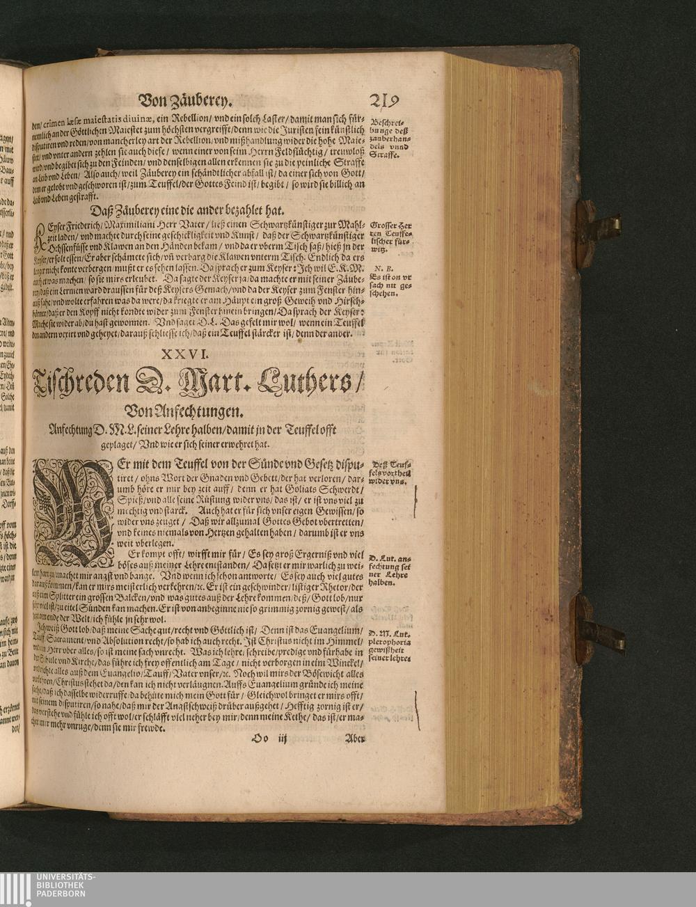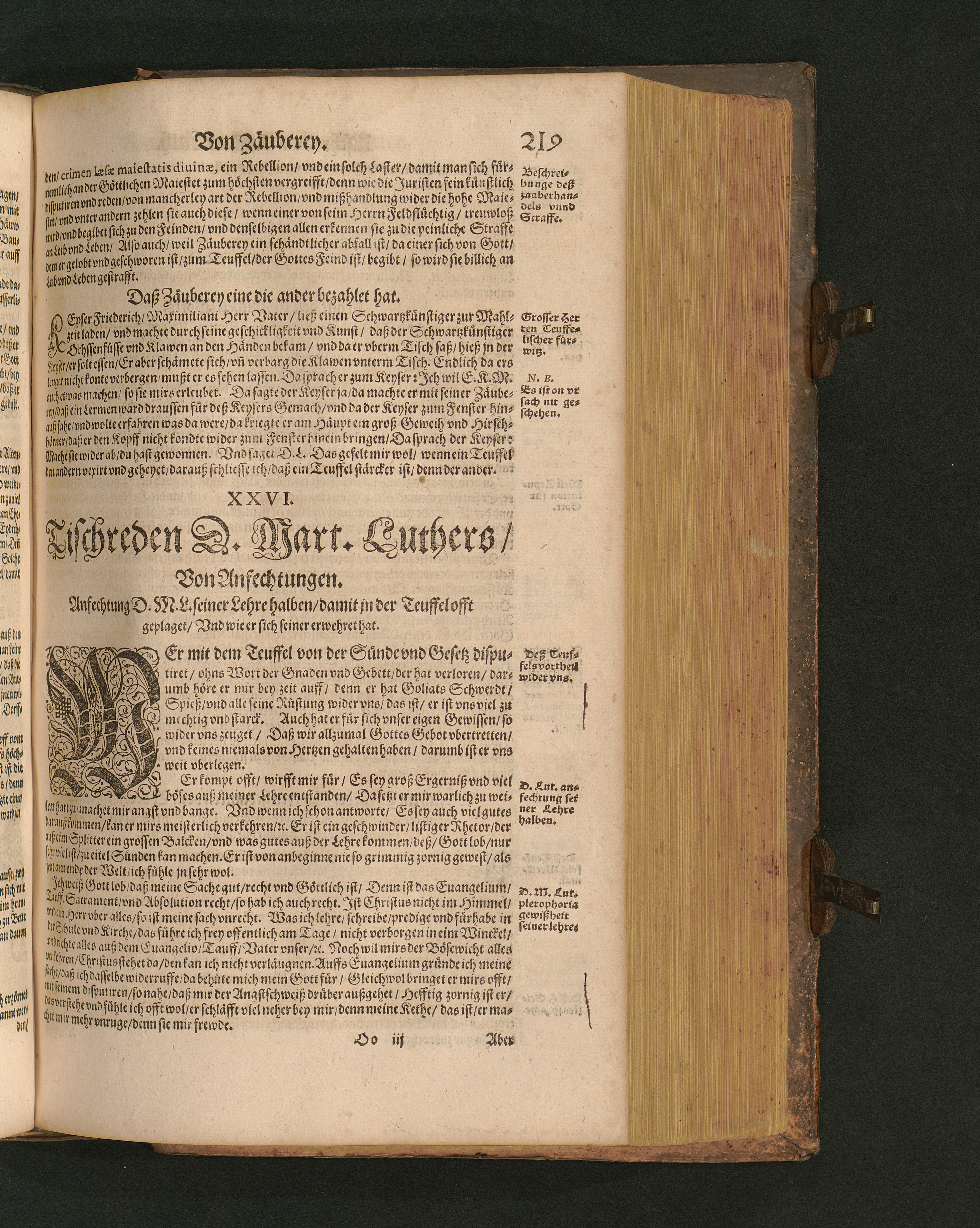 COLLOQVIA || Oder || Tischreden Do=||ctor Martini Lutheri/ : so er in vielen || Jaren/ die Zeit seines Lebens/ gegen Gelehrten Leuthen/ Auch || frembden Gesten vnd seinen Tischgesellen geführet. Darinn von allen Artickeln || vnser Religion/ Auch von hohen Stücken/ Fragen vnd Antwort: Item/|| viel mercklichen Historijs/ vnd sonst von allerley Lehre/ Trost/ Raht/|| vnnd vnterricht/ zu finden.|| / Anfenglichs von M. Anthonio Lauterbach zusammen getragen/ Hernacher in gewisse Locos || Communes verfasset/ vnd auß viel anderer Gelehrter Leute Collectaneis gemehret.|| Durch Johannem Aurifabern.||