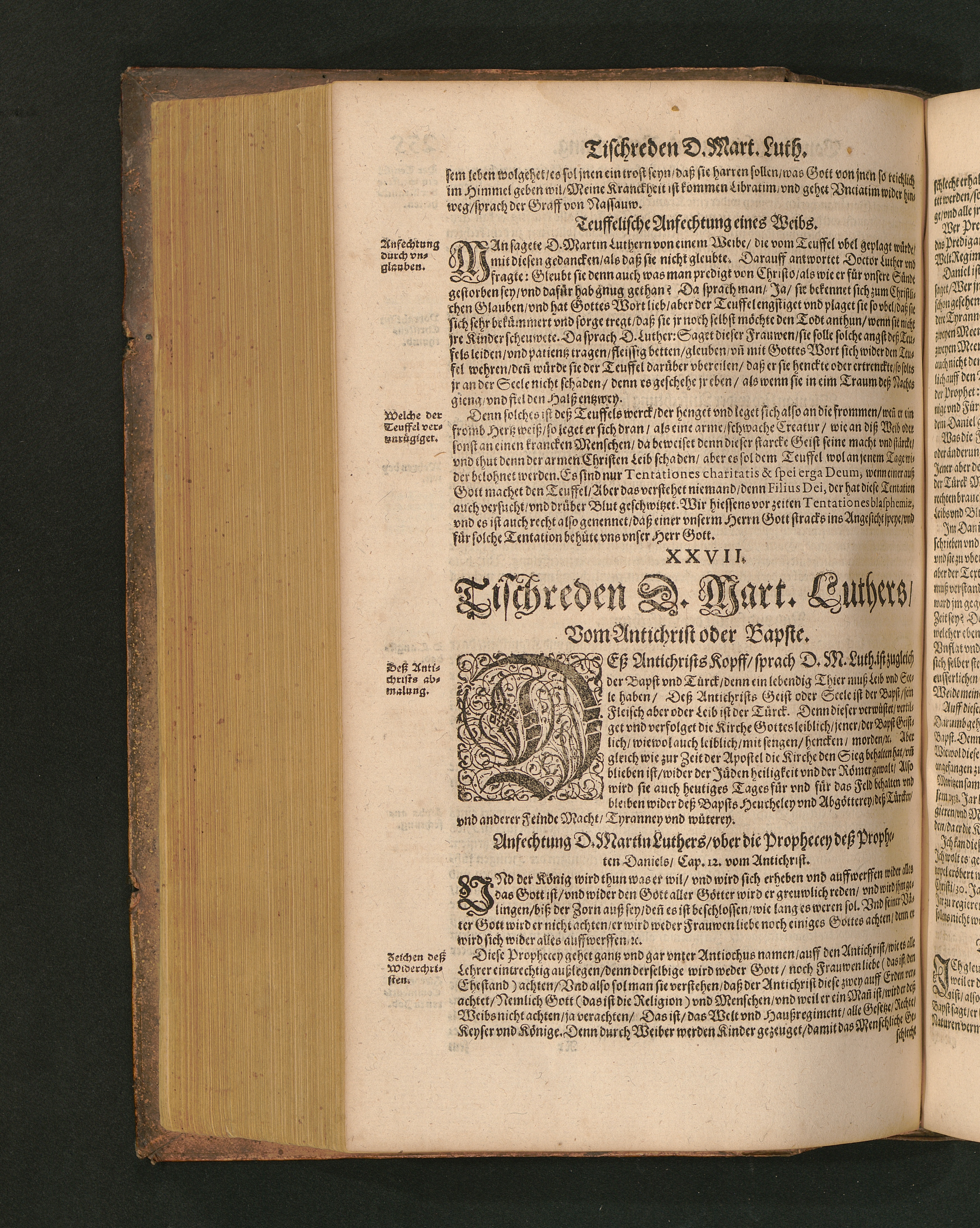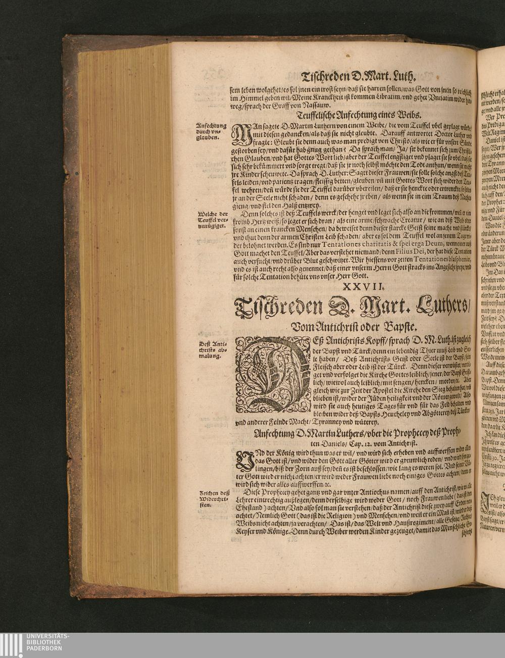 COLLOQVIA || Oder || Tischreden Do=||ctor Martini Lutheri/ : so er in vielen || Jaren/ die Zeit seines Lebens/ gegen Gelehrten Leuthen/ Auch || frembden Gesten vnd seinen Tischgesellen geführet. Darinn von allen Artickeln || vnser Religion/ Auch von hohen Stücken/ Fragen vnd Antwort: Item/|| viel mercklichen Historijs/ vnd sonst von allerley Lehre/ Trost/ Raht/|| vnnd vnterricht/ zu finden.|| / Anfenglichs von M. Anthonio Lauterbach zusammen getragen/ Hernacher in gewisse Locos || Communes verfasset/ vnd auß viel anderer Gelehrter Leute Collectaneis gemehret.|| Durch Johannem Aurifabern.||