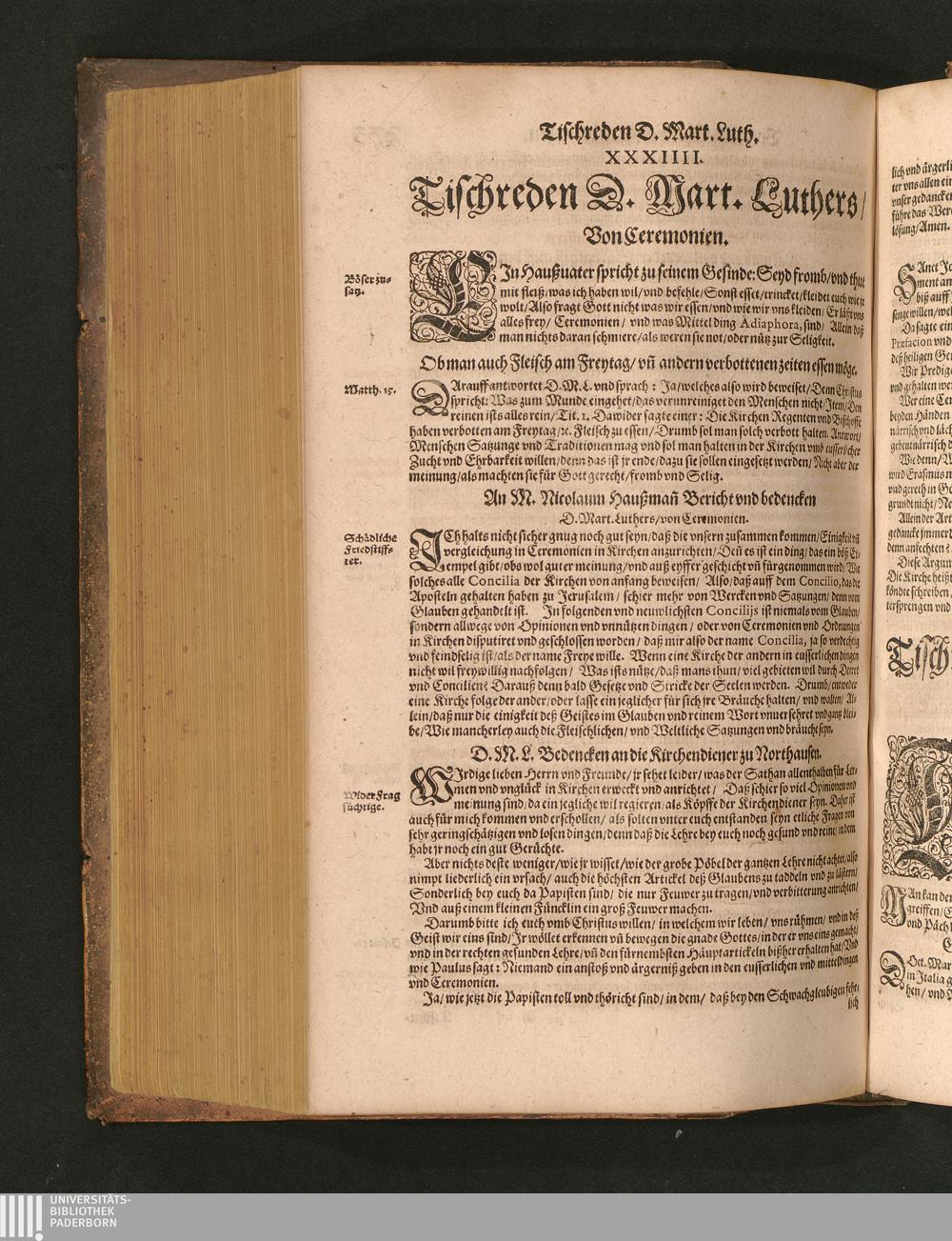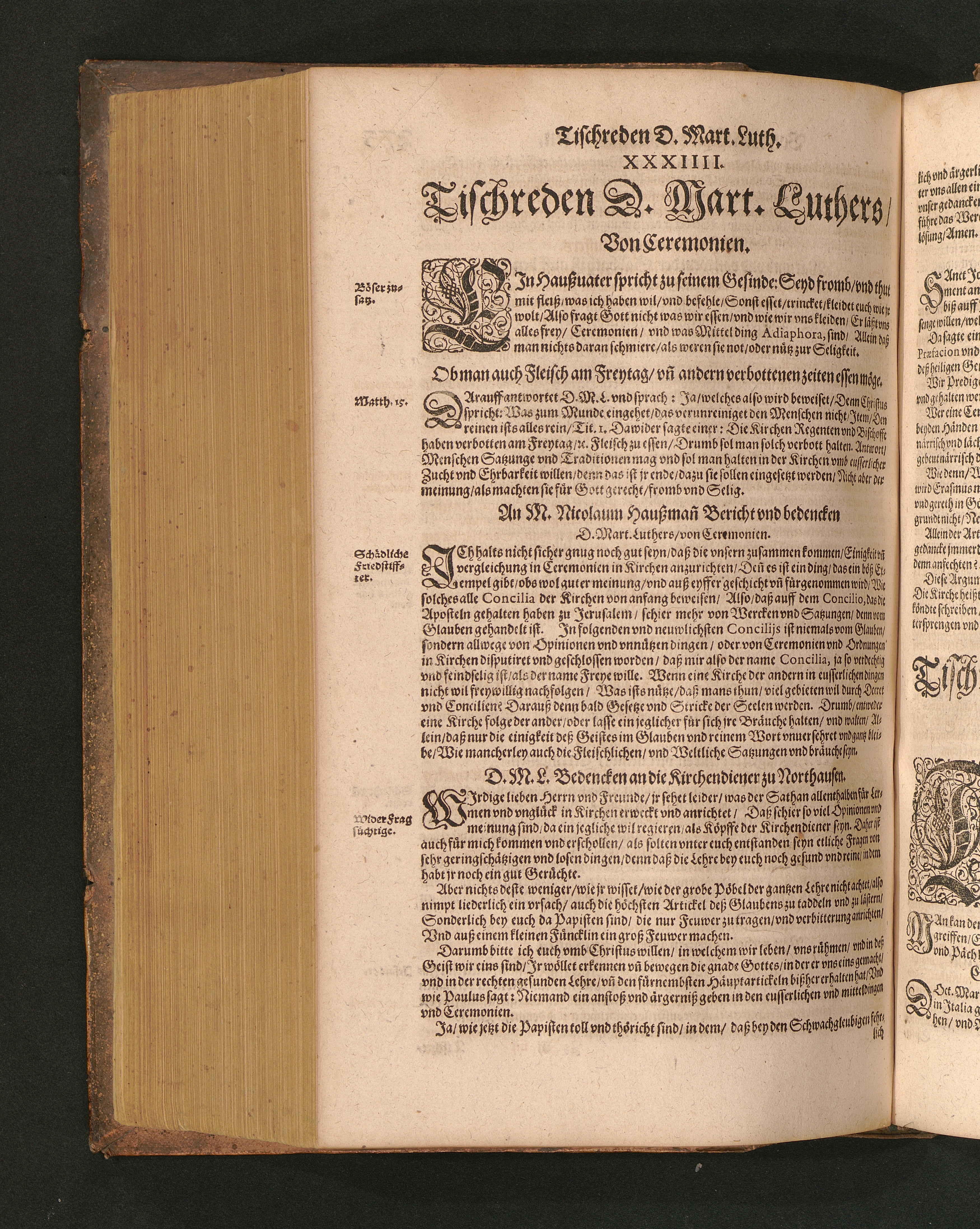 COLLOQVIA || Oder || Tischreden Do=||ctor Martini Lutheri/ : so er in vielen || Jaren/ die Zeit seines Lebens/ gegen Gelehrten Leuthen/ Auch || frembden Gesten vnd seinen Tischgesellen geführet. Darinn von allen Artickeln || vnser Religion/ Auch von hohen Stücken/ Fragen vnd Antwort: Item/|| viel mercklichen Historijs/ vnd sonst von allerley Lehre/ Trost/ Raht/|| vnnd vnterricht/ zu finden.|| / Anfenglichs von M. Anthonio Lauterbach zusammen getragen/ Hernacher in gewisse Locos || Communes verfasset/ vnd auß viel anderer Gelehrter Leute Collectaneis gemehret.|| Durch Johannem Aurifabern.||
