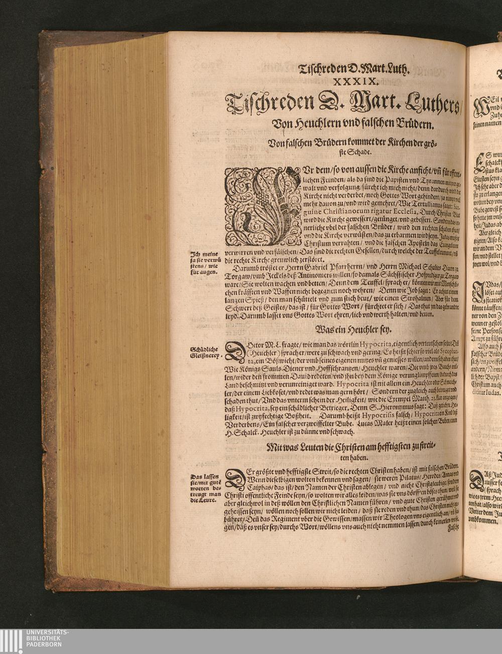 COLLOQVIA || Oder || Tischreden Do=||ctor Martini Lutheri/ : so er in vielen || Jaren/ die Zeit seines Lebens/ gegen Gelehrten Leuthen/ Auch || frembden Gesten vnd seinen Tischgesellen geführet. Darinn von allen Artickeln || vnser Religion/ Auch von hohen Stücken/ Fragen vnd Antwort: Item/|| viel mercklichen Historijs/ vnd sonst von allerley Lehre/ Trost/ Raht/|| vnnd vnterricht/ zu finden.|| / Anfenglichs von M. Anthonio Lauterbach zusammen getragen/ Hernacher in gewisse Locos || Communes verfasset/ vnd auß viel anderer Gelehrter Leute Collectaneis gemehret.|| Durch Johannem Aurifabern.||