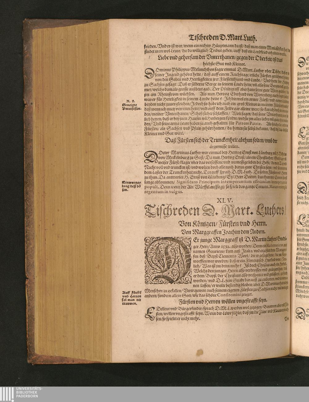 COLLOQVIA || Oder || Tischreden Do=||ctor Martini Lutheri/ : so er in vielen || Jaren/ die Zeit seines Lebens/ gegen Gelehrten Leuthen/ Auch || frembden Gesten vnd seinen Tischgesellen geführet. Darinn von allen Artickeln || vnser Religion/ Auch von hohen Stücken/ Fragen vnd Antwort: Item/|| viel mercklichen Historijs/ vnd sonst von allerley Lehre/ Trost/ Raht/|| vnnd vnterricht/ zu finden.|| / Anfenglichs von M. Anthonio Lauterbach zusammen getragen/ Hernacher in gewisse Locos || Communes verfasset/ vnd auß viel anderer Gelehrter Leute Collectaneis gemehret.|| Durch Johannem Aurifabern.||