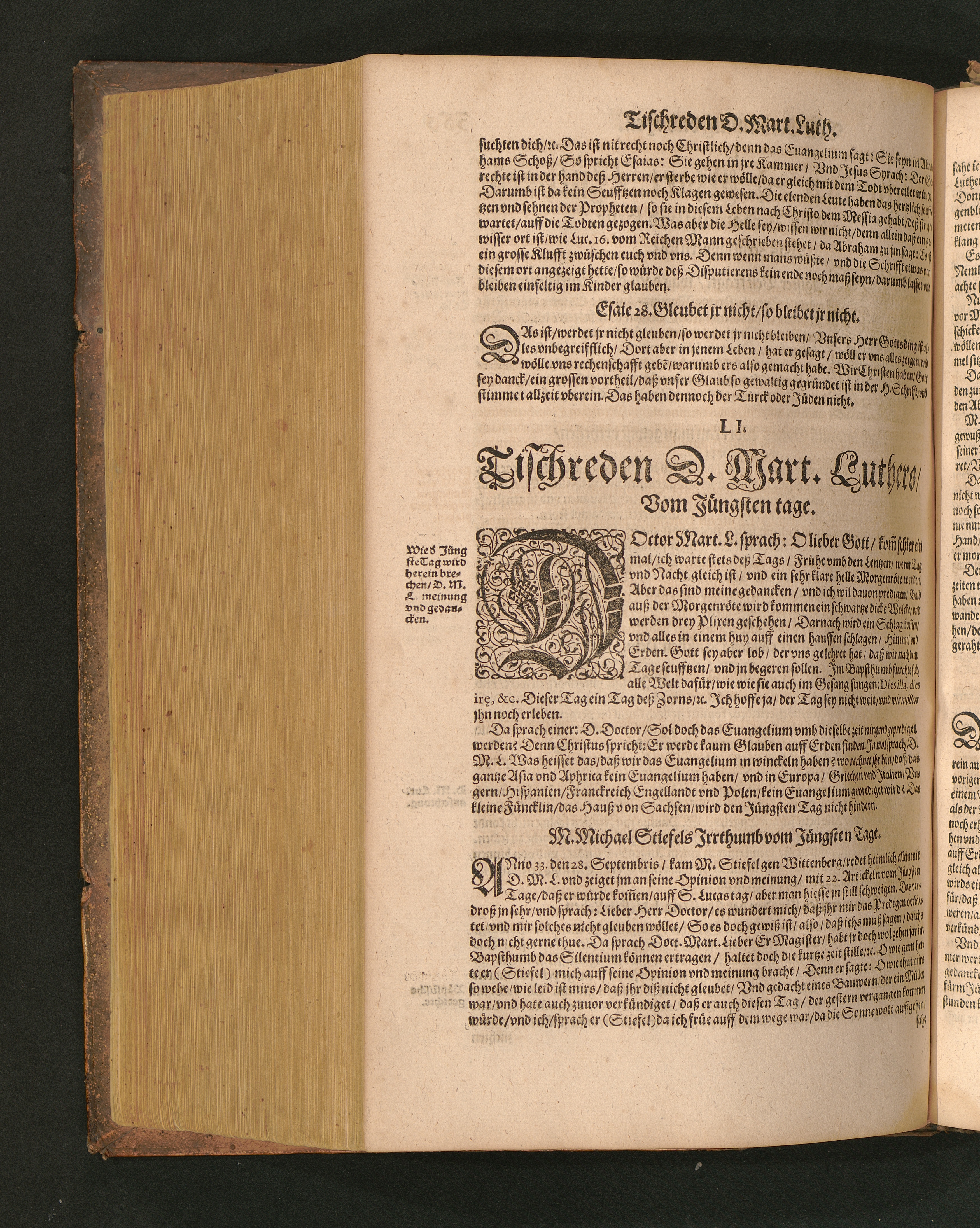 COLLOQVIA || Oder || Tischreden Do=||ctor Martini Lutheri/ : so er in vielen || Jaren/ die Zeit seines Lebens/ gegen Gelehrten Leuthen/ Auch || frembden Gesten vnd seinen Tischgesellen geführet. Darinn von allen Artickeln || vnser Religion/ Auch von hohen Stücken/ Fragen vnd Antwort: Item/|| viel mercklichen Historijs/ vnd sonst von allerley Lehre/ Trost/ Raht/|| vnnd vnterricht/ zu finden.|| / Anfenglichs von M. Anthonio Lauterbach zusammen getragen/ Hernacher in gewisse Locos || Communes verfasset/ vnd auß viel anderer Gelehrter Leute Collectaneis gemehret.|| Durch Johannem Aurifabern.||
