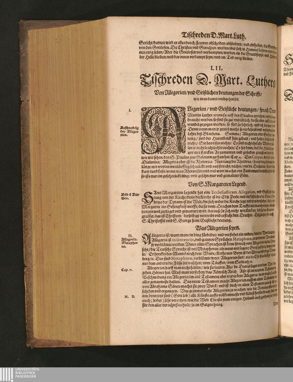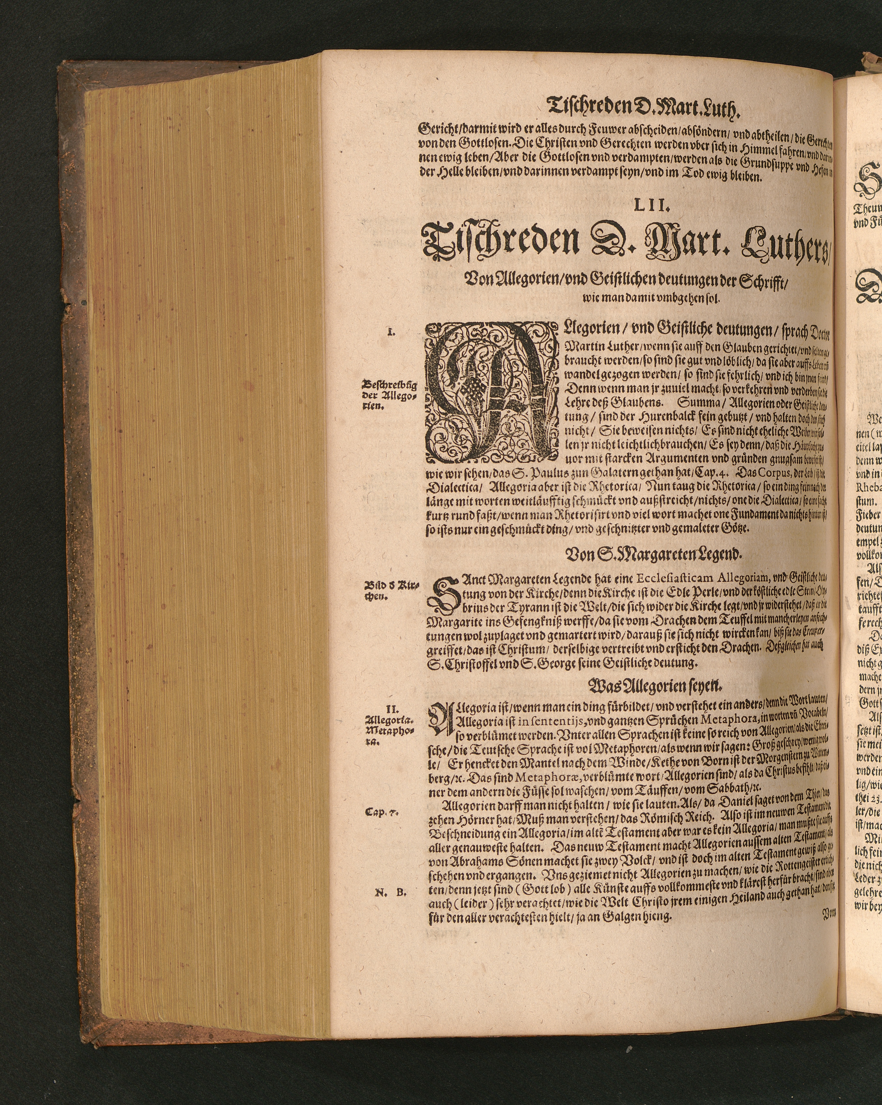 COLLOQVIA || Oder || Tischreden Do=||ctor Martini Lutheri/ : so er in vielen || Jaren/ die Zeit seines Lebens/ gegen Gelehrten Leuthen/ Auch || frembden Gesten vnd seinen Tischgesellen geführet. Darinn von allen Artickeln || vnser Religion/ Auch von hohen Stücken/ Fragen vnd Antwort: Item/|| viel mercklichen Historijs/ vnd sonst von allerley Lehre/ Trost/ Raht/|| vnnd vnterricht/ zu finden.|| / Anfenglichs von M. Anthonio Lauterbach zusammen getragen/ Hernacher in gewisse Locos || Communes verfasset/ vnd auß viel anderer Gelehrter Leute Collectaneis gemehret.|| Durch Johannem Aurifabern.||
