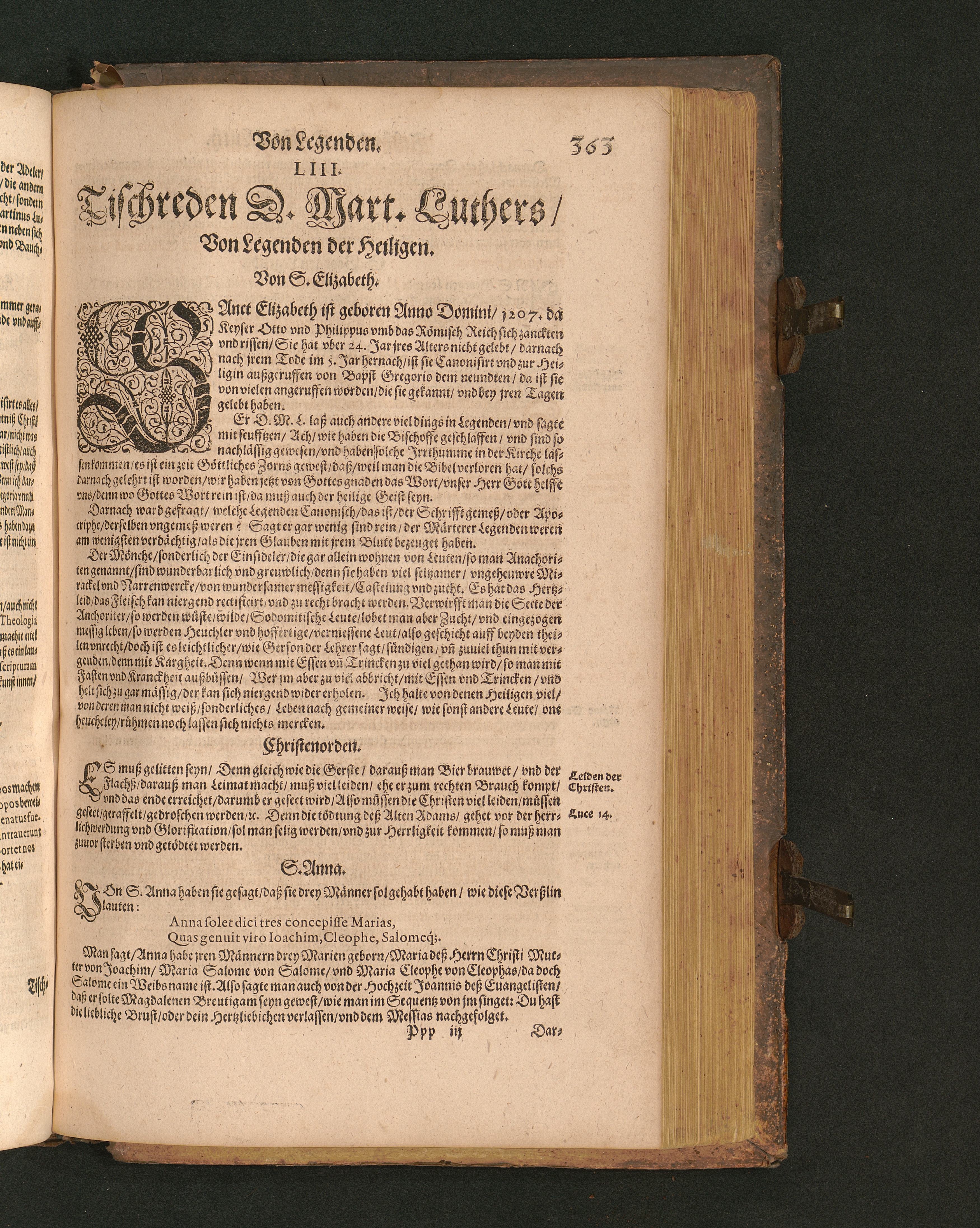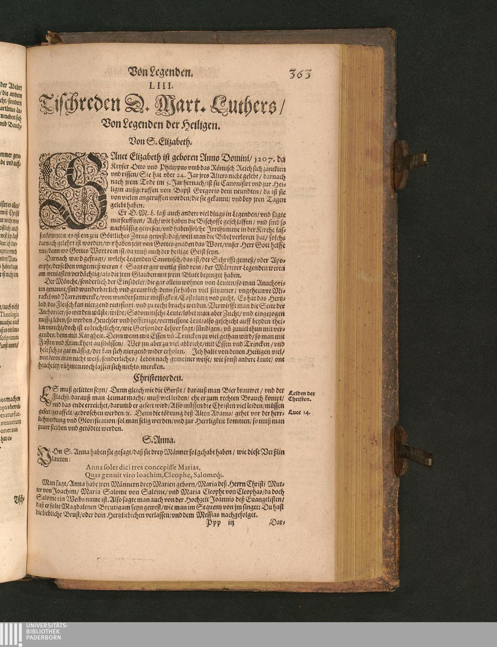 COLLOQVIA || Oder || Tischreden Do=||ctor Martini Lutheri/ : so er in vielen || Jaren/ die Zeit seines Lebens/ gegen Gelehrten Leuthen/ Auch || frembden Gesten vnd seinen Tischgesellen geführet. Darinn von allen Artickeln || vnser Religion/ Auch von hohen Stücken/ Fragen vnd Antwort: Item/|| viel mercklichen Historijs/ vnd sonst von allerley Lehre/ Trost/ Raht/|| vnnd vnterricht/ zu finden.|| / Anfenglichs von M. Anthonio Lauterbach zusammen getragen/ Hernacher in gewisse Locos || Communes verfasset/ vnd auß viel anderer Gelehrter Leute Collectaneis gemehret.|| Durch Johannem Aurifabern.||
