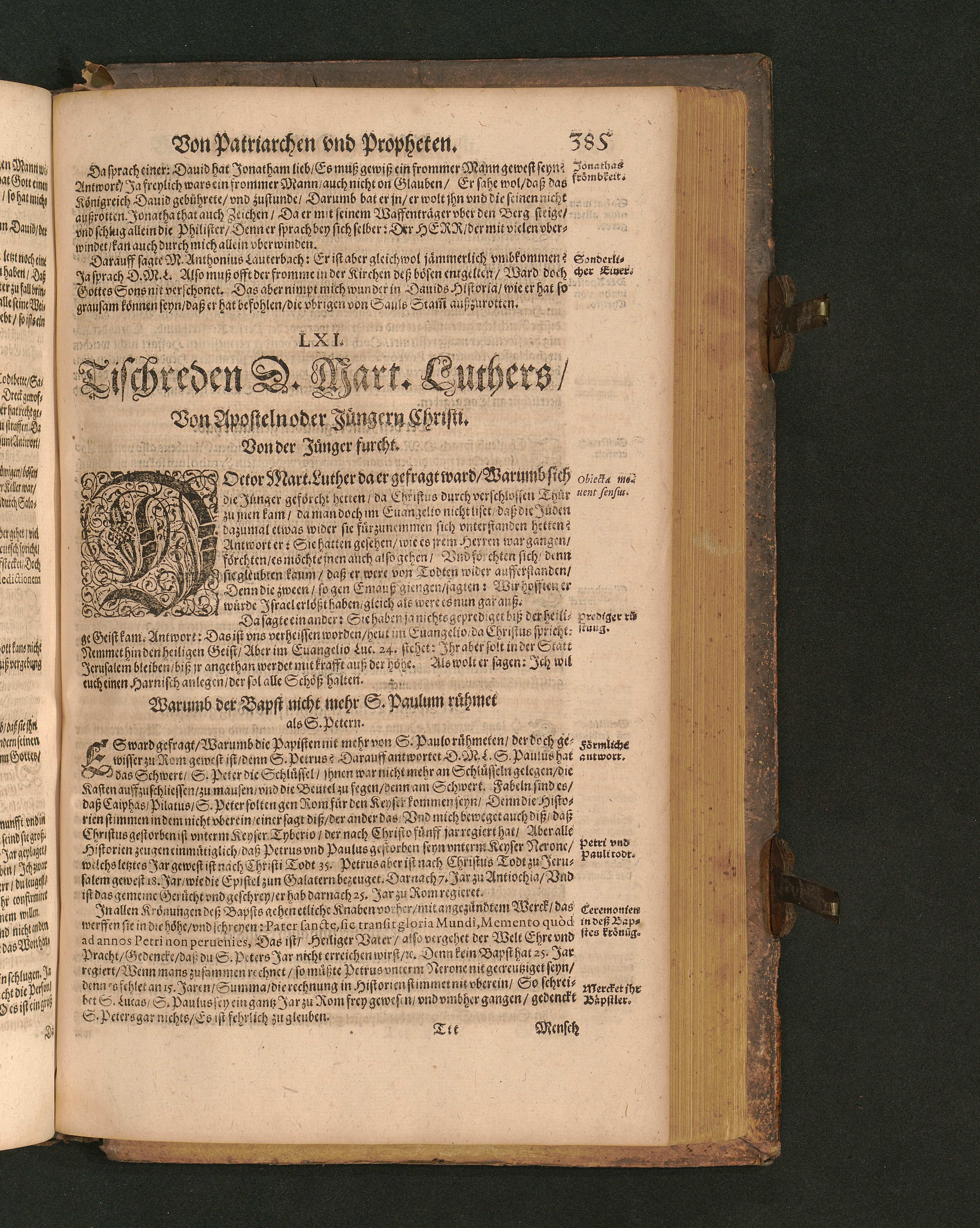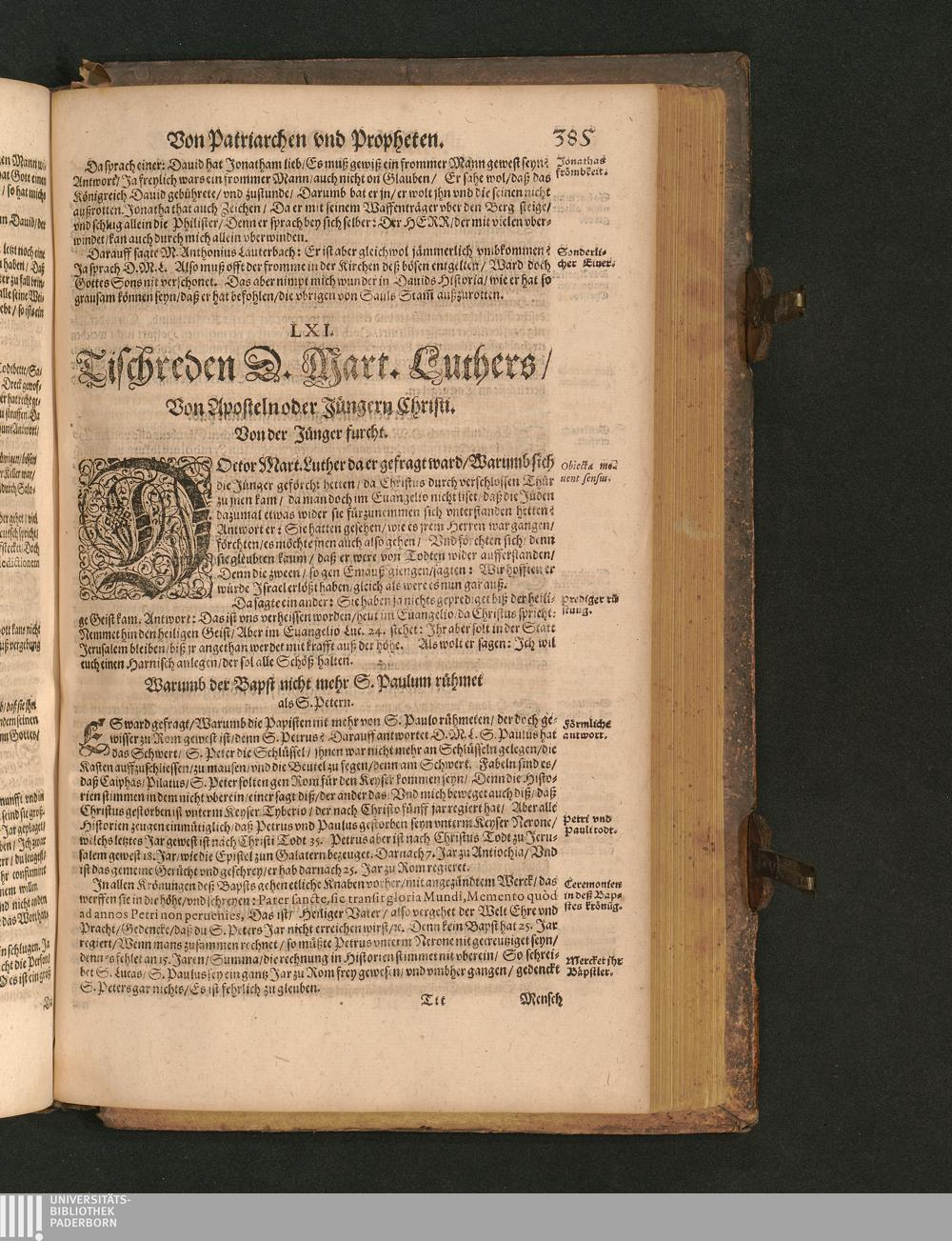 COLLOQVIA || Oder || Tischreden Do=||ctor Martini Lutheri/ : so er in vielen || Jaren/ die Zeit seines Lebens/ gegen Gelehrten Leuthen/ Auch || frembden Gesten vnd seinen Tischgesellen geführet. Darinn von allen Artickeln || vnser Religion/ Auch von hohen Stücken/ Fragen vnd Antwort: Item/|| viel mercklichen Historijs/ vnd sonst von allerley Lehre/ Trost/ Raht/|| vnnd vnterricht/ zu finden.|| / Anfenglichs von M. Anthonio Lauterbach zusammen getragen/ Hernacher in gewisse Locos || Communes verfasset/ vnd auß viel anderer Gelehrter Leute Collectaneis gemehret.|| Durch Johannem Aurifabern.||