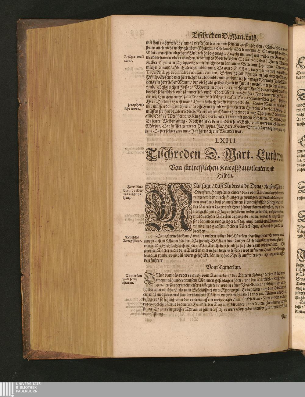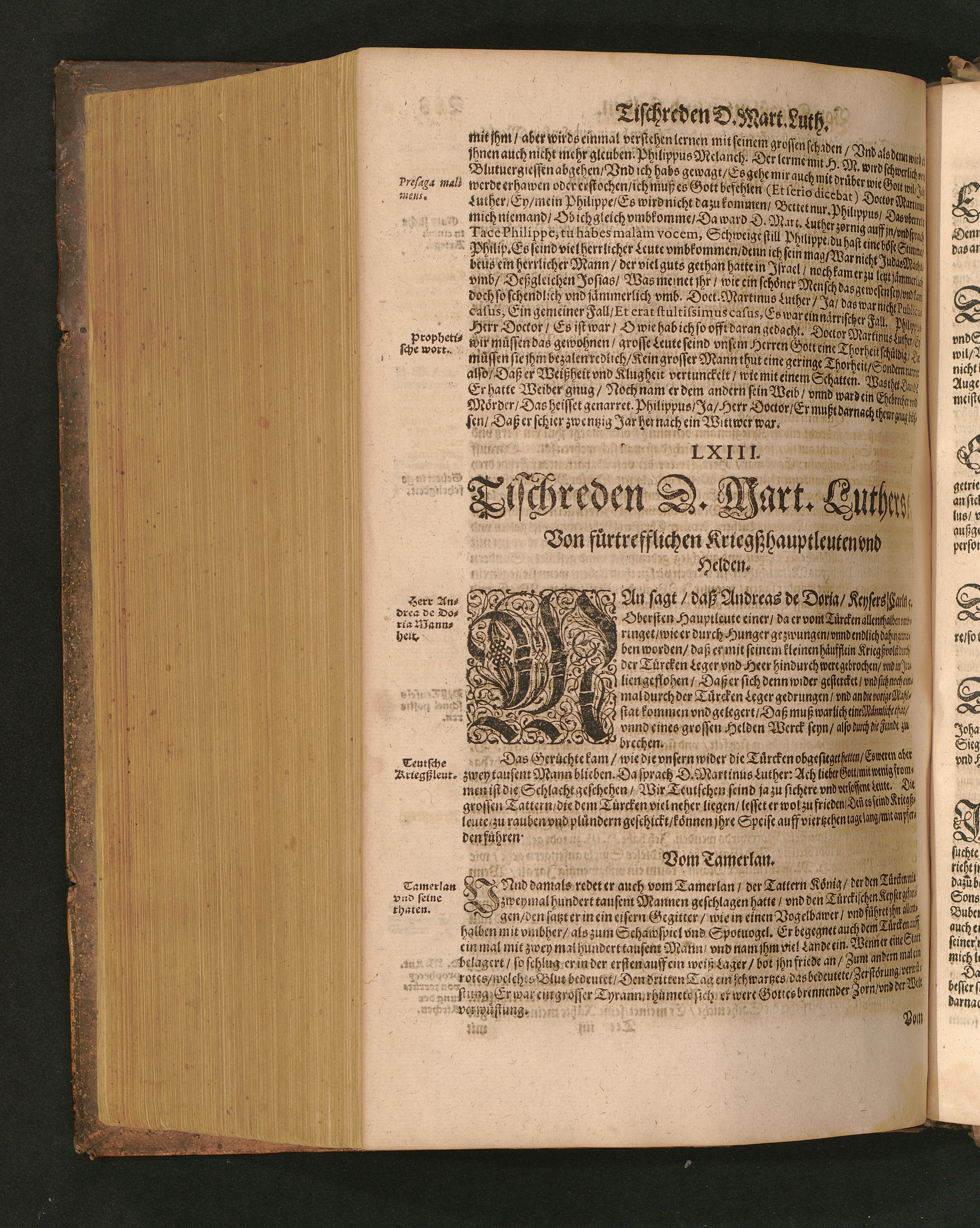 COLLOQVIA || Oder || Tischreden Do=||ctor Martini Lutheri/ : so er in vielen || Jaren/ die Zeit seines Lebens/ gegen Gelehrten Leuthen/ Auch || frembden Gesten vnd seinen Tischgesellen geführet. Darinn von allen Artickeln || vnser Religion/ Auch von hohen Stücken/ Fragen vnd Antwort: Item/|| viel mercklichen Historijs/ vnd sonst von allerley Lehre/ Trost/ Raht/|| vnnd vnterricht/ zu finden.|| / Anfenglichs von M. Anthonio Lauterbach zusammen getragen/ Hernacher in gewisse Locos || Communes verfasset/ vnd auß viel anderer Gelehrter Leute Collectaneis gemehret.|| Durch Johannem Aurifabern.||