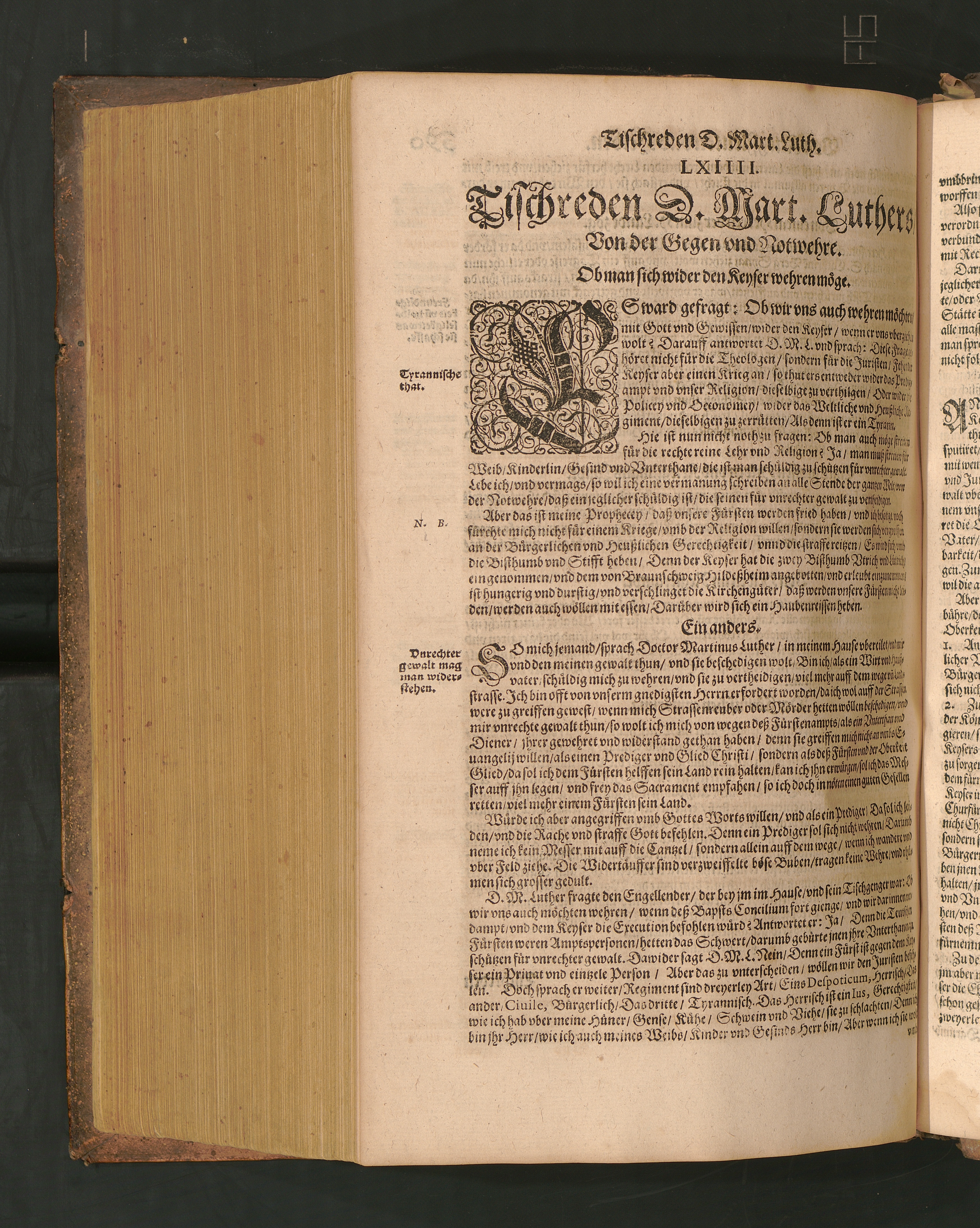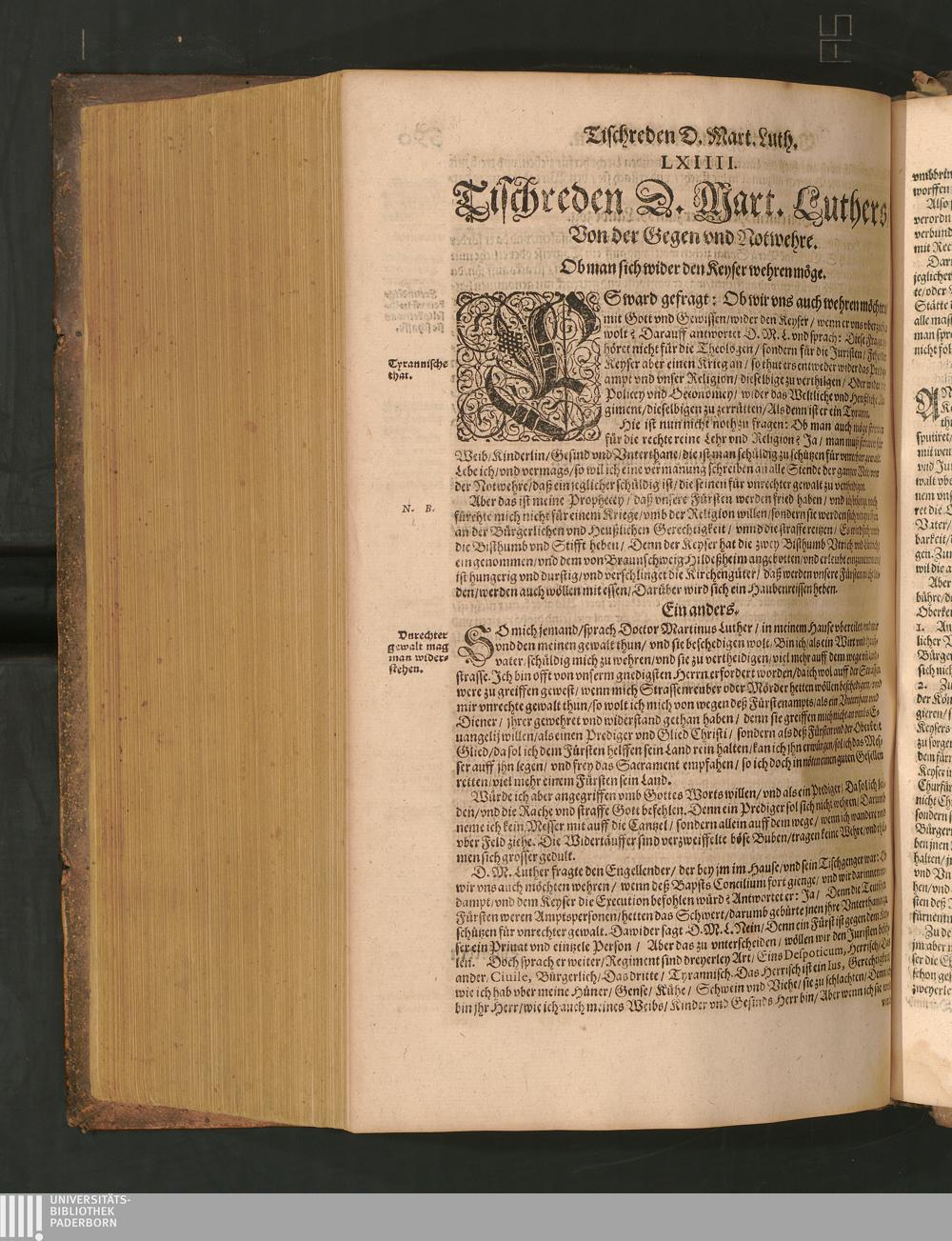 COLLOQVIA || Oder || Tischreden Do=||ctor Martini Lutheri/ : so er in vielen || Jaren/ die Zeit seines Lebens/ gegen Gelehrten Leuthen/ Auch || frembden Gesten vnd seinen Tischgesellen geführet. Darinn von allen Artickeln || vnser Religion/ Auch von hohen Stücken/ Fragen vnd Antwort: Item/|| viel mercklichen Historijs/ vnd sonst von allerley Lehre/ Trost/ Raht/|| vnnd vnterricht/ zu finden.|| / Anfenglichs von M. Anthonio Lauterbach zusammen getragen/ Hernacher in gewisse Locos || Communes verfasset/ vnd auß viel anderer Gelehrter Leute Collectaneis gemehret.|| Durch Johannem Aurifabern.||