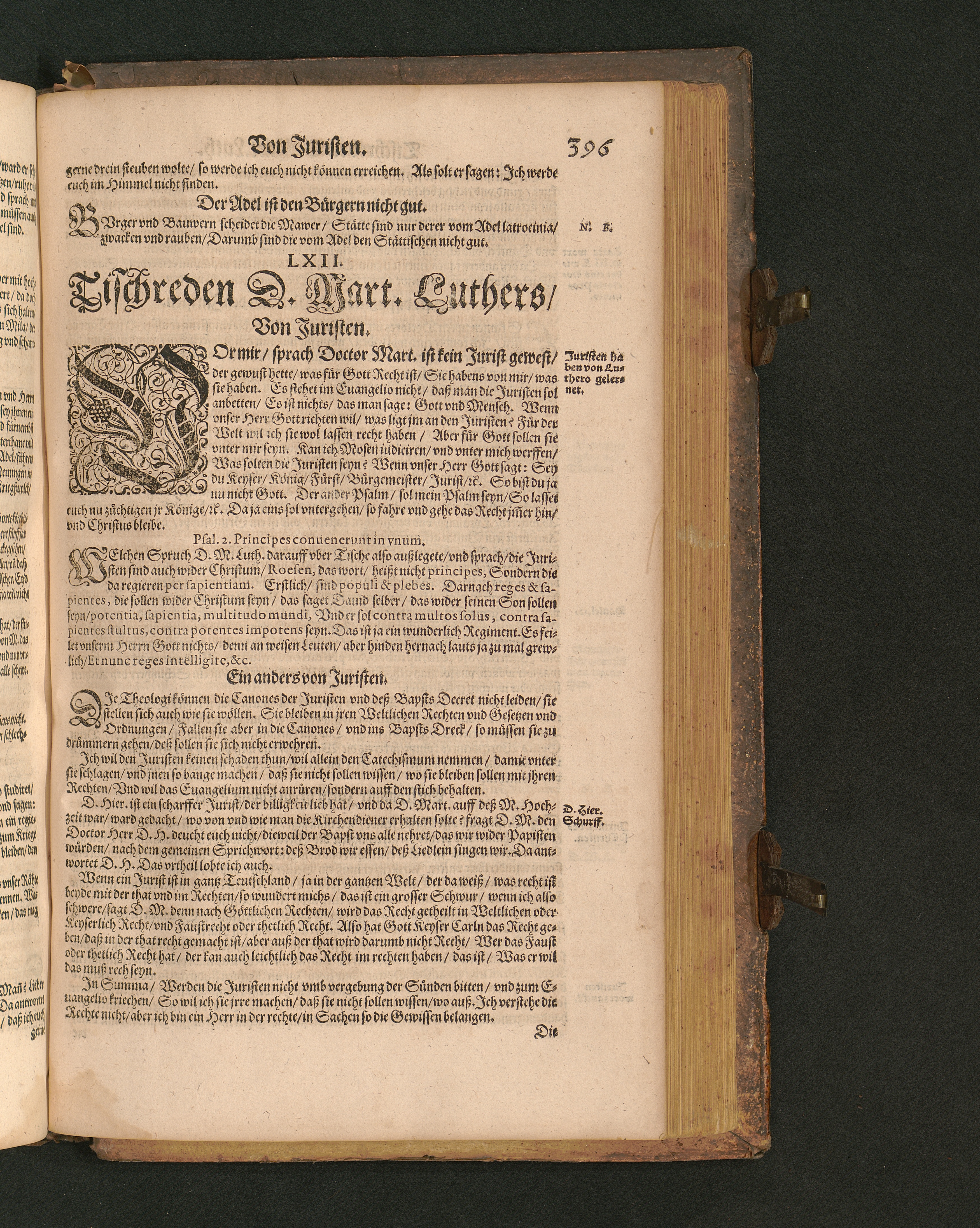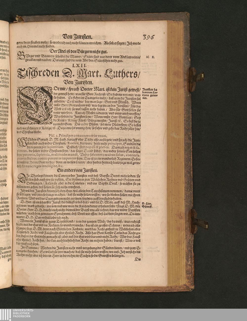 COLLOQVIA || Oder || Tischreden Do=||ctor Martini Lutheri/ : so er in vielen || Jaren/ die Zeit seines Lebens/ gegen Gelehrten Leuthen/ Auch || frembden Gesten vnd seinen Tischgesellen geführet. Darinn von allen Artickeln || vnser Religion/ Auch von hohen Stücken/ Fragen vnd Antwort: Item/|| viel mercklichen Historijs/ vnd sonst von allerley Lehre/ Trost/ Raht/|| vnnd vnterricht/ zu finden.|| / Anfenglichs von M. Anthonio Lauterbach zusammen getragen/ Hernacher in gewisse Locos || Communes verfasset/ vnd auß viel anderer Gelehrter Leute Collectaneis gemehret.|| Durch Johannem Aurifabern.||
