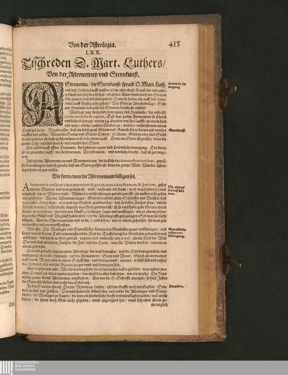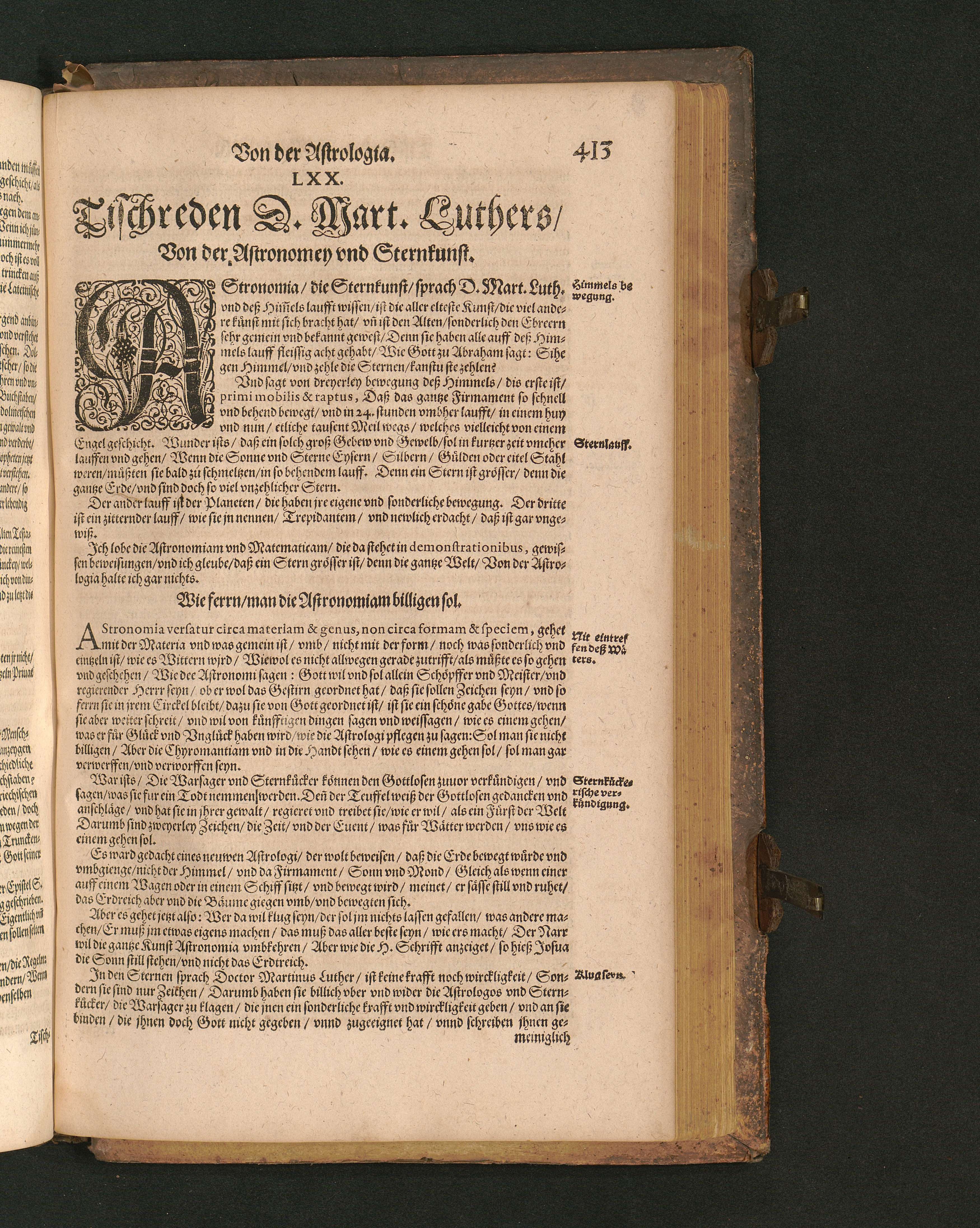 COLLOQVIA || Oder || Tischreden Do=||ctor Martini Lutheri/ : so er in vielen || Jaren/ die Zeit seines Lebens/ gegen Gelehrten Leuthen/ Auch || frembden Gesten vnd seinen Tischgesellen geführet. Darinn von allen Artickeln || vnser Religion/ Auch von hohen Stücken/ Fragen vnd Antwort: Item/|| viel mercklichen Historijs/ vnd sonst von allerley Lehre/ Trost/ Raht/|| vnnd vnterricht/ zu finden.|| / Anfenglichs von M. Anthonio Lauterbach zusammen getragen/ Hernacher in gewisse Locos || Communes verfasset/ vnd auß viel anderer Gelehrter Leute Collectaneis gemehret.|| Durch Johannem Aurifabern.||