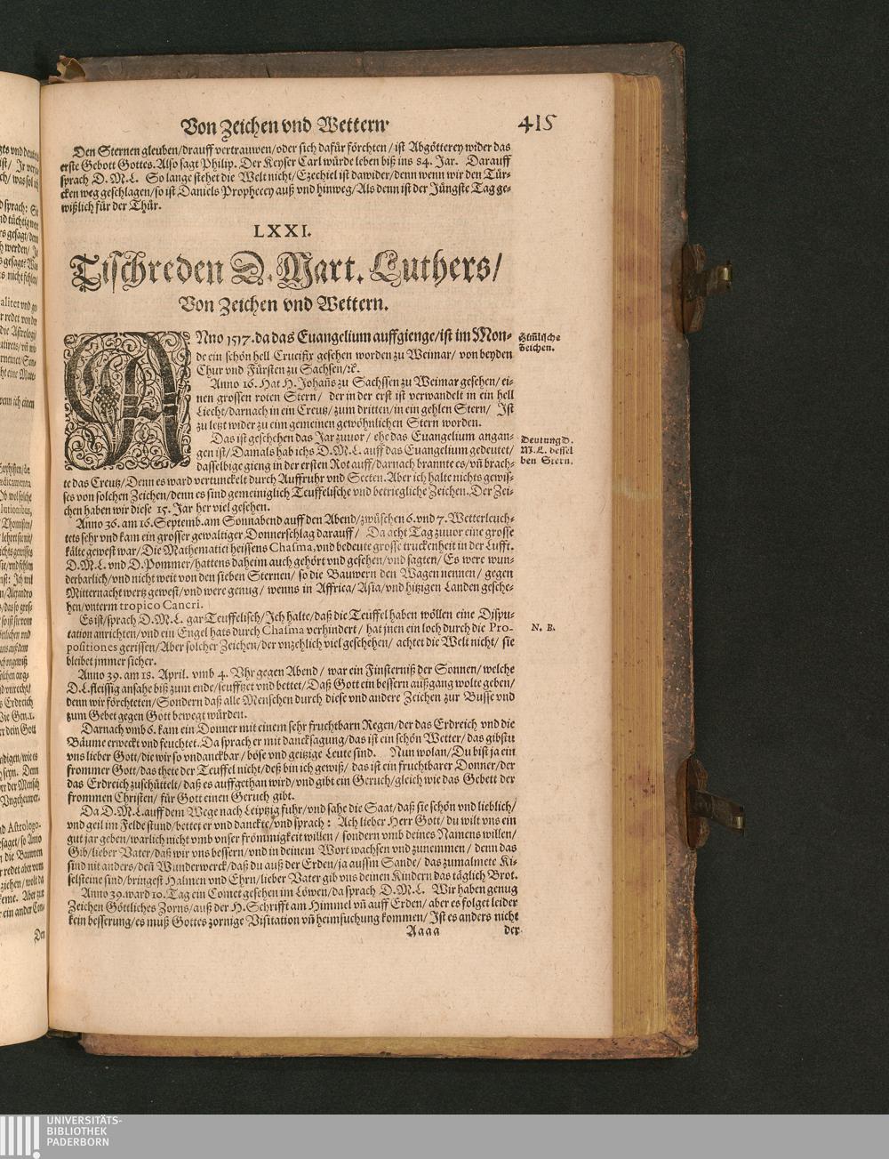 COLLOQVIA || Oder || Tischreden Do=||ctor Martini Lutheri/ : so er in vielen || Jaren/ die Zeit seines Lebens/ gegen Gelehrten Leuthen/ Auch || frembden Gesten vnd seinen Tischgesellen geführet. Darinn von allen Artickeln || vnser Religion/ Auch von hohen Stücken/ Fragen vnd Antwort: Item/|| viel mercklichen Historijs/ vnd sonst von allerley Lehre/ Trost/ Raht/|| vnnd vnterricht/ zu finden.|| / Anfenglichs von M. Anthonio Lauterbach zusammen getragen/ Hernacher in gewisse Locos || Communes verfasset/ vnd auß viel anderer Gelehrter Leute Collectaneis gemehret.|| Durch Johannem Aurifabern.||