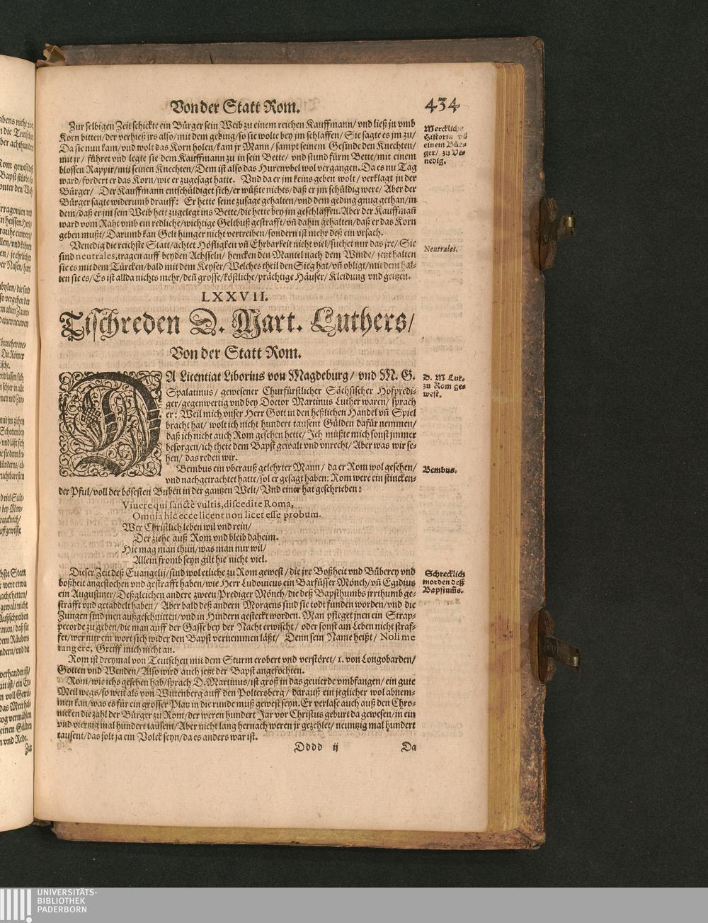 COLLOQVIA || Oder || Tischreden Do=||ctor Martini Lutheri/ : so er in vielen || Jaren/ die Zeit seines Lebens/ gegen Gelehrten Leuthen/ Auch || frembden Gesten vnd seinen Tischgesellen geführet. Darinn von allen Artickeln || vnser Religion/ Auch von hohen Stücken/ Fragen vnd Antwort: Item/|| viel mercklichen Historijs/ vnd sonst von allerley Lehre/ Trost/ Raht/|| vnnd vnterricht/ zu finden.|| / Anfenglichs von M. Anthonio Lauterbach zusammen getragen/ Hernacher in gewisse Locos || Communes verfasset/ vnd auß viel anderer Gelehrter Leute Collectaneis gemehret.|| Durch Johannem Aurifabern.||