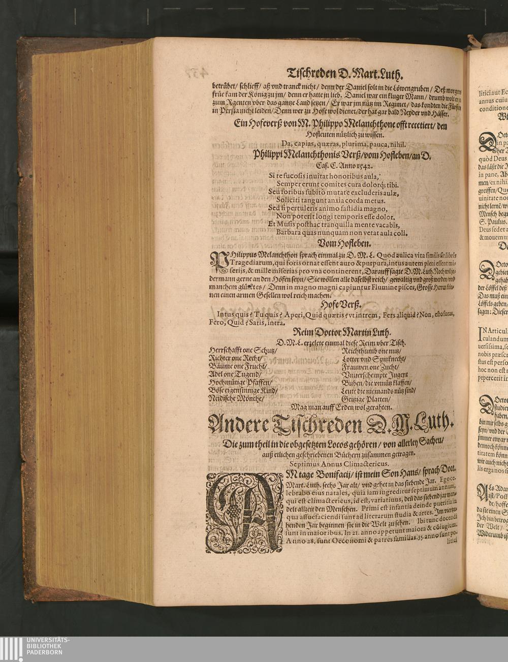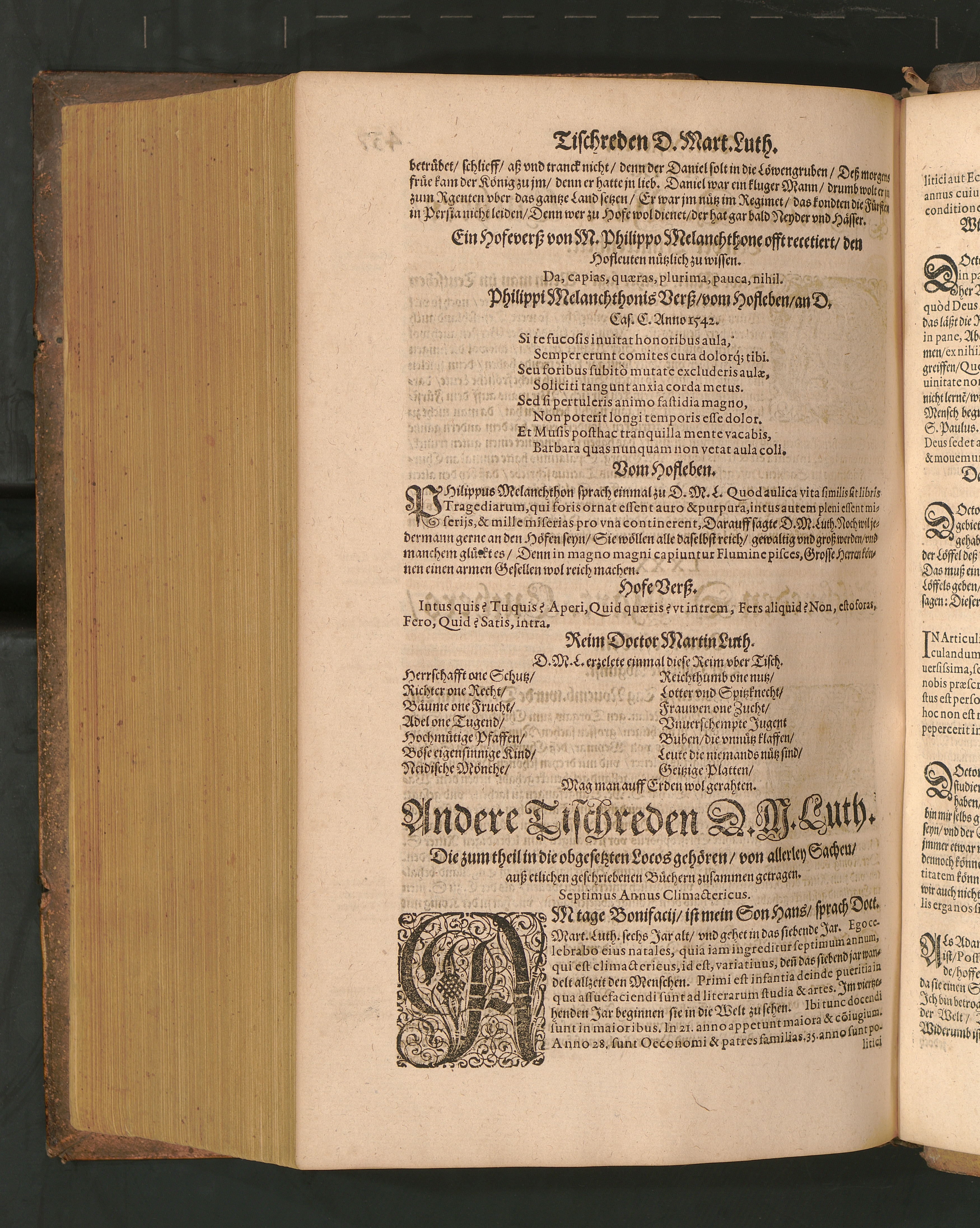 COLLOQVIA || Oder || Tischreden Do=||ctor Martini Lutheri/ : so er in vielen || Jaren/ die Zeit seines Lebens/ gegen Gelehrten Leuthen/ Auch || frembden Gesten vnd seinen Tischgesellen geführet. Darinn von allen Artickeln || vnser Religion/ Auch von hohen Stücken/ Fragen vnd Antwort: Item/|| viel mercklichen Historijs/ vnd sonst von allerley Lehre/ Trost/ Raht/|| vnnd vnterricht/ zu finden.|| / Anfenglichs von M. Anthonio Lauterbach zusammen getragen/ Hernacher in gewisse Locos || Communes verfasset/ vnd auß viel anderer Gelehrter Leute Collectaneis gemehret.|| Durch Johannem Aurifabern.||