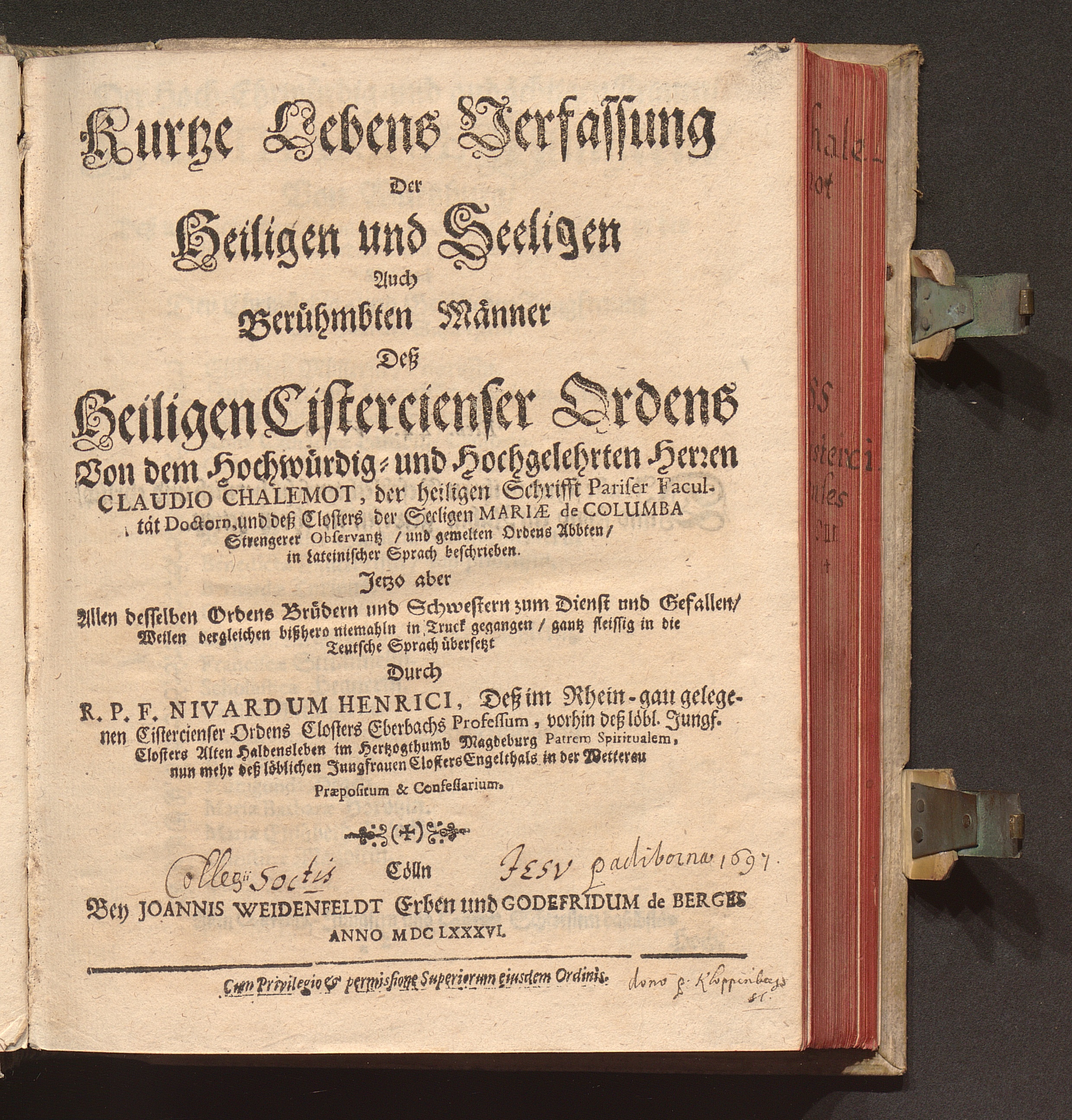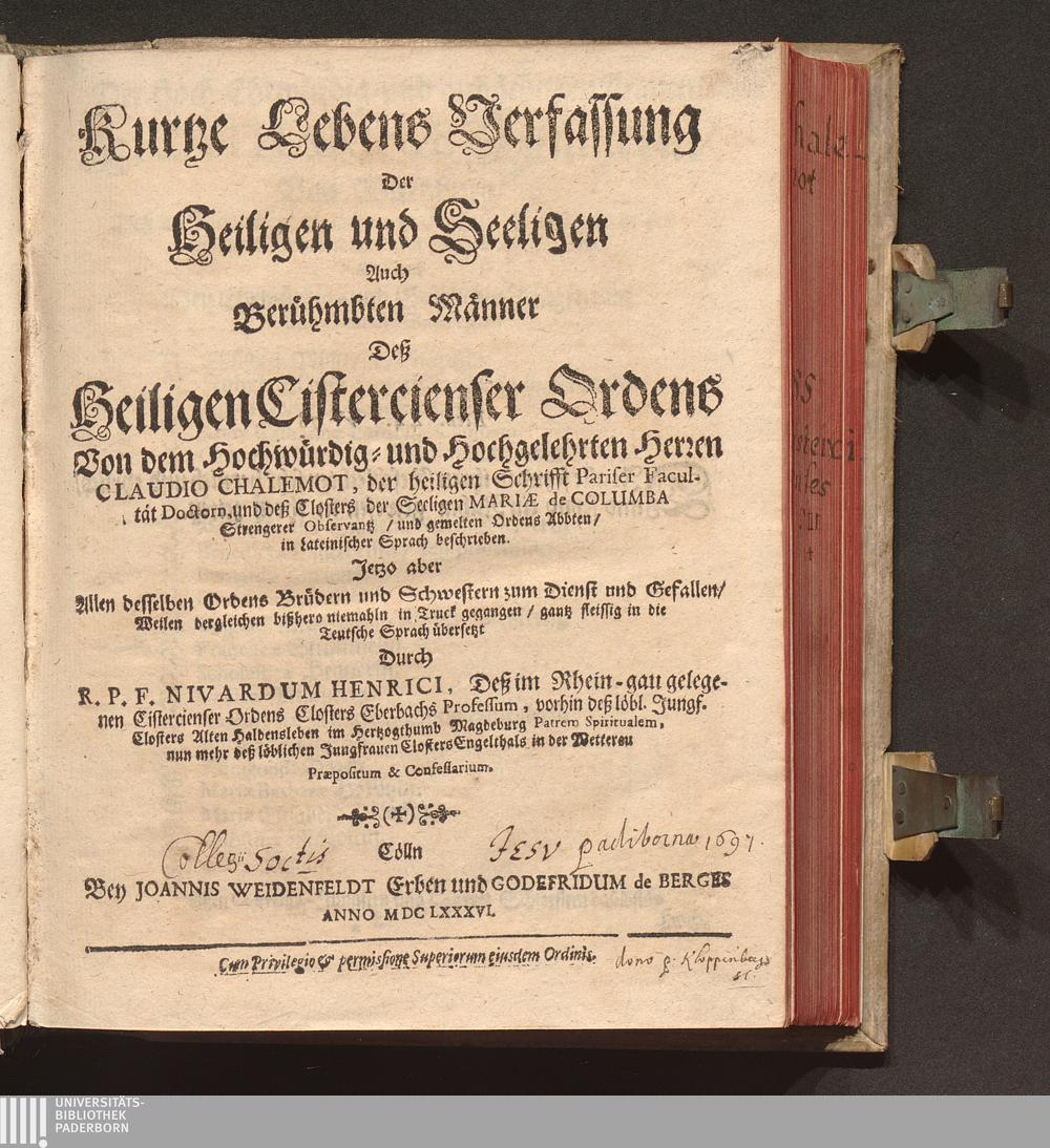 Kurtze Lebens Verfassung Der Heiligen und Seeligen Auch Berühmbten Männer Deß Heiligen Cistercienser Ordens / Von dem Hochwürdig- und Hochgelehrten Herren Claudio Chalemot, der heiligen Schrifft Pariser Facultät Doctorn, und deß Closters der Seeligen Mariæ de Columba Strengerer Observantz/ und gemelten Ordens Abbten/ in Lateinischer Sprach beschrieben. Jetzo aber ... gantz fleissig in die Teutsche Sprach übersetzt Durch R. P. F. Nivardum Henrici, Deß im Rhein-gau gelegenen Cistercienser Ordens Closters Eberbachs Professum ...