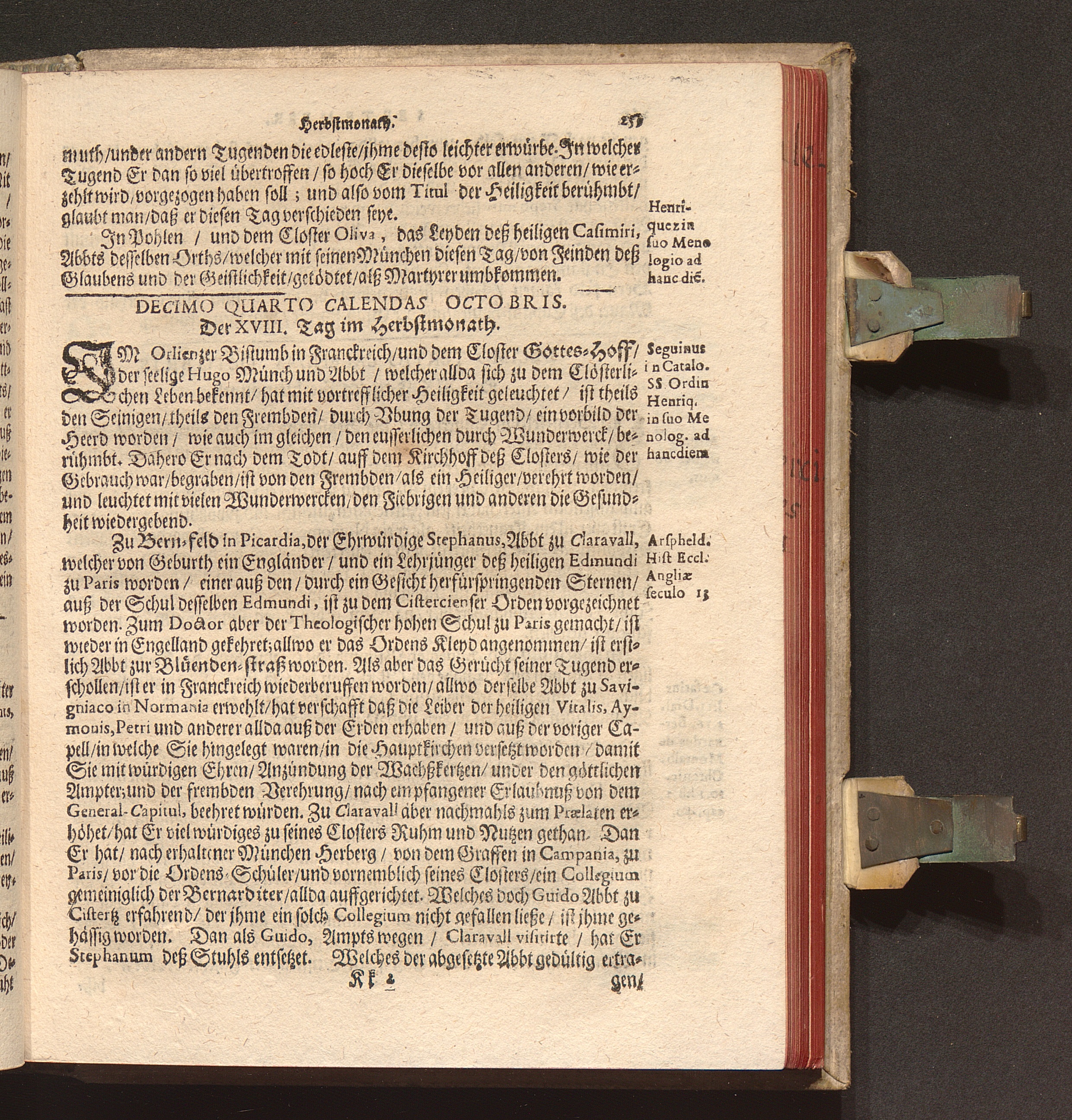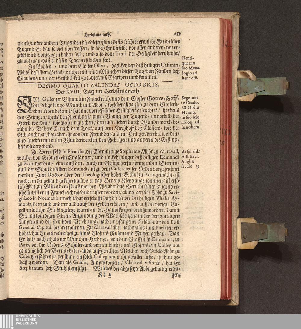 Kurtze Lebens Verfassung Der Heiligen und Seeligen Auch Berühmbten Männer Deß Heiligen Cistercienser Ordens / Von dem Hochwürdig- und Hochgelehrten Herren Claudio Chalemot, der heiligen Schrifft Pariser Facultät Doctorn, und deß Closters der Seeligen Mariæ de Columba Strengerer Observantz/ und gemelten Ordens Abbten/ in Lateinischer Sprach beschrieben. Jetzo aber ... gantz fleissig in die Teutsche Sprach übersetzt Durch R. P. F. Nivardum Henrici, Deß im Rhein-gau gelegenen Cistercienser Ordens Closters Eberbachs Professum ...