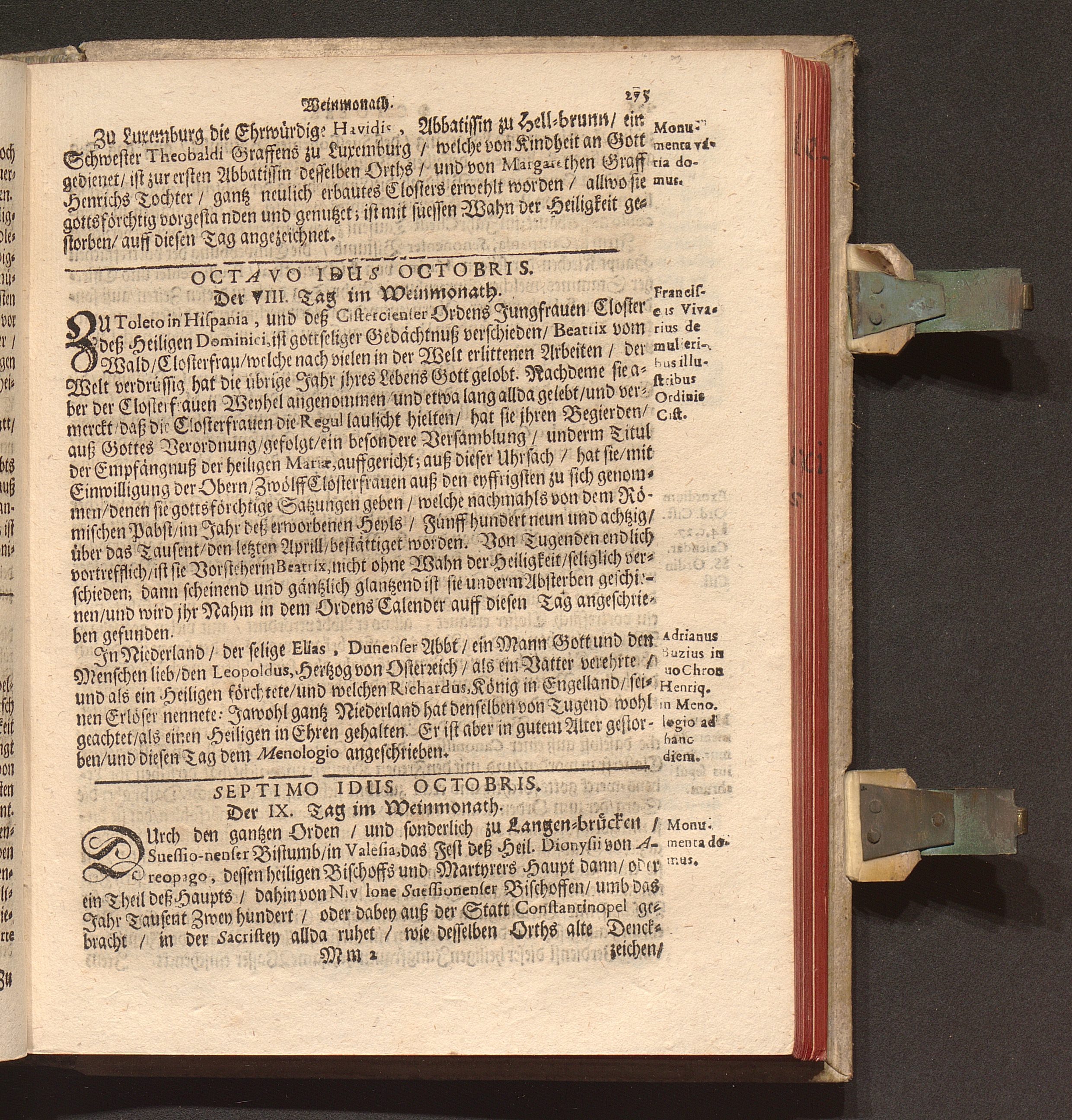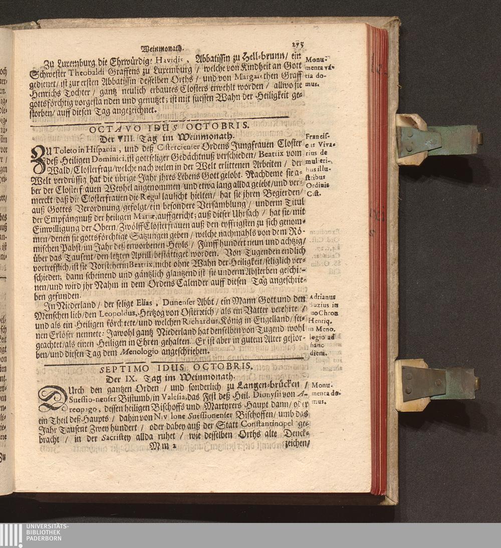 Kurtze Lebens Verfassung Der Heiligen und Seeligen Auch Berühmbten Männer Deß Heiligen Cistercienser Ordens / Von dem Hochwürdig- und Hochgelehrten Herren Claudio Chalemot, der heiligen Schrifft Pariser Facultät Doctorn, und deß Closters der Seeligen Mariæ de Columba Strengerer Observantz/ und gemelten Ordens Abbten/ in Lateinischer Sprach beschrieben. Jetzo aber ... gantz fleissig in die Teutsche Sprach übersetzt Durch R. P. F. Nivardum Henrici, Deß im Rhein-gau gelegenen Cistercienser Ordens Closters Eberbachs Professum ...