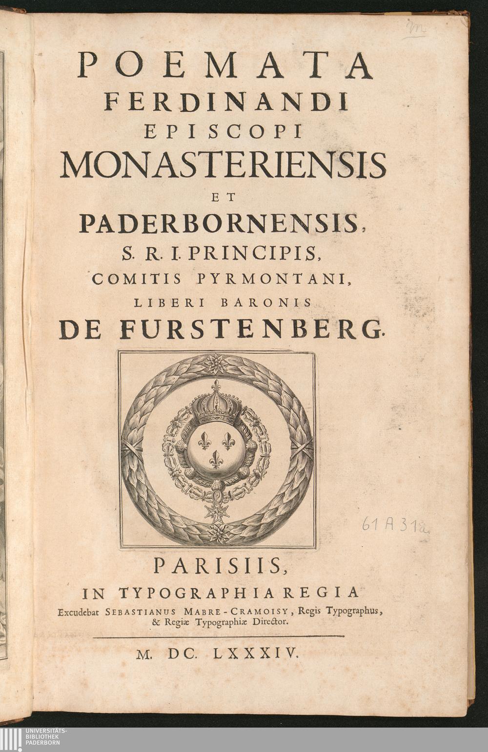 Poemata Ferdinandi Episcopi Monasteriensis Et Paderbornensis, S. R. I. Principis, Comitis Pyrmontani, Liberi Baronis De Furstenberg