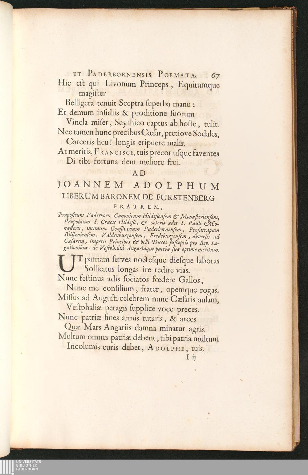 Ad Joannem Adolphum Liberum Baronem de Furstenberg Fratrem, ...