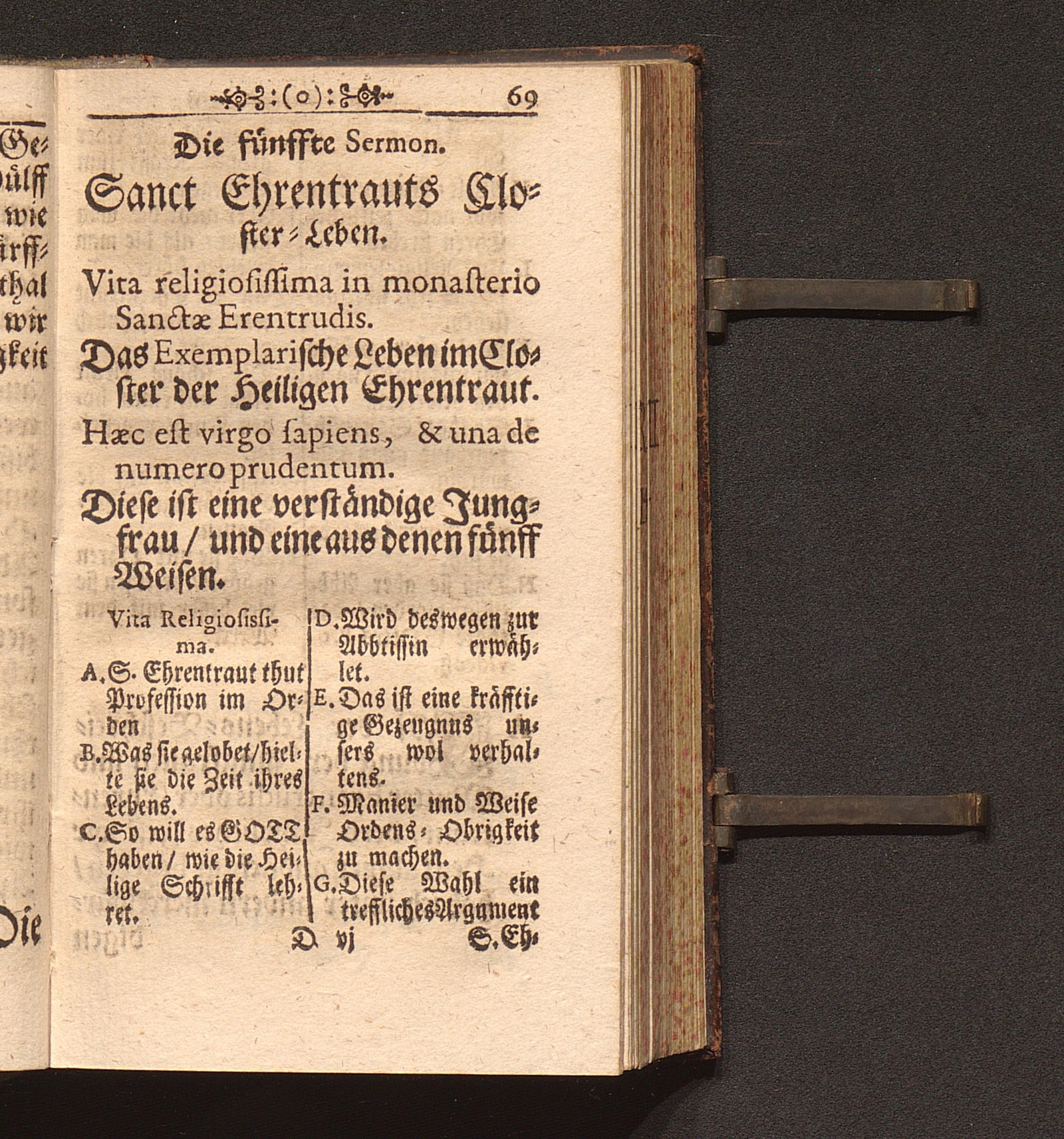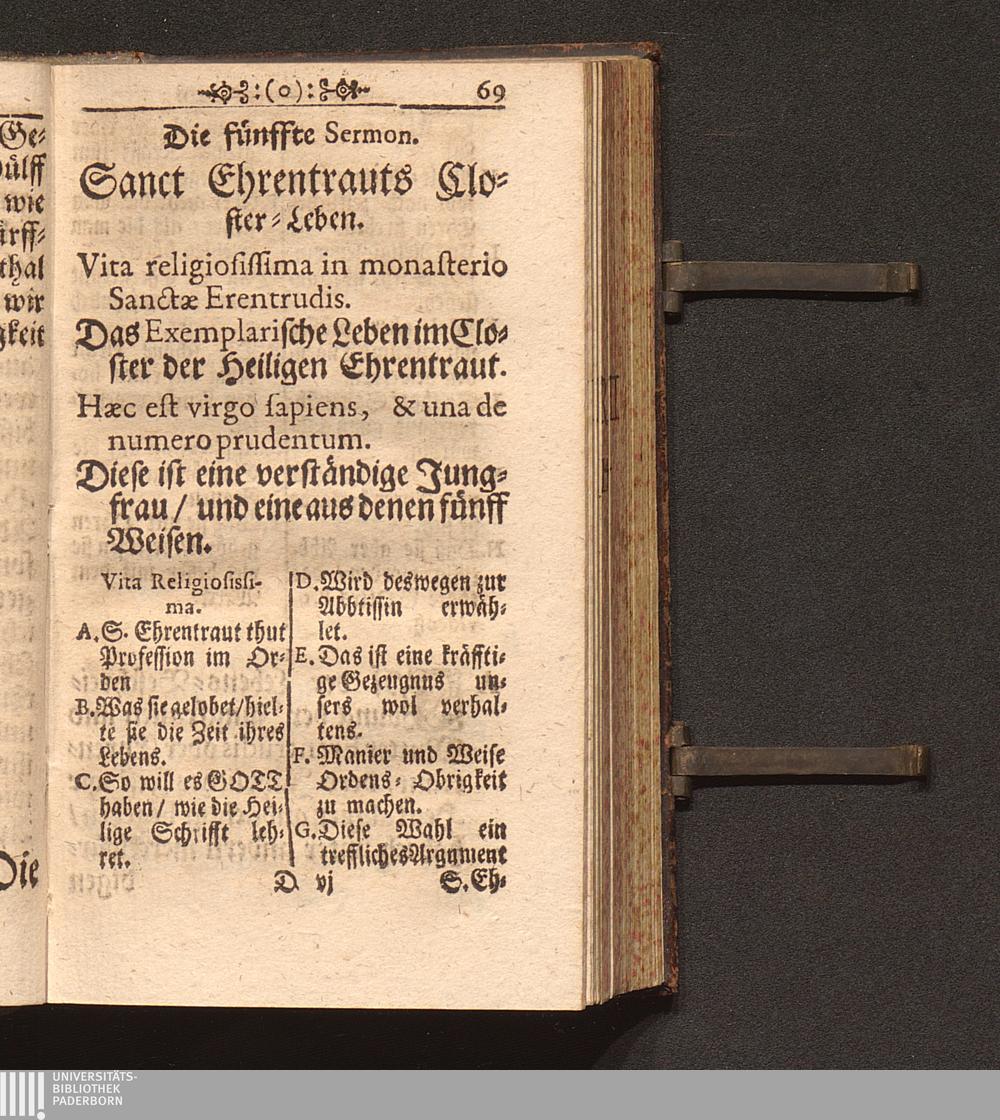Tugend-Spiegel Aller Zucht-liebenden Closter-Jungfrauen. Das ist: Schönes Tractätlein von Zwantzig halbstündigen Sermonen über das Leben der H. Jungfrauen und Mutter/ Ehrentraut/ Sanct Ruperti leiblichen Schwester/ weiland ersten Abbtissin/ Vorsteherin und Regentin des Käyserlichen Adelichen Stiffts und berühmten Frauen-Closters/ Ordinis S. Benedicti allhier zu Saltzburg/ auf dem also genandten Nunberg / Aus bewehrten Schrifften fleissig zusammen getragen/ Durch P. F. Procopium von Templin/ Capucciner Priester und Prediger