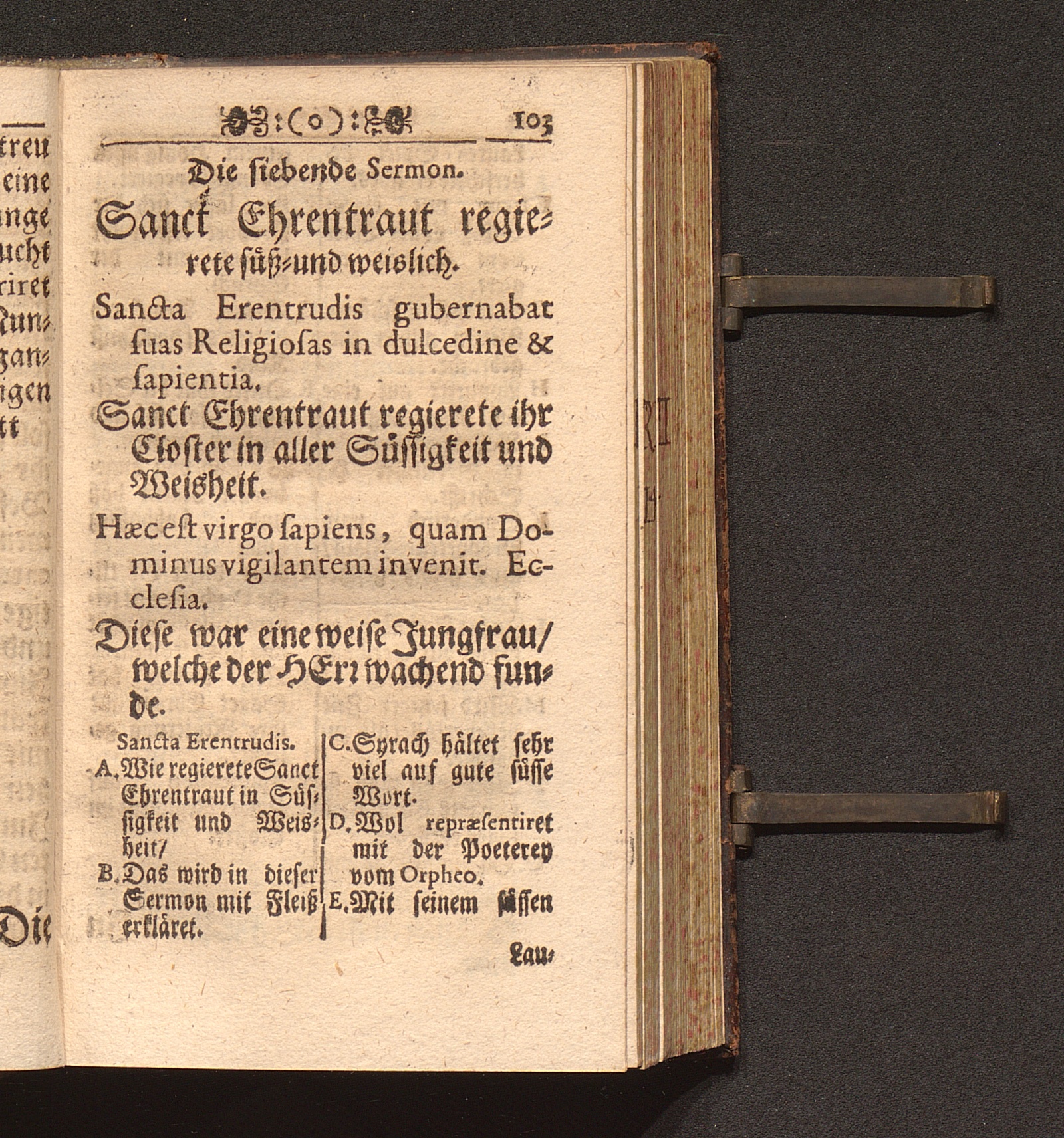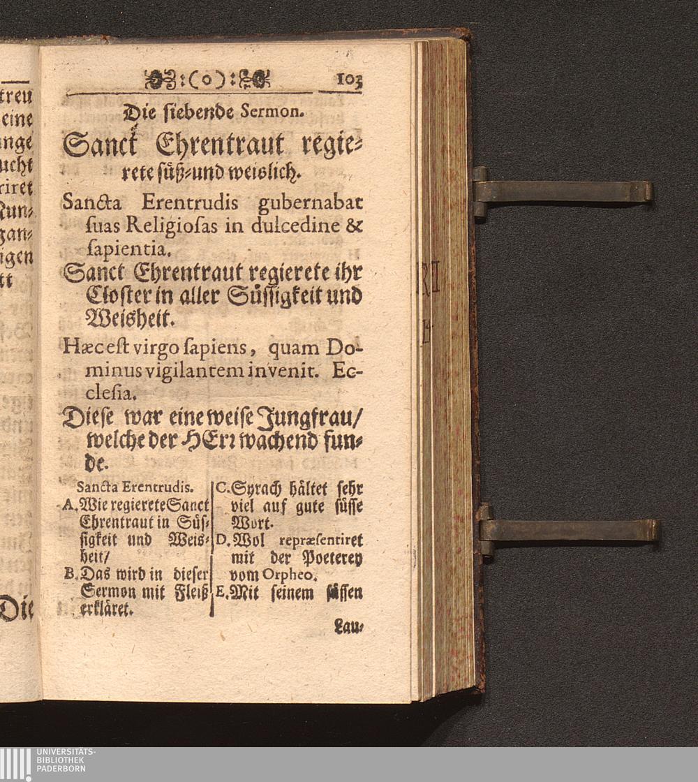 Tugend-Spiegel Aller Zucht-liebenden Closter-Jungfrauen. Das ist: Schönes Tractätlein von Zwantzig halbstündigen Sermonen über das Leben der H. Jungfrauen und Mutter/ Ehrentraut/ Sanct Ruperti leiblichen Schwester/ weiland ersten Abbtissin/ Vorsteherin und Regentin des Käyserlichen Adelichen Stiffts und berühmten Frauen-Closters/ Ordinis S. Benedicti allhier zu Saltzburg/ auf dem also genandten Nunberg / Aus bewehrten Schrifften fleissig zusammen getragen/ Durch P. F. Procopium von Templin/ Capucciner Priester und Prediger