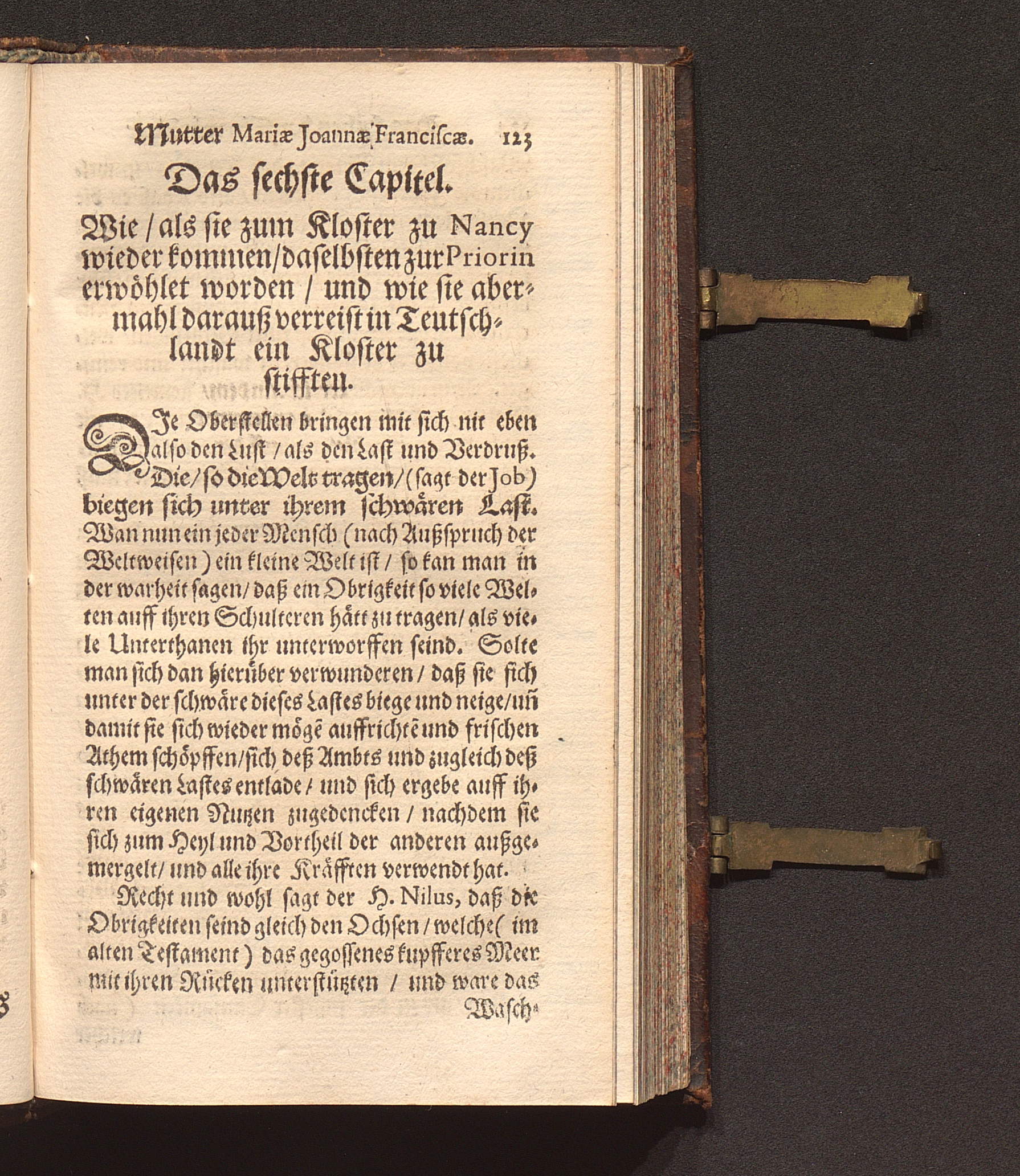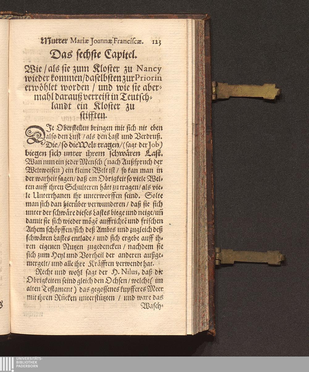 Eigentliche Abbildung Einer recht vollkommener Obrigkeit : Historisch- und Sittlicher Weiß entworffen Jn dem geführten Leben der Ehrwürdiger Muttern/ Mariæ Ioannæ Franciscæ, Erster Priorinnen Deren Annunciaten Cœlestineren zu Düsseldorff / Von ... P. Mansueto Novocastrensi, deß Ordens deß H. Vatters Francisci, Capuciner genant/ Prediger/ auff dem Papier in der Frantzösischer Sprach beschrieben/ in die Teutsche aber übersetzt und zum Truck verfertigt/ Durch R. P. Leonardum. von Aachen/ selbigen Ordens Prediger